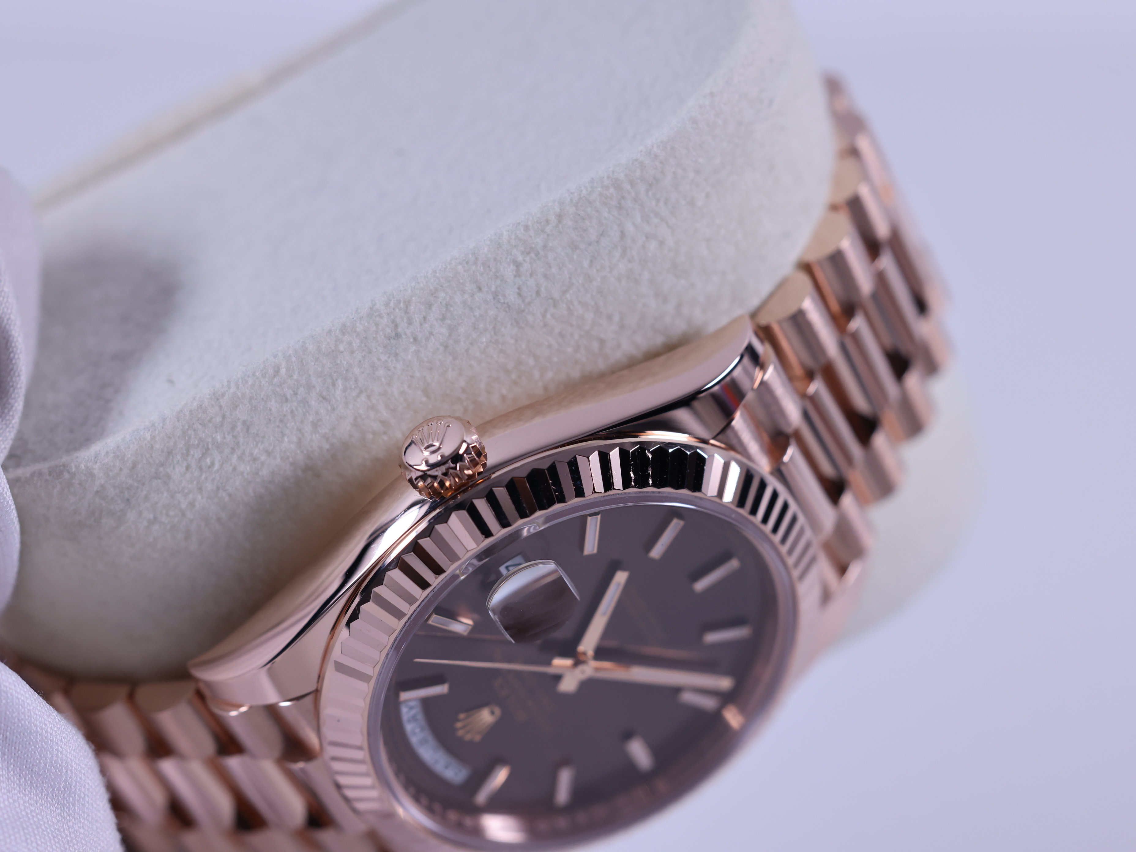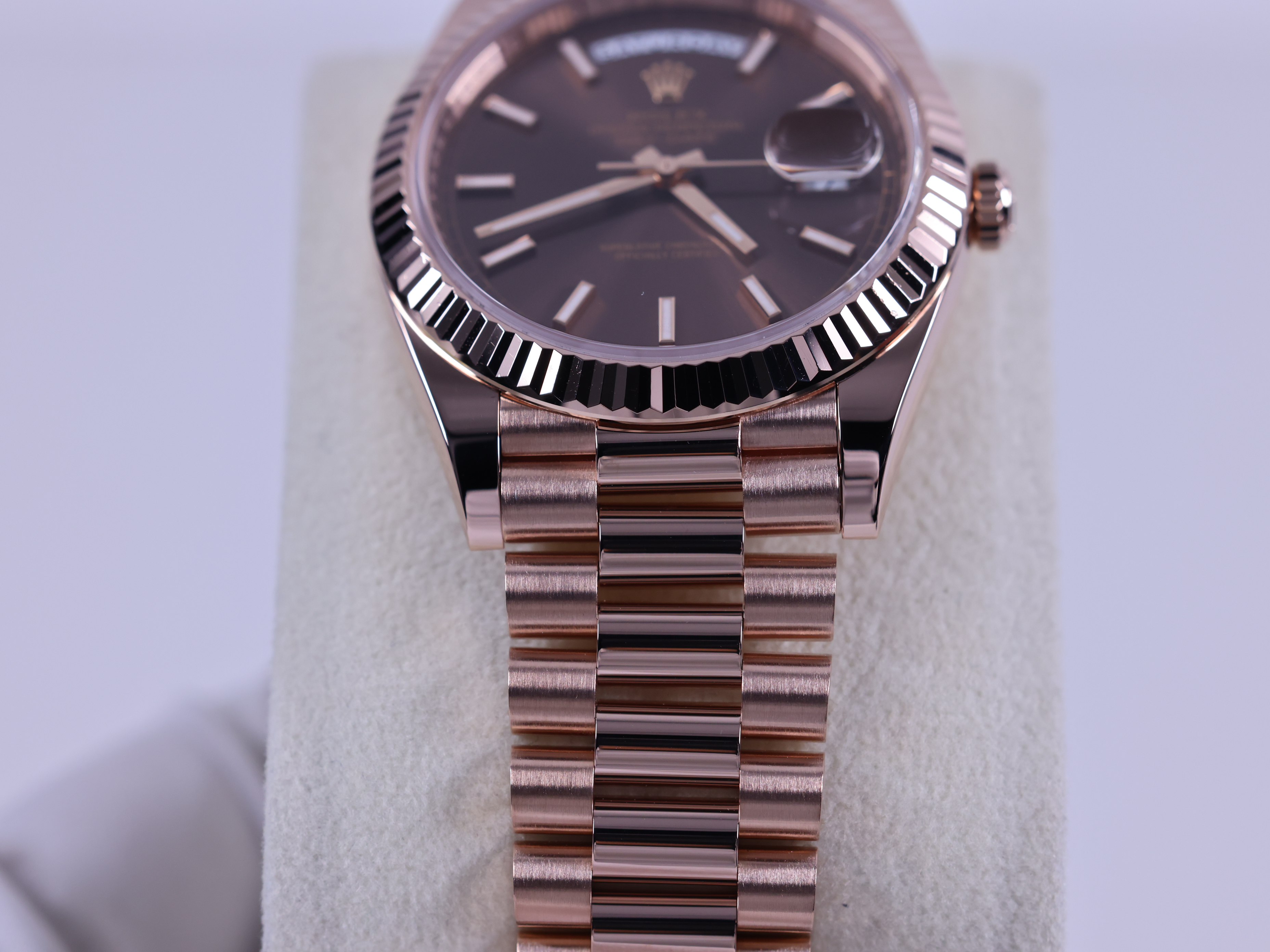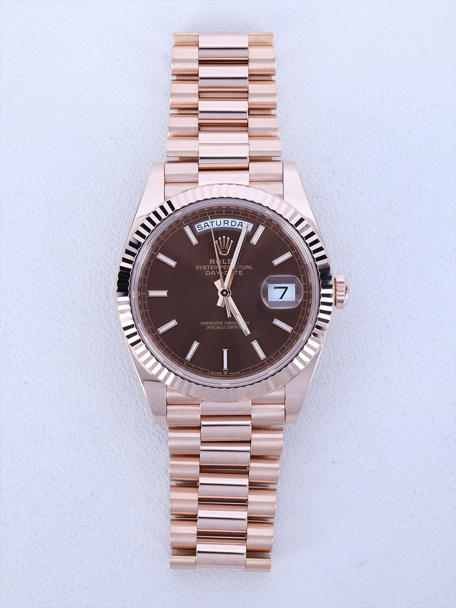 Day-Date,M228235-0053,초콜렛,에버로즈골드,프레지던트브레이슬릿,사파이어크리스탈,40mm,Rolex,에버로즈 골드,프레지던트 브레이슬릿,사파이어 크리스탈,Rose gold,Hidden folding clasp,Day,date / baton indices,데이데이트,롤렉스,Everose gold,Day, date / baton indices,.브라운,바,폴딩 클라스프,데이-데이트,약 20mm,원형,클래식,남성용