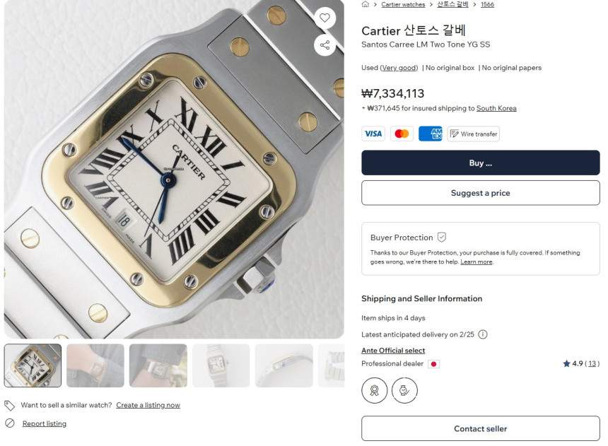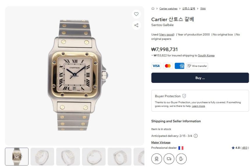 현재 해외에서 동일한 골드 색상의 다이얼을 지닌 산토스 모델이 원화 약 700~800만원대 가격형성을 이루며 판매하고 있으며, 상태는 제가 판매하는 시계 만큼 좋지 못합니다. (★사진참조)