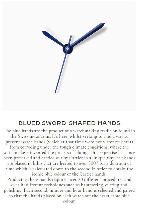 이는 까르띠에의 상징적인 시계 핸즈 기술력으로, 오랫동안 뜨거운 화로에서 불로 구워서 만든 장인 정신이 깃든 블루핸즈 기술입니다.