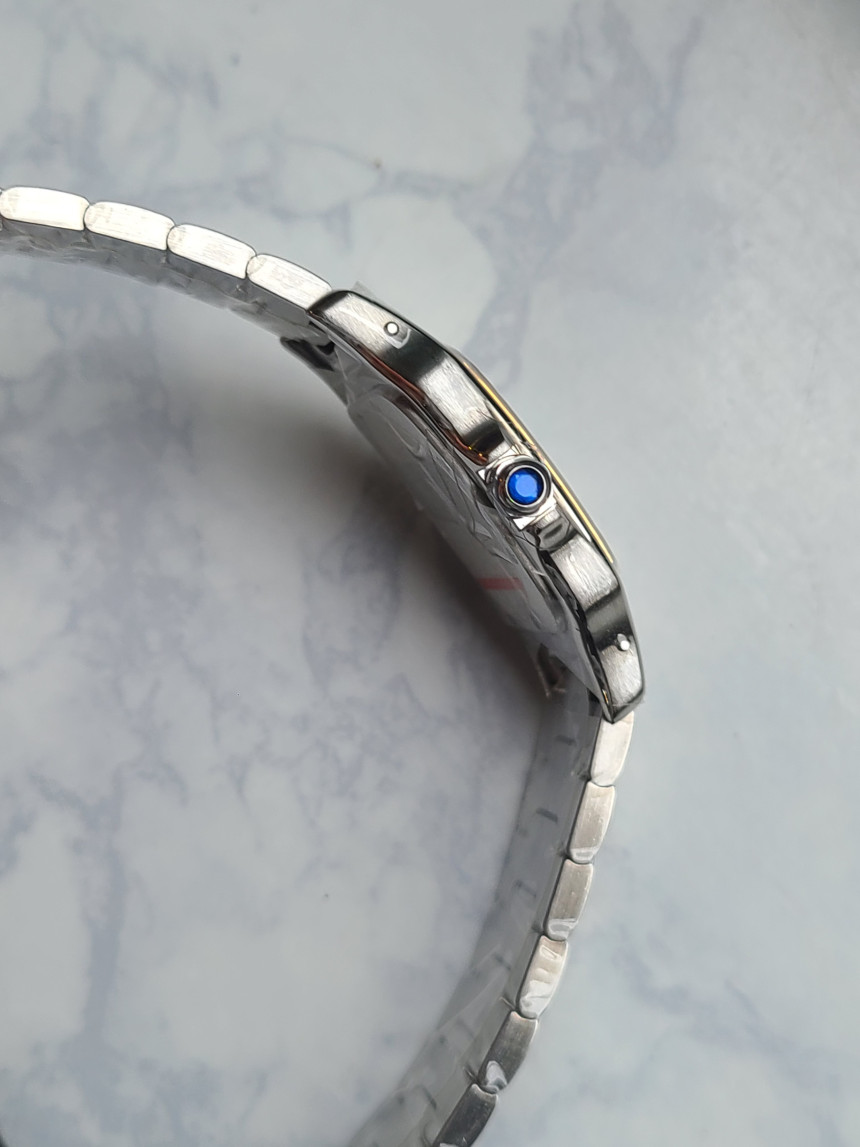 까르띠에 상징과도 같은 푸른 색상의 카보숑 (Cabochon) 블루 사파이어 보석 크라운이 들어가 있으며, 역시 귀금속 보석의 전문 분야답게 고급스러운 푸른색의 크라운 용두가 매우 시계를 한층 더 높여줍니다.