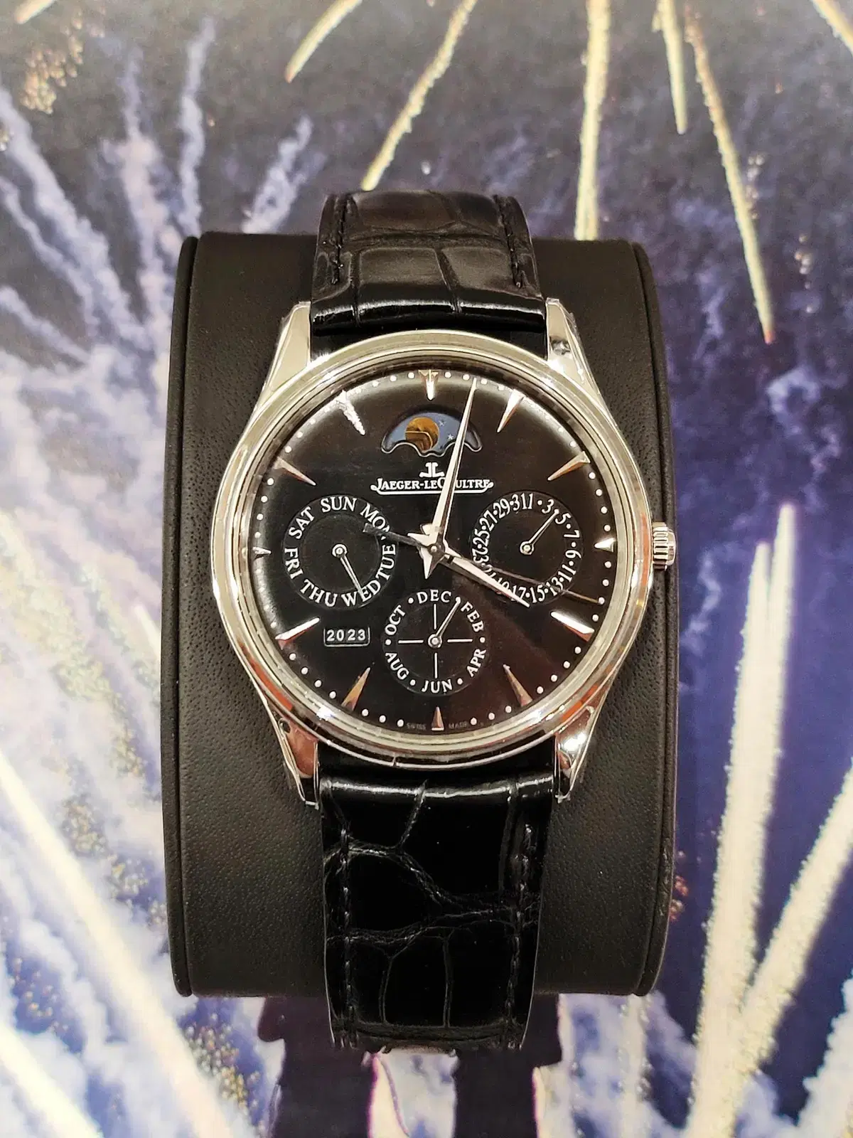 JLC Jaeger Lecoultre Master Ultra Thin Perpetual Calendar Steel Black Steel Q1308470 1308470,JLC 예거 르쿨트르 마울씬 마스터 울트라 씬 울트라씬 퍼페추얼 퍼페츄얼 캘린더 블랙 스틸 블랙 Q1308470 1308470,블랙,Master Ultra Thin Perpetual Calendar,마스터 울트라 씬 퍼페추얼 캘린더,Master Ultra Thin,Jaeger-LeCoultre,예거 르쿨트르,스테인리스 스틸,가죽 스트랩,39mm,셀프 와인딩,Stainless steel,Deployant folding clasp with anchor buckle,Day,date,month,year / applied dagger indices,Day, date, month, year / applied dagger indices,.블랙,바,디플로이언트,퍼페추얼 캘린더, 투명 케이스백,21mm,원형,드레스, 클래식,남녀공용