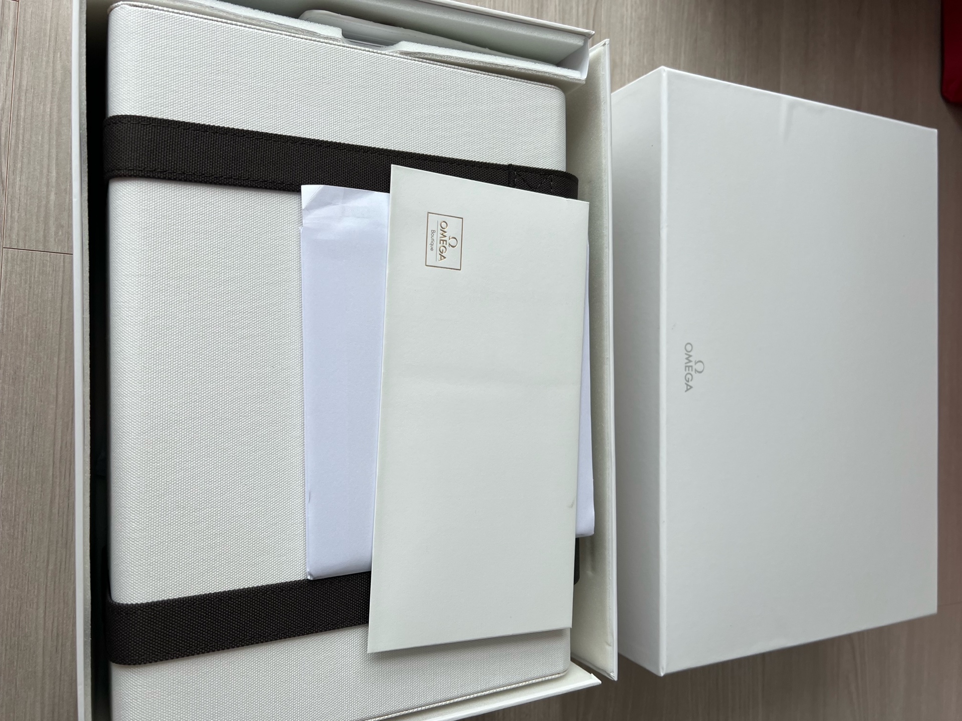 오메가 샵에서 구매할 때 있는 모든 구성품 포함이고, 보관만 했습니다. (미착용 및 케이스에 보관)
