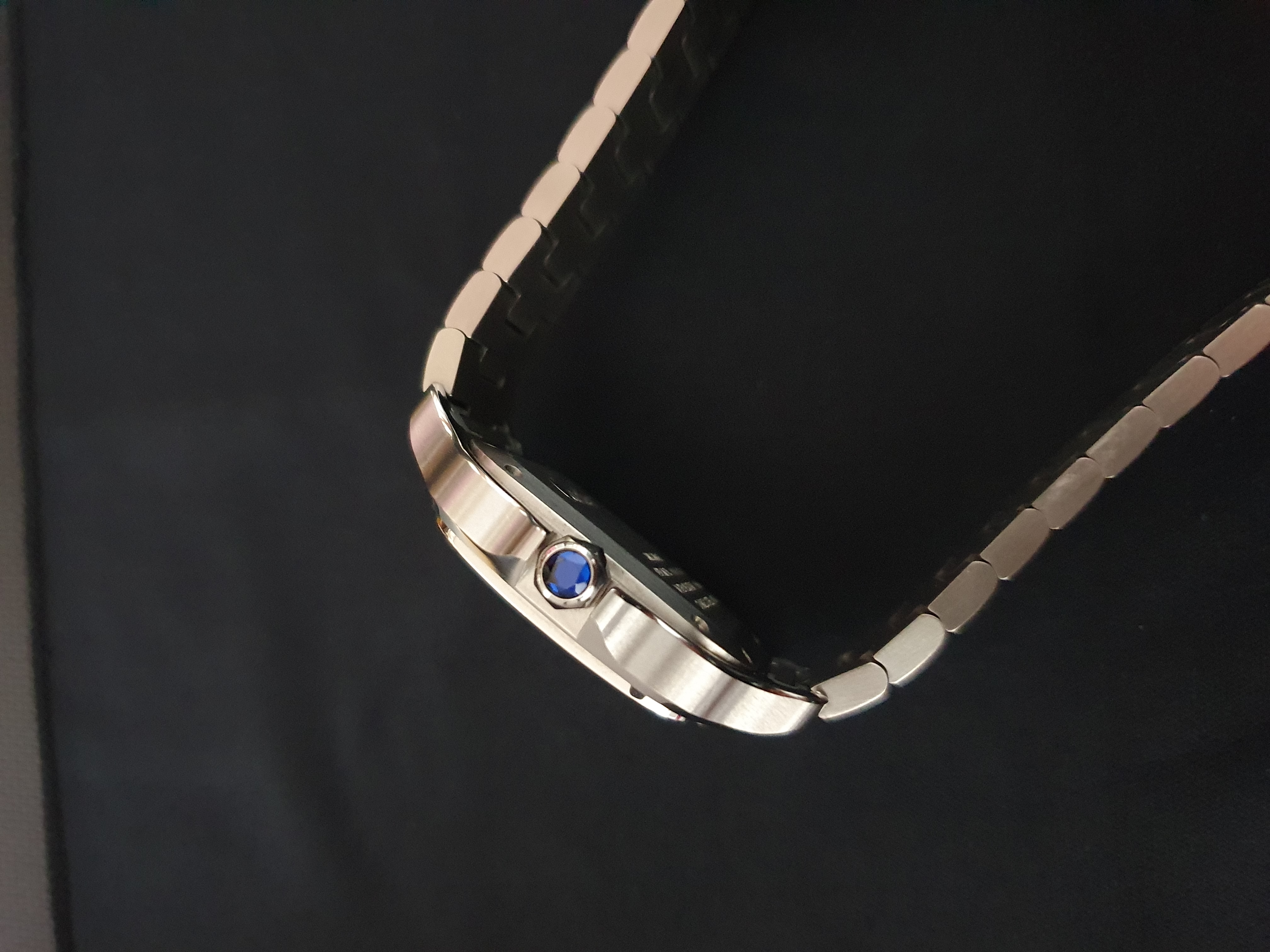 WSSA0063,Cartier Santos Medium MM Blue Steel Automatic Selfwinding WSSA0063,까르띠에 카르띠에 산토스 블루 미디엄 미디움 블루 스틸 오토매틱 셀프와인딩 WSSA0063,블루,사파이어 크리스탈,셀프와인딩,Stainless steel + spinel cabochon,Butterfly clasp,Date / roman numeral indices,Santos MM,Santos de Cartier,Cartier,까르띠에,까르띠에 산토스 MM 미디엄 미디움 블루,산토스 MM,셀프 와인딩,Santos de Cartier MM,Stainless steel + spinel,.블루,로만,폴딩 클라스프,직사각형,클래식,남녀공용