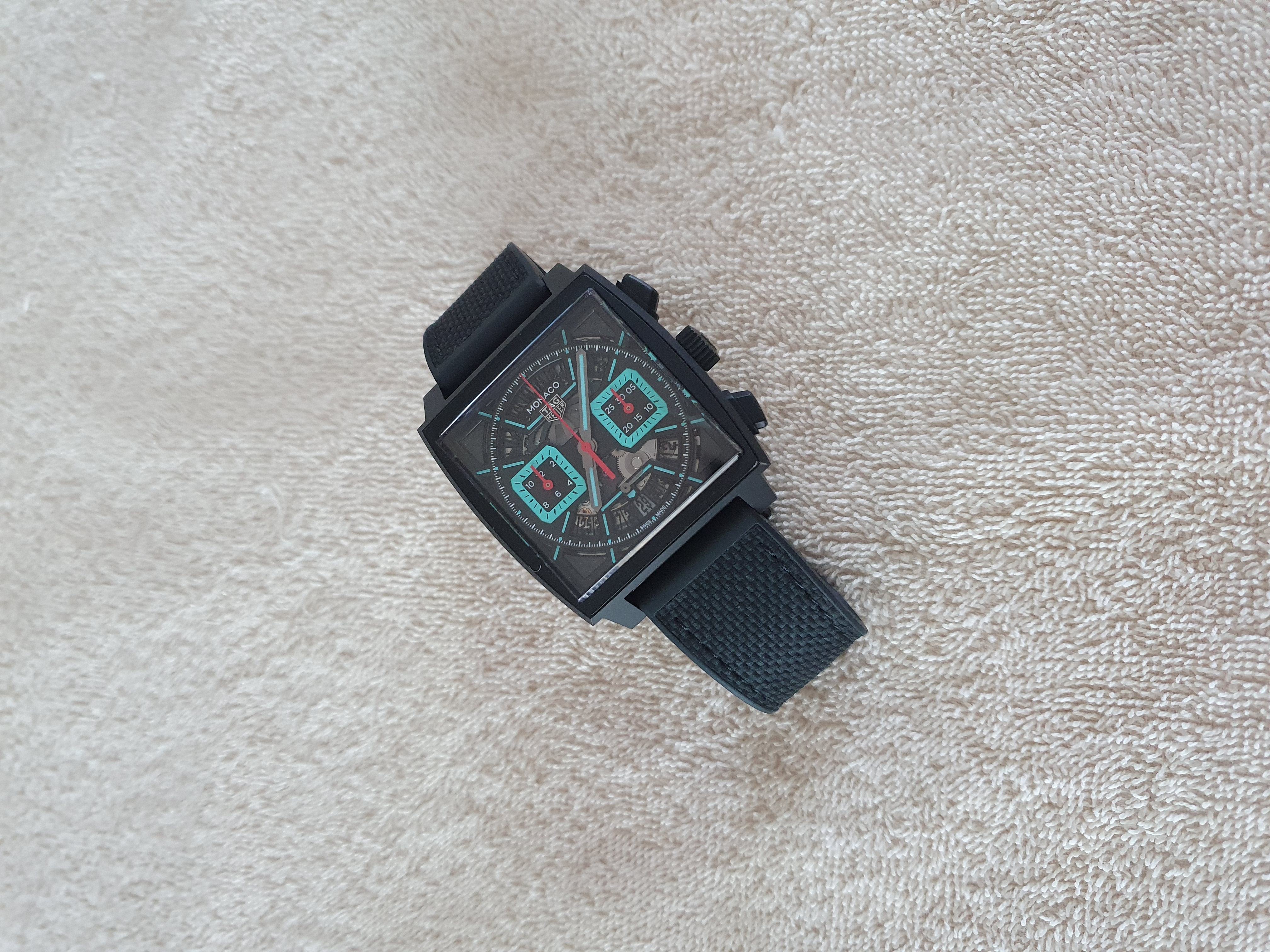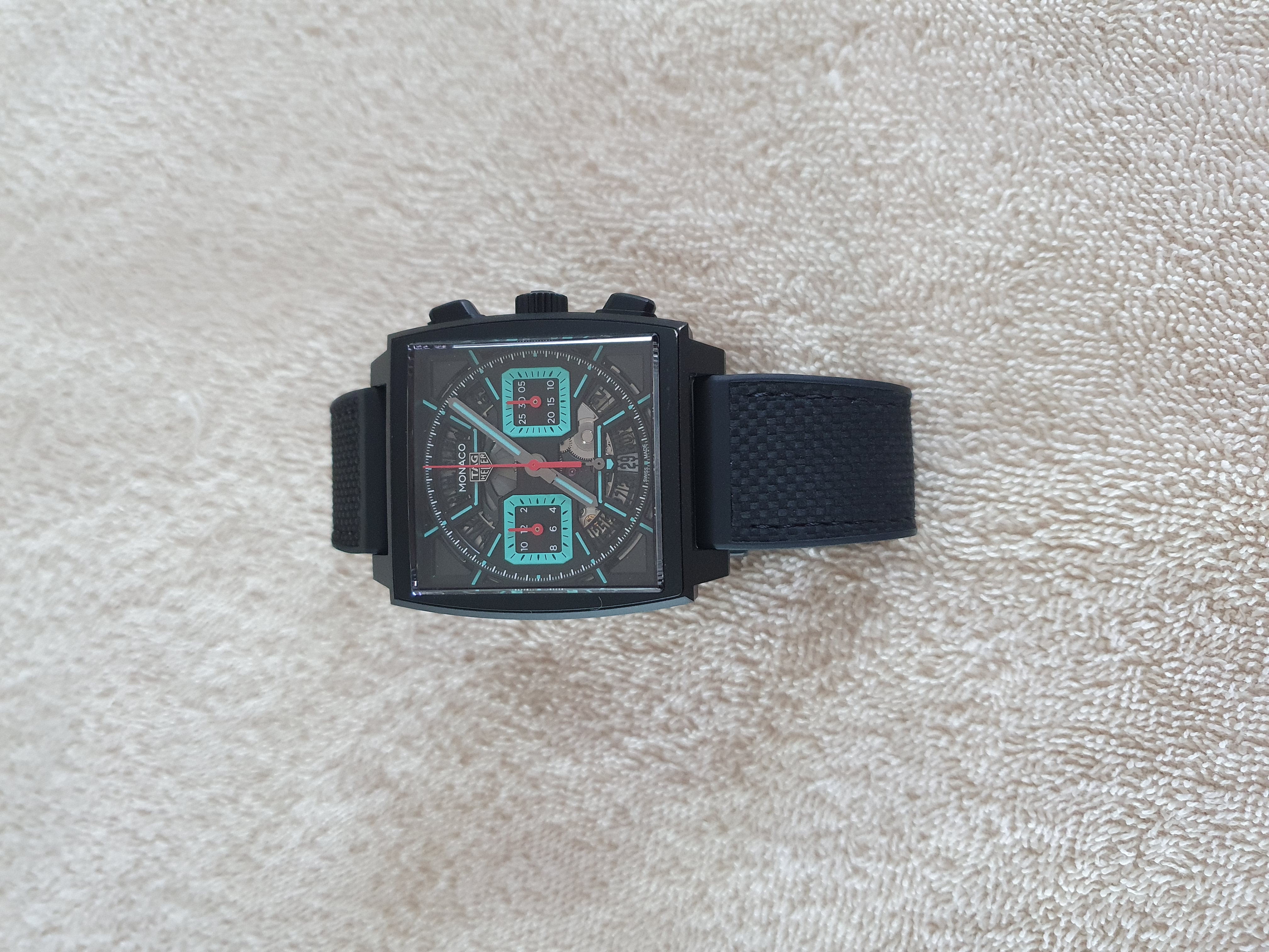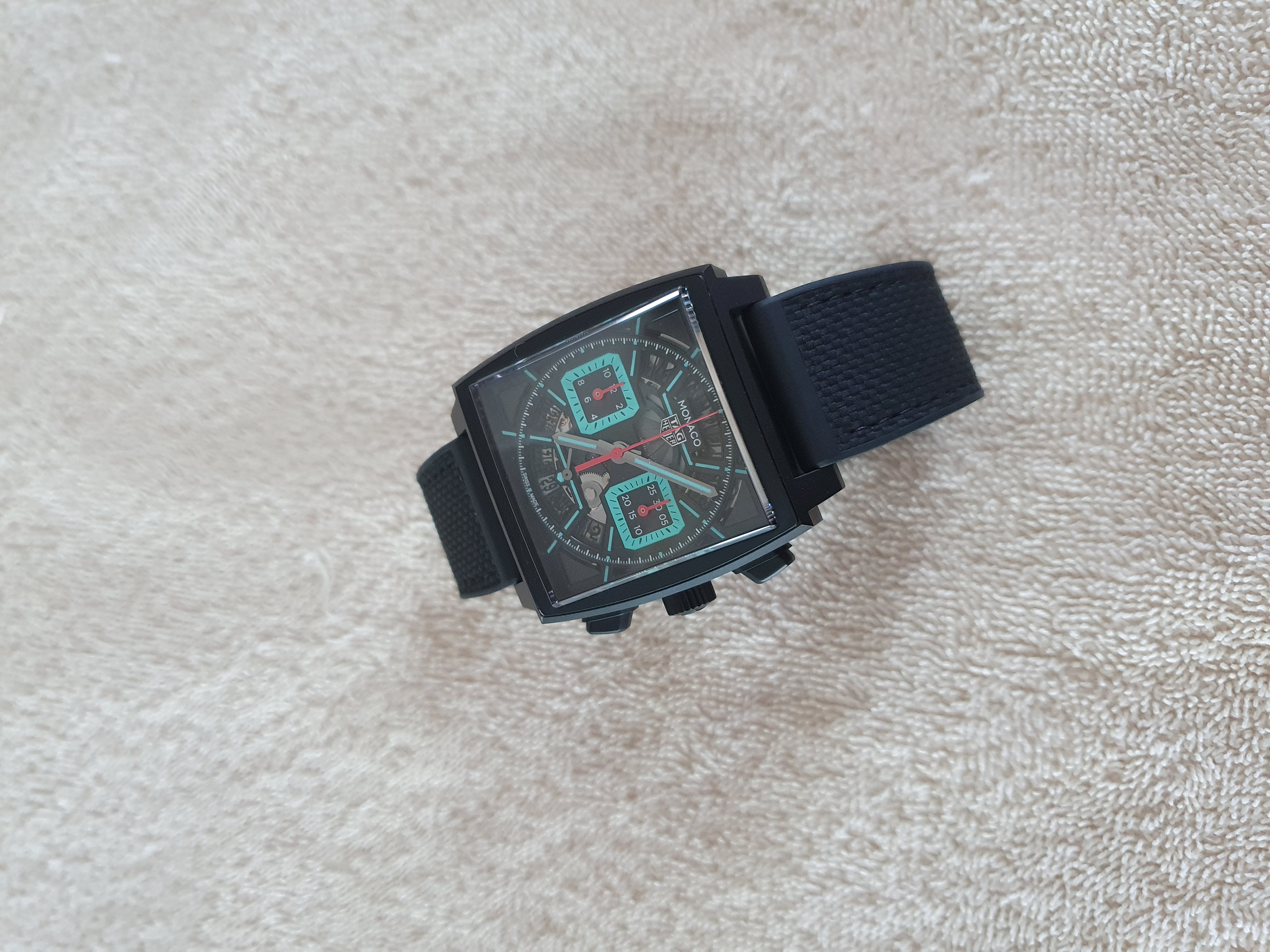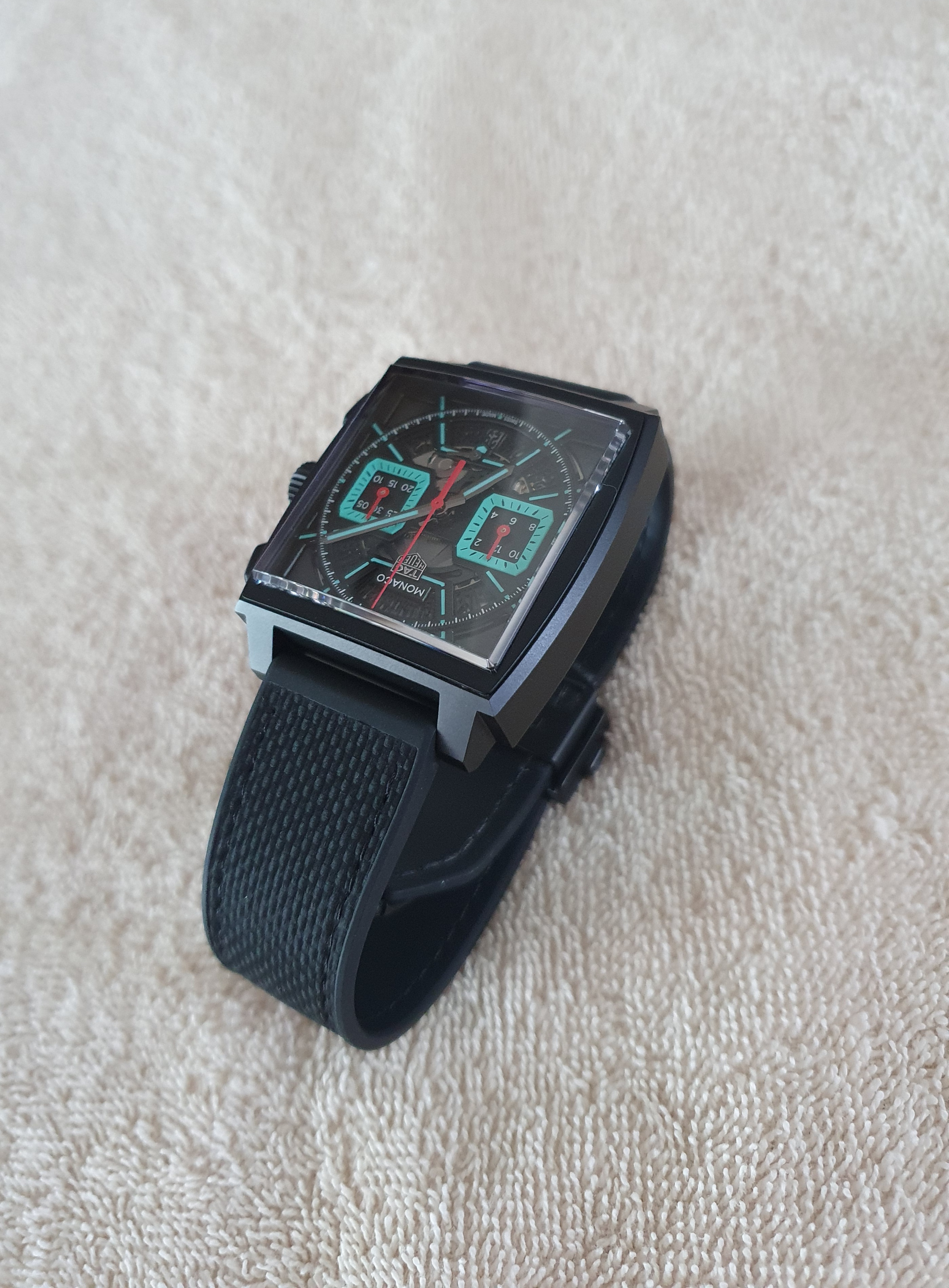 모나코 크로노그래프 블랙 검판 DLC 티타늄 바 레이싱 남녀공용 셀프 와인딩 사각형 시스루백 씨스루백 투명 케이스백 크로노그래프 크로노 데이트,CBL2184.FT6236,블랙,스켈레톤,DLC 티타늄,러버 & 가죽,스트랩,셀프 와인딩,TH20-00,Switzerland,DLC Titanium,Folding clasp,Date,chronograph subdials,small seconds / baton indices,Monaco Chronograph,모나코 크로노그래프,Monaco,TAG Heuer,태그 호이어,Date, chronograph subdials, small seconds / baton indices