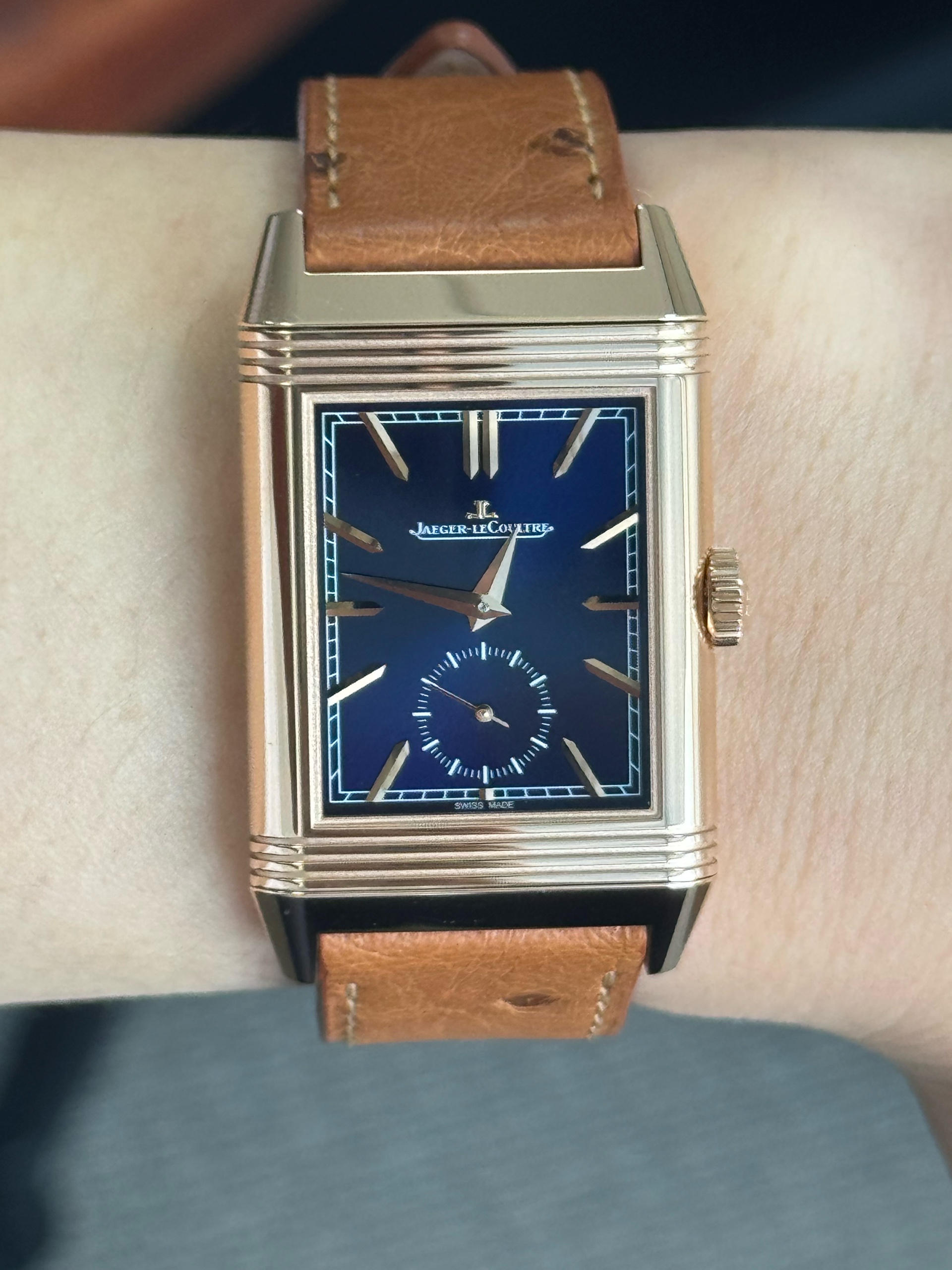 JLC 예거 르쿨트르 루꿀트르 리베르소 트리뷰트 듀오페이스 스몰 세컨즈 Q3982590 블루 실버 그레이 핑크 골드 스몰 세컨즈,Q3982590,앞면 : 블루 뒷면 : 실버 그레이,핑크 골드,가죽,스트랩,핸드 와인딩,예거 르쿨트르 칼리버 854,Switzerland,Pink gold,Pin buckle,Front: small seconds / obelisk indices. Back: 2nd time-zone,day/night indicator / baton indices,Reverso Tribute Duoface Small Seconds,리베르소 트리뷰트 듀오페이스 스몰 세컨즈,Reverso Tribute,Jaeger-LeCoultre,예거 르쿨트르,JLC Cal. 854,Front: small seconds / obelisk indices. Back: 2nd time-zone, day/night indicator / baton indices