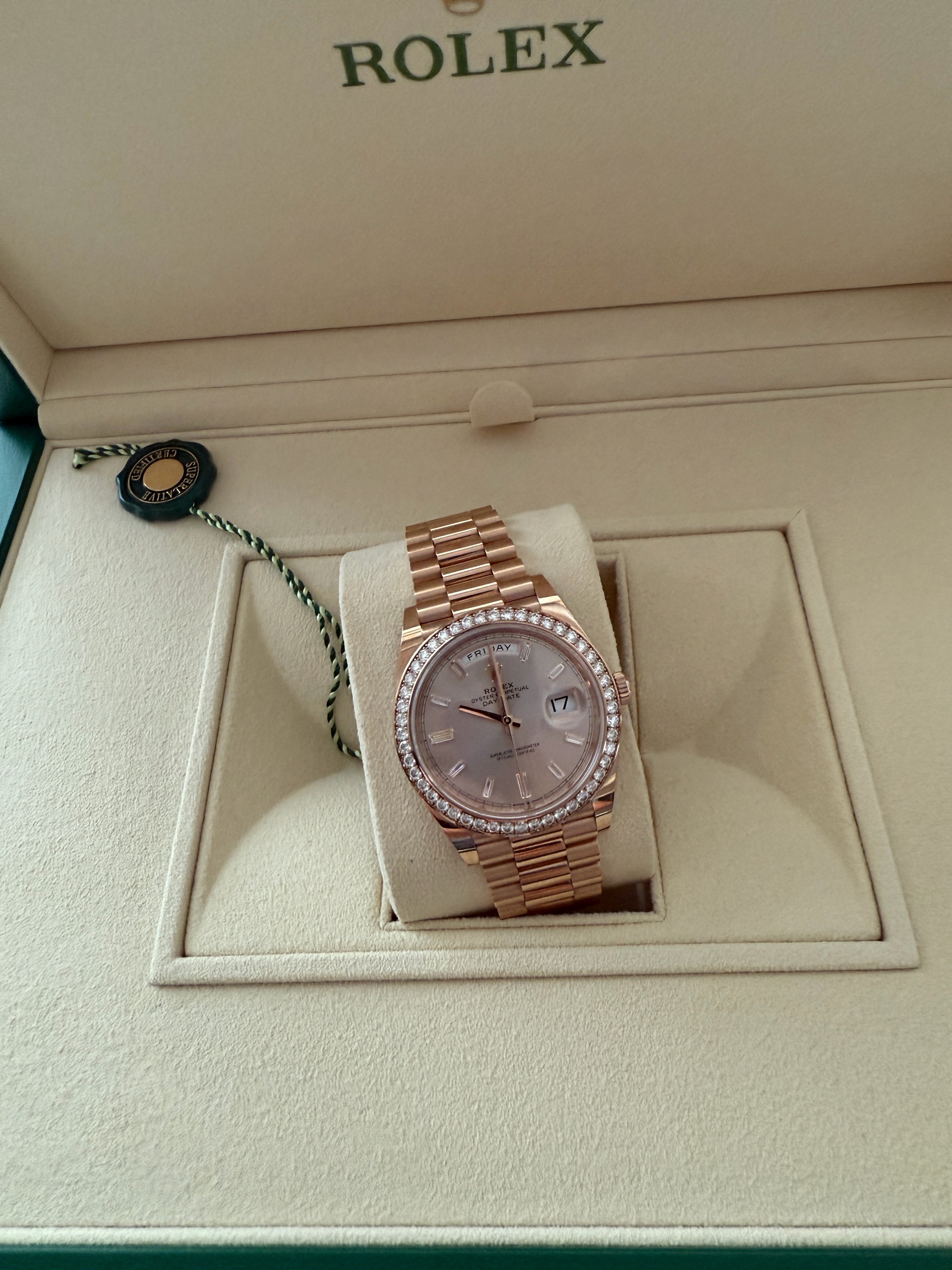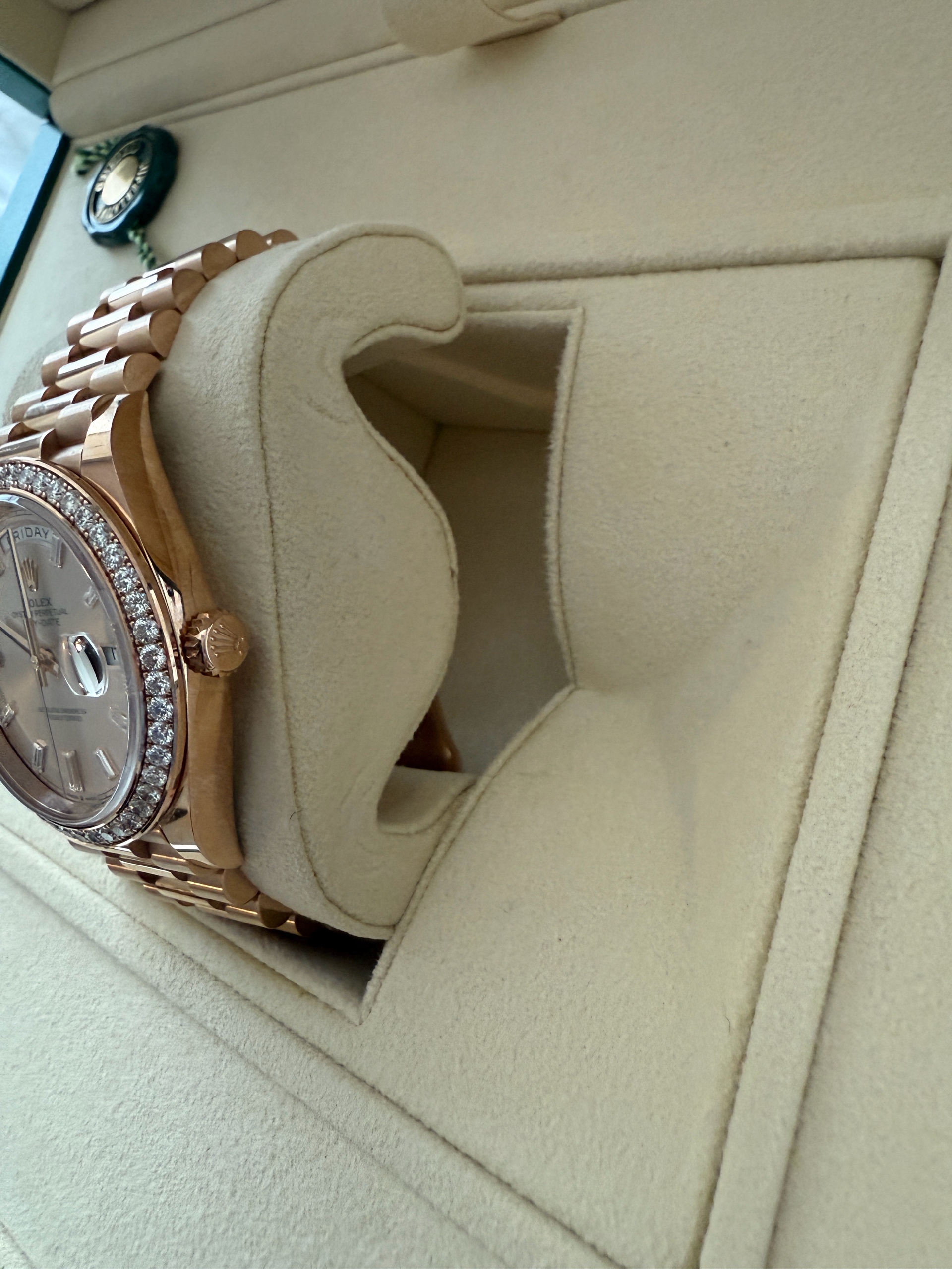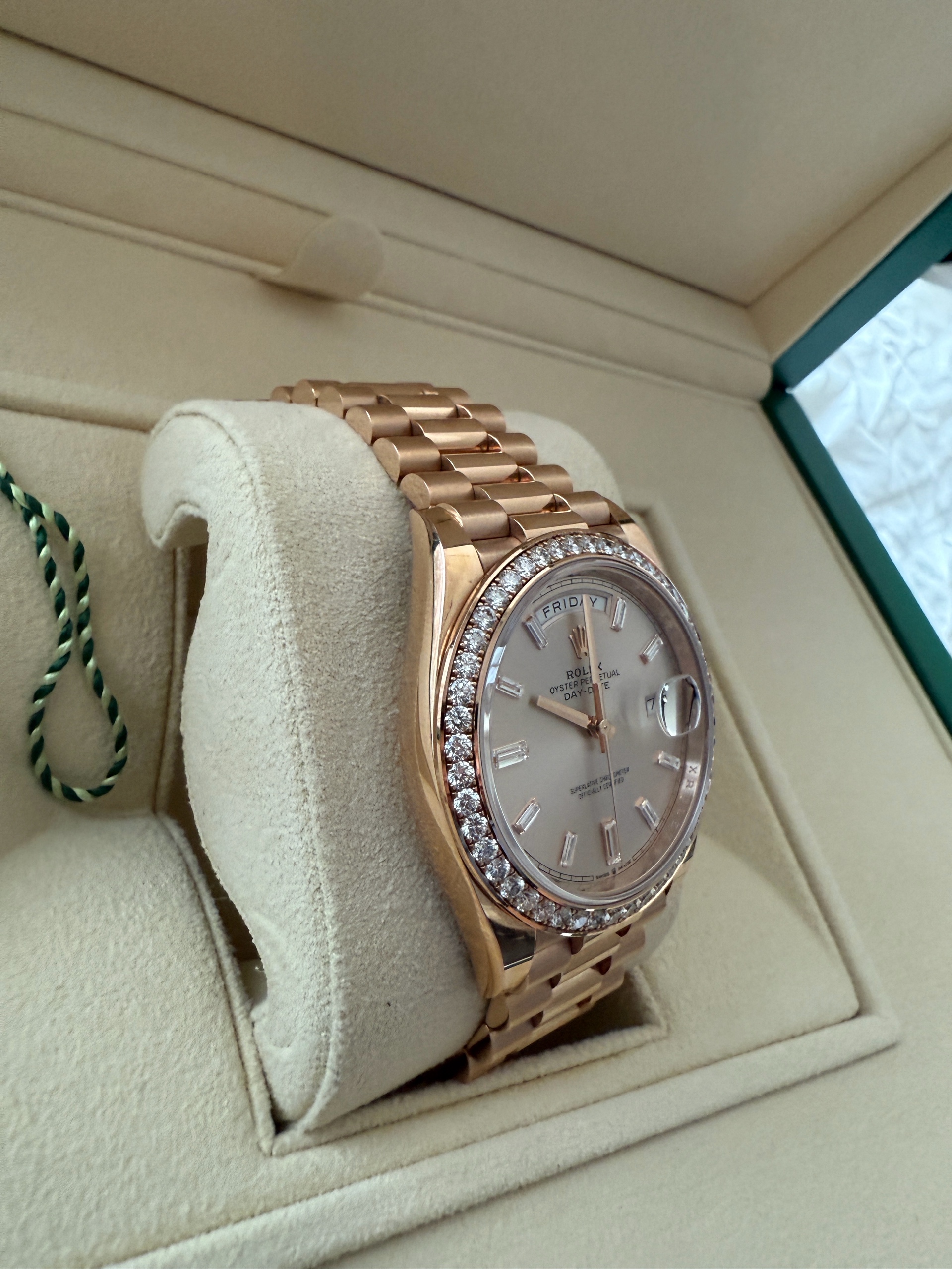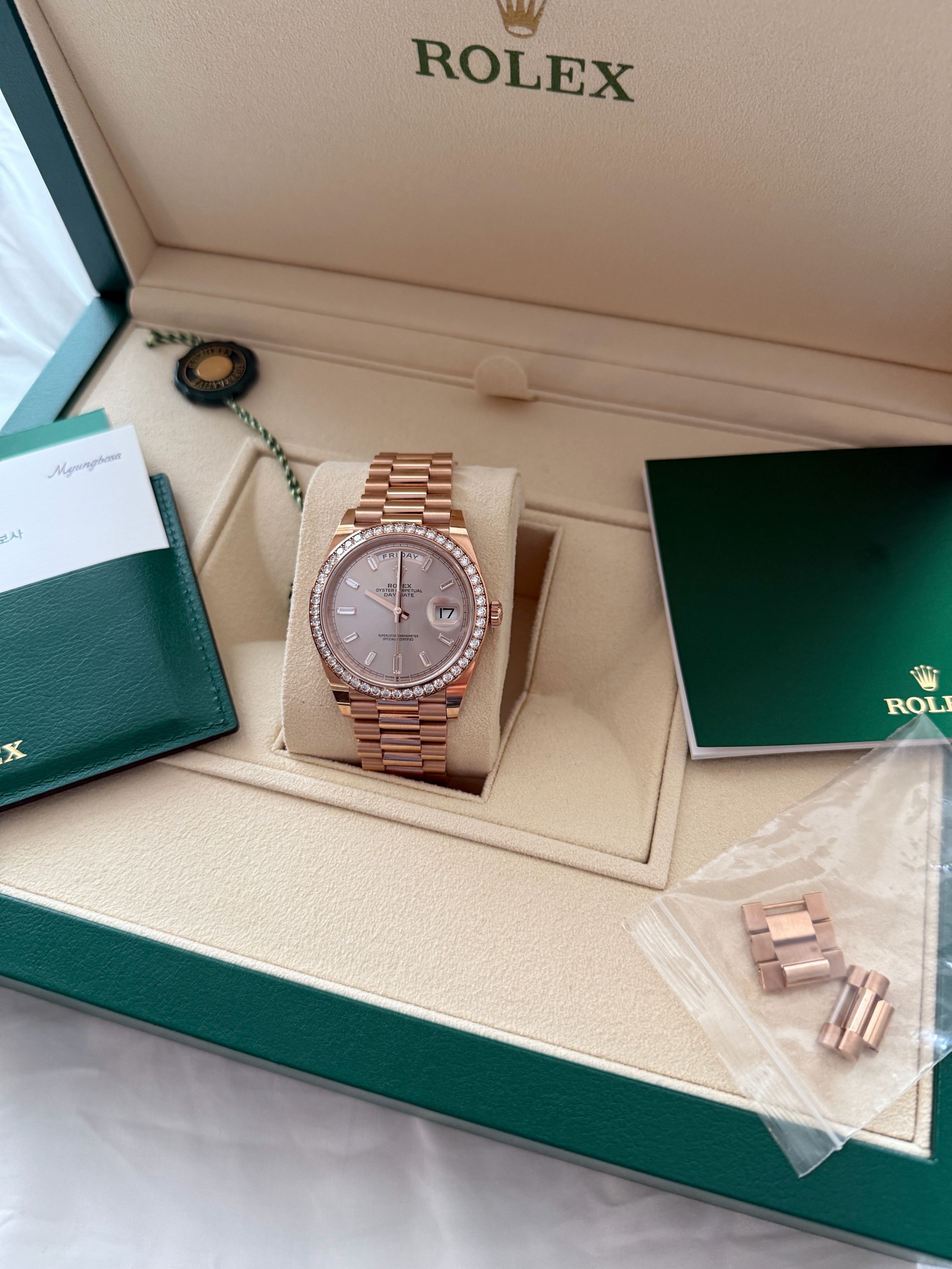 21년 10월 스탬핑 풀셋트 데이데이트 로즈골드 금통 썬더스트 바게트 인덱스, 베젤 다이아 모델입니다. 적절한 사용감 있는 중고입니다.