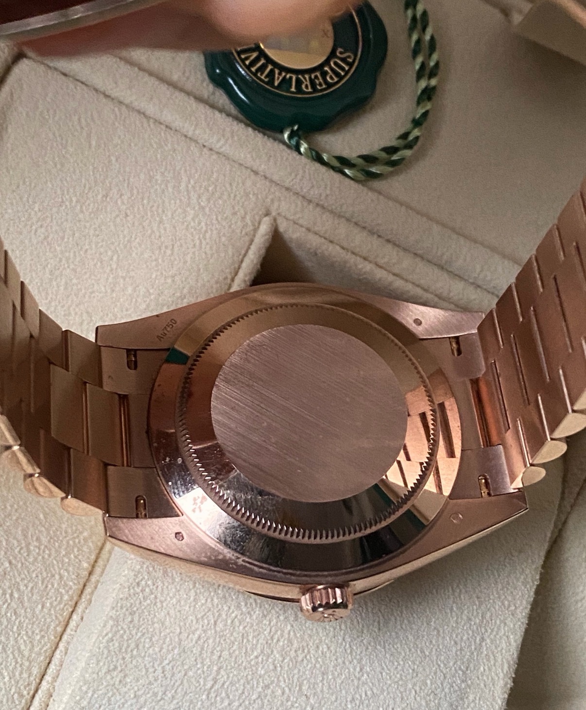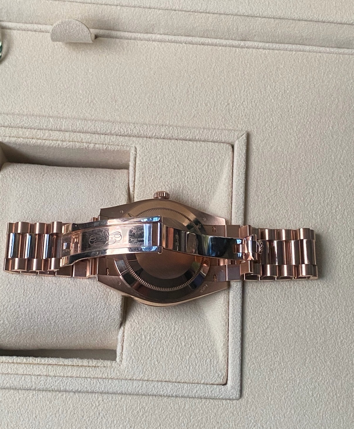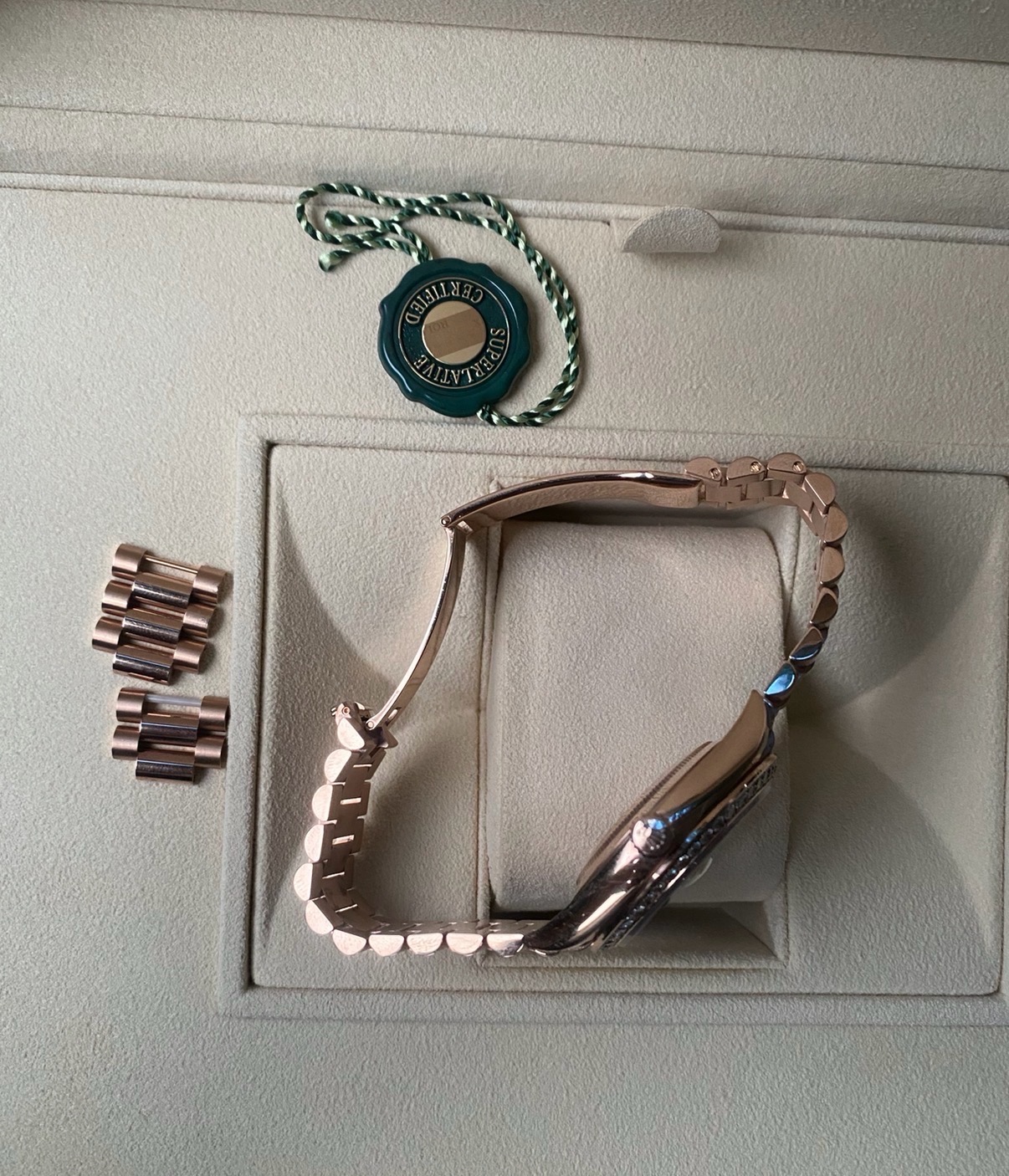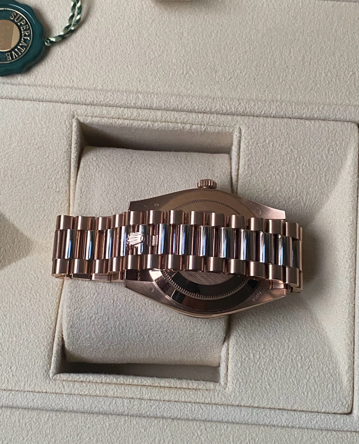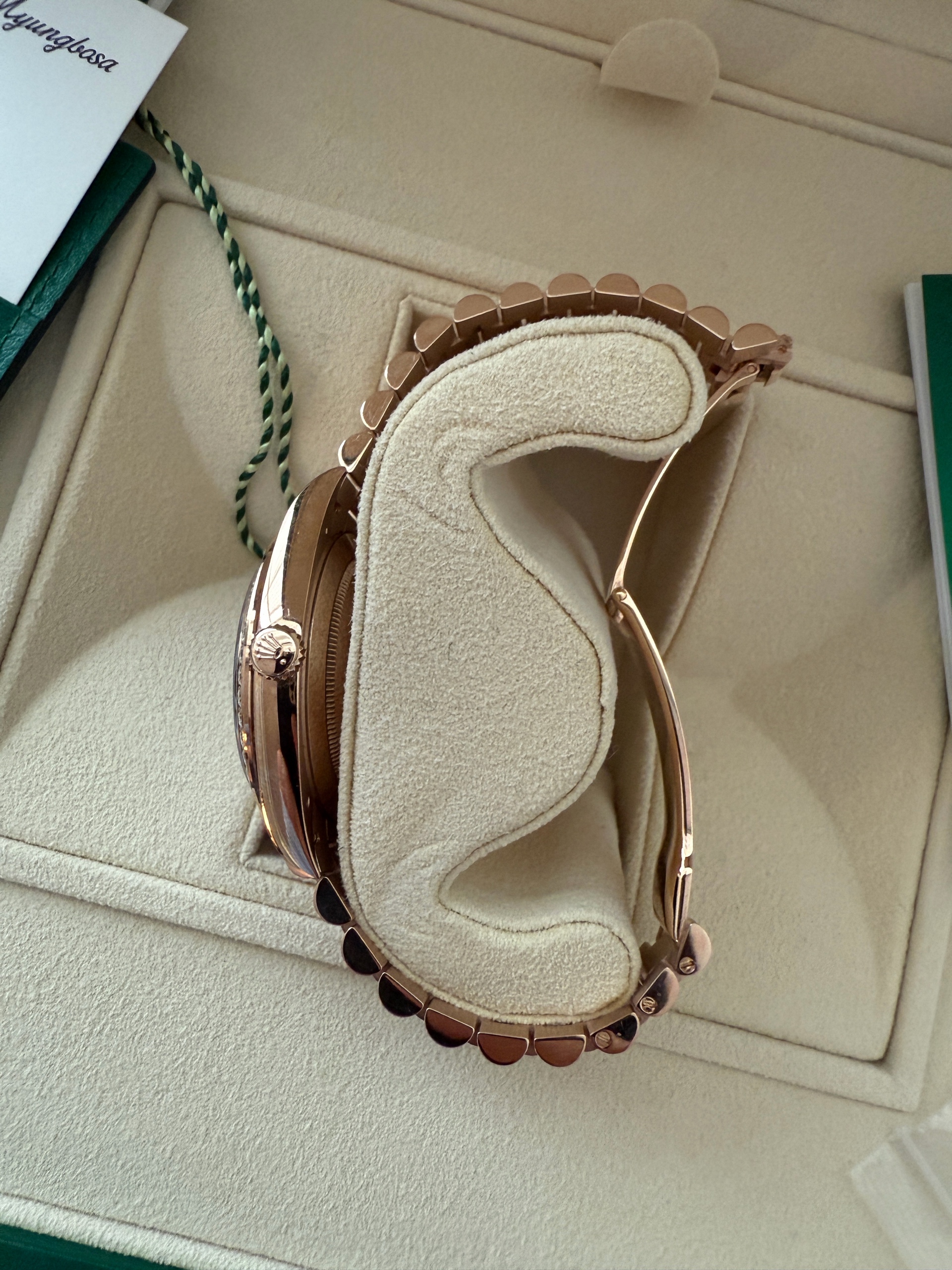 21년 10월 스탬핑 풀셋트 데이데이트 로즈골드 금통 썬더스트 바게트 인덱스, 베젤 다이아 모델입니다. 적절한 사용감 있는 중고입니다.