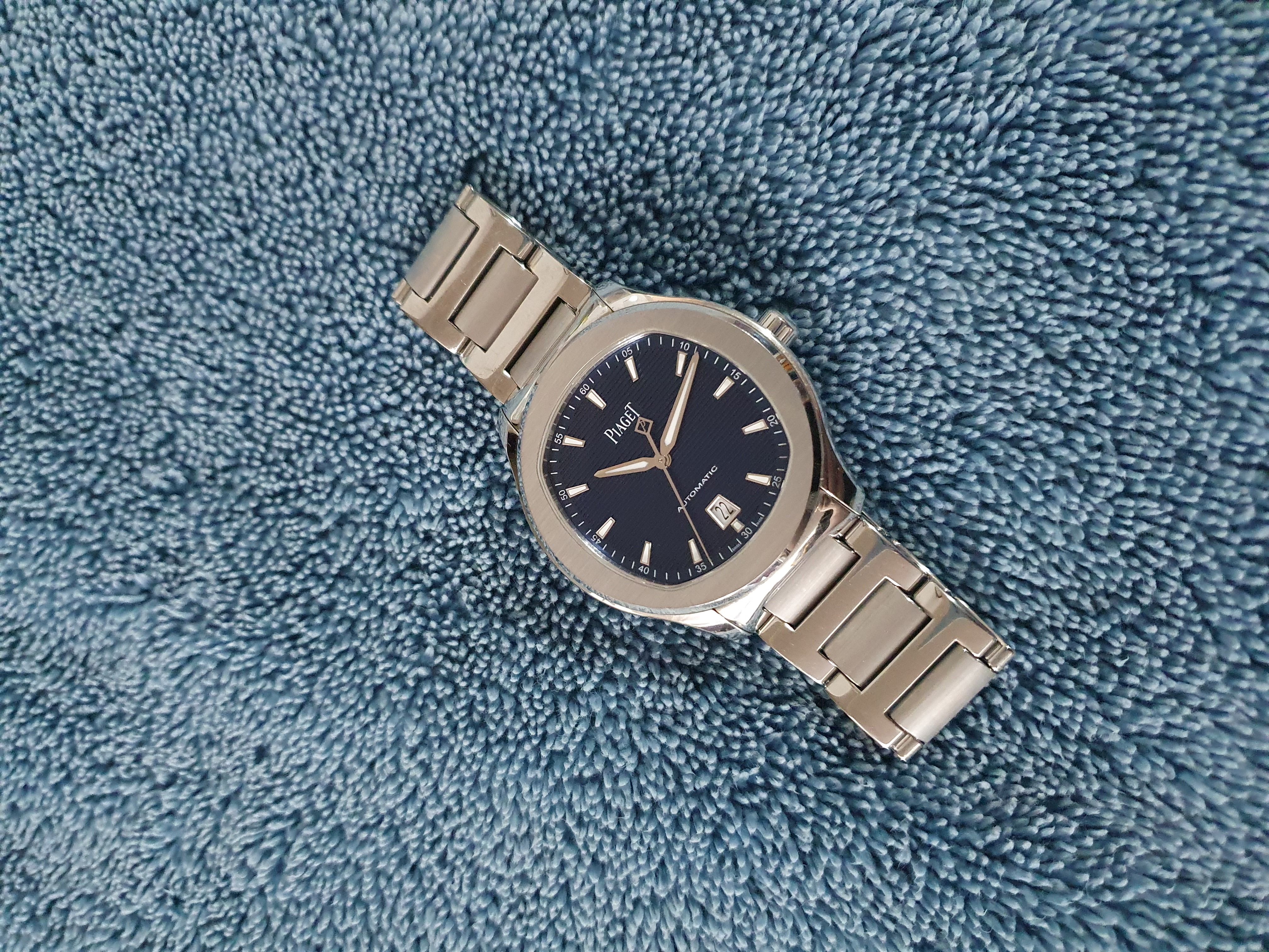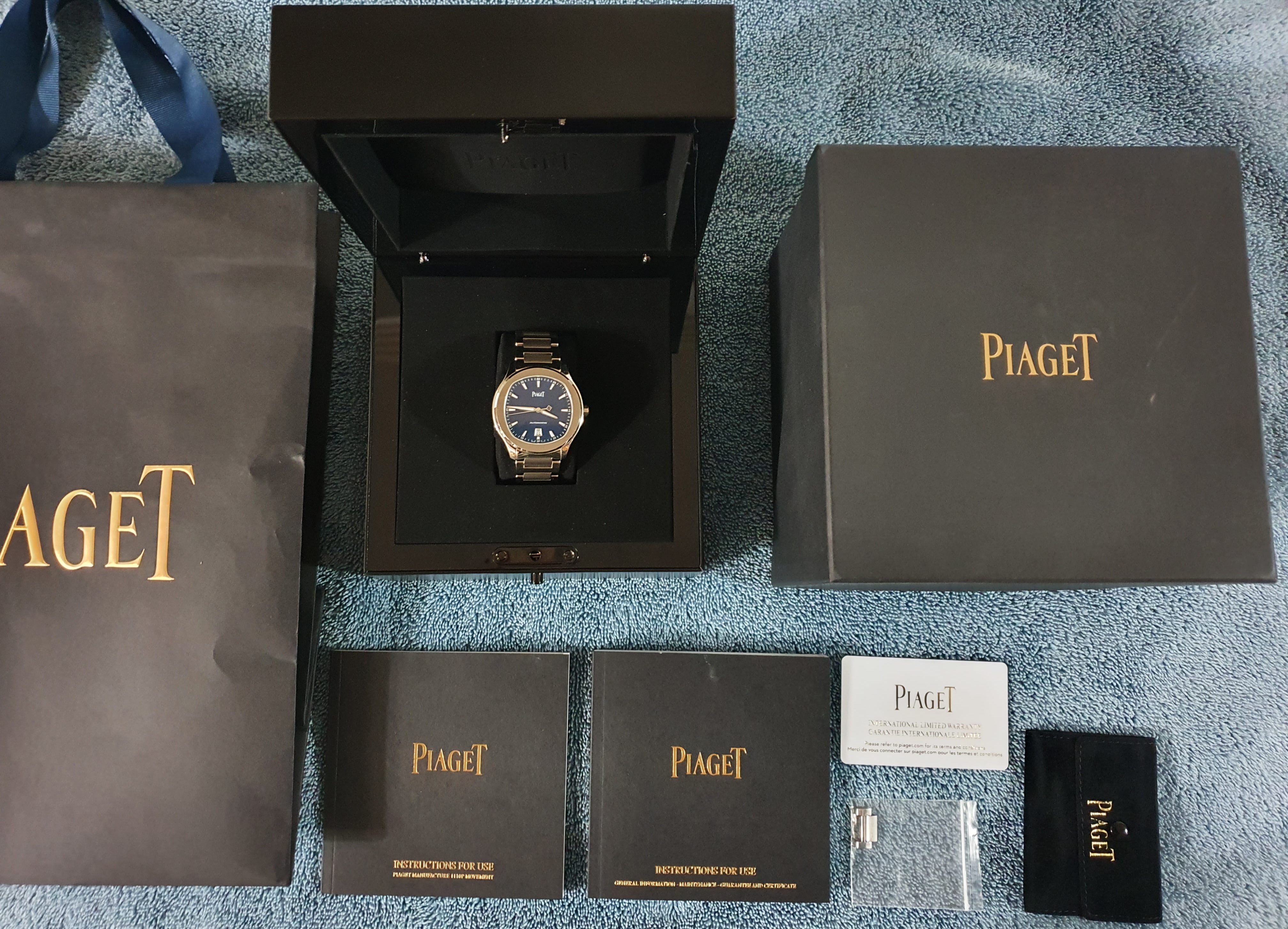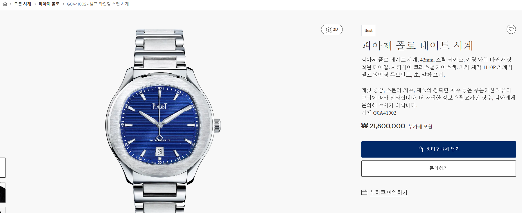 Piaget Polo Date G0A41002,피아제 폴로 데이트 스틸,피아제 폴로 블루,피아제 폴로 데이트 블루,피아제 폴로 블루 스틸,피아제 폴로 스틸 블루,피아제 폴로 청판 스틸,피아제 폴로 청판 42미리,피아제 폴로 42미리 청판,피아제 폴로 42미리 블루,블루,사파이어 크리스탈,42mm,스테인리스 스틸,셀프와인딩,Polo Date,폴로 데이트,Polo,Piaget,피아제,셀프 와인딩,Switzerland,Stainless steel,Folding clasp,Date / applied trapezoidal indices,Hour + minute + seconds