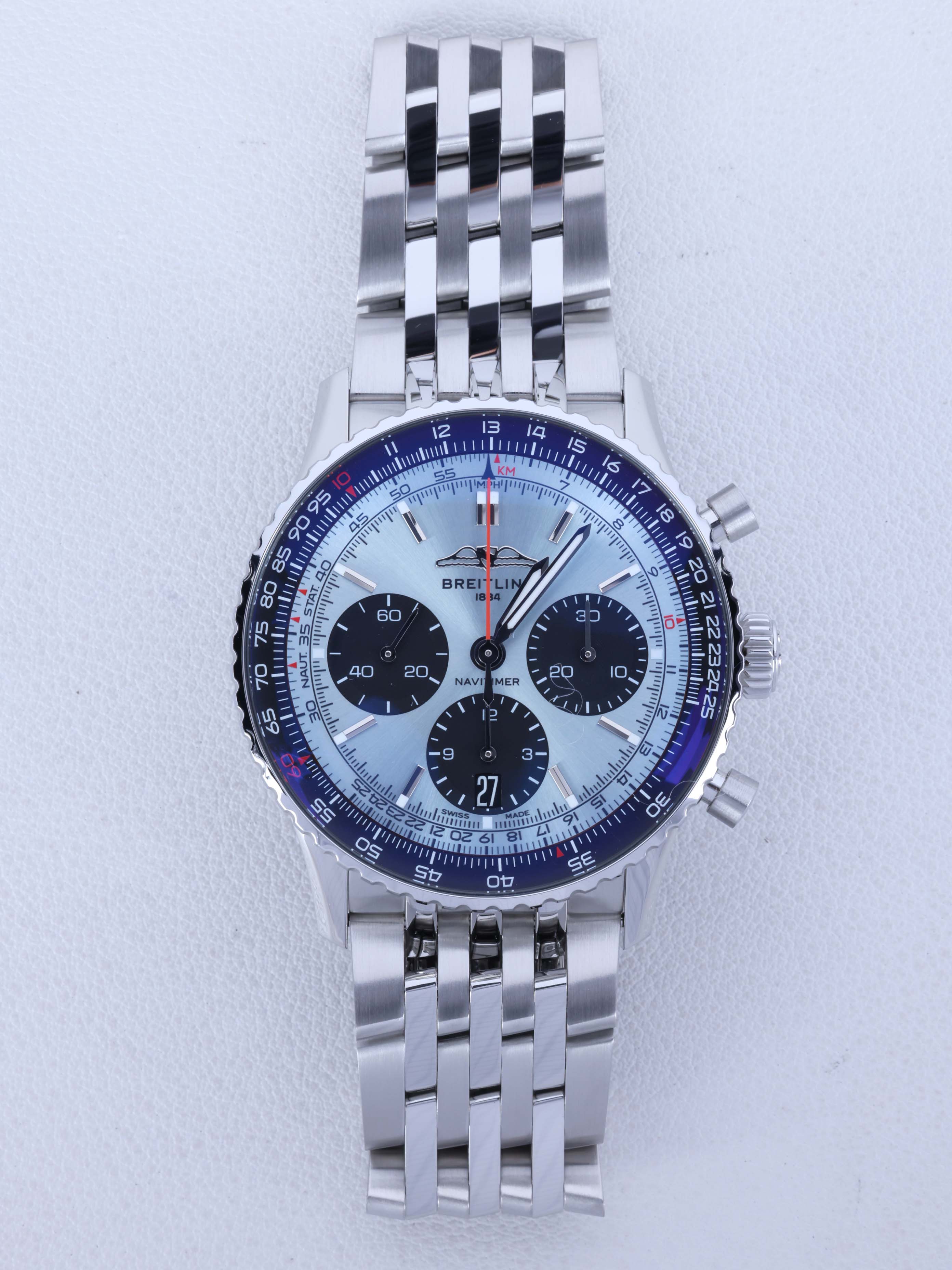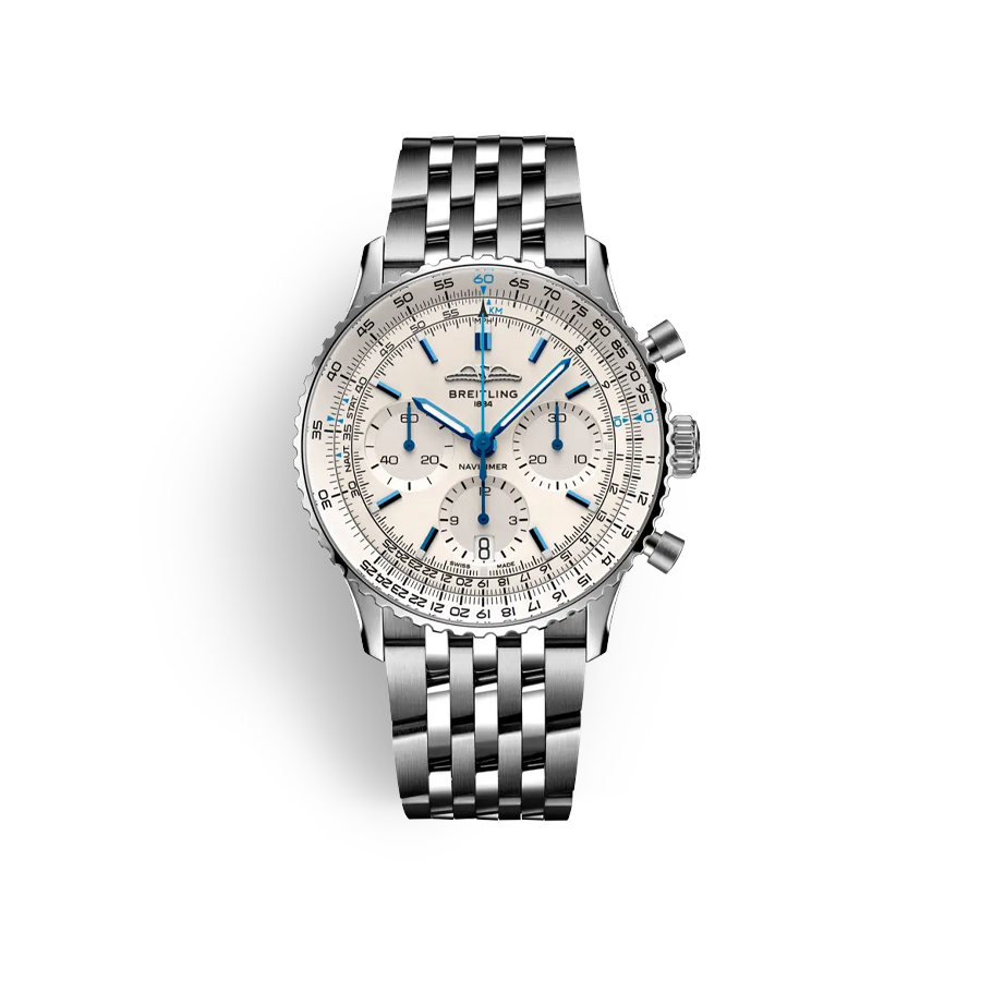 AB0139241C2A1,Breitling Navitimer Automatic B01 Chronograph 41 ice blue,브라이틀링 내비타이머 오토매틱 B01 크로노그래프 41 아이스 블루 스테인리스 스틸,아이스 블루,스테인리스 스틸,브레이슬릿,41mm,양방향 회전,슬라이드 룰,셀프와인딩,브라이틀링 01,Switzerland,Stainless steel,Folding clasp,Date,chronograph subdials,small seconds / applied hour markers,inner slide rule scale,Navitimer B01 Chronograph 41,내비타이머 B01 크로노그래프 41,Navitimer,Breitling,브라이틀링,.블루,바,폴딩 클라스프,크로노그래프,데이트,투명 케이스백,22 mm,원형,파일럿,남성용,양방향 회전, 슬라이드 룰,브라이틀링 B01,Date, chronograph subdials, small seconds / applied hour markers, inner slide rule scale