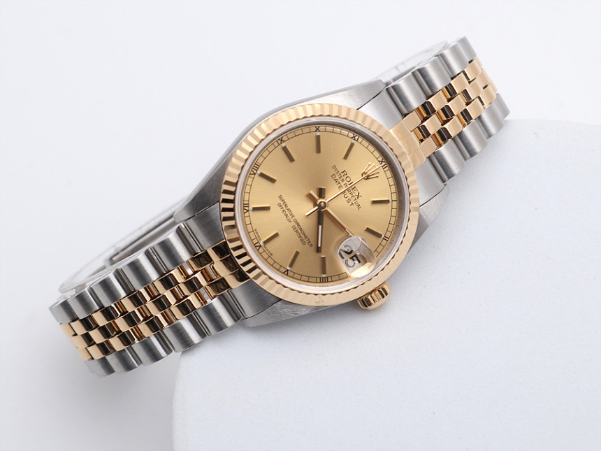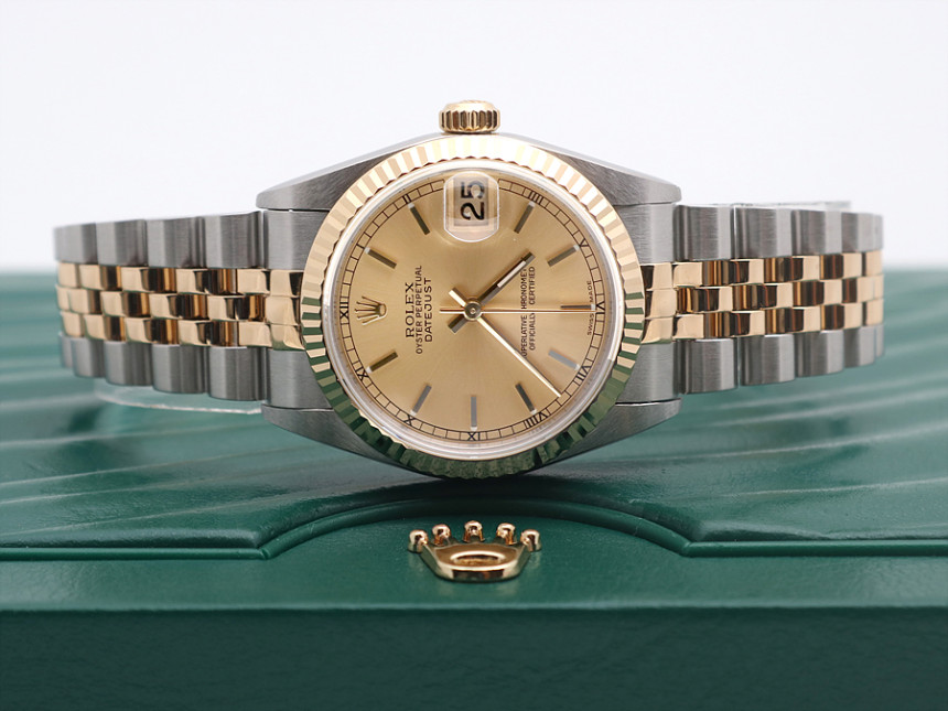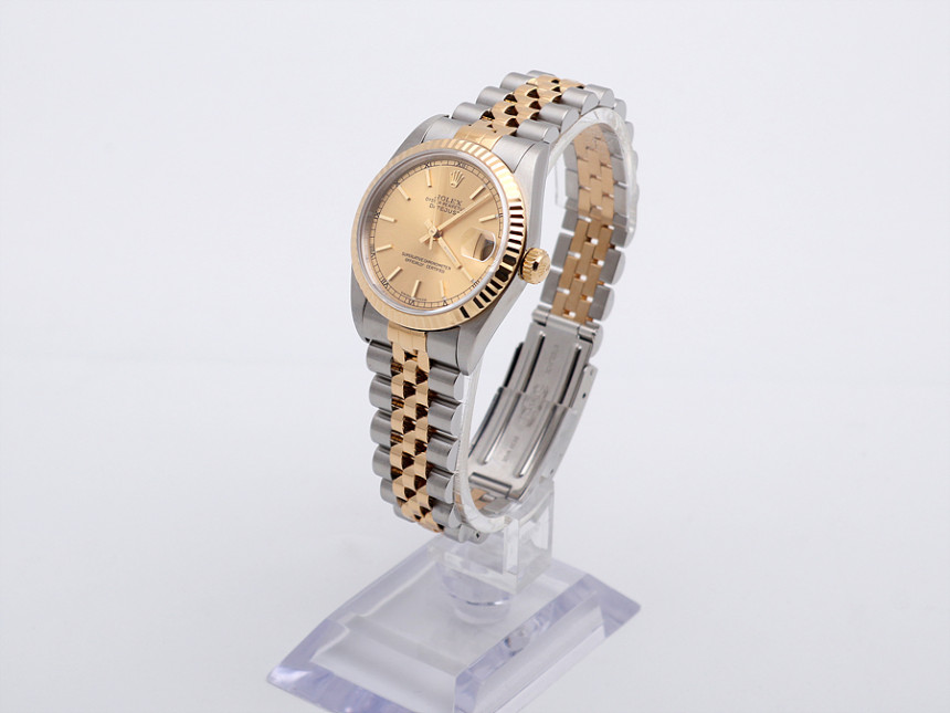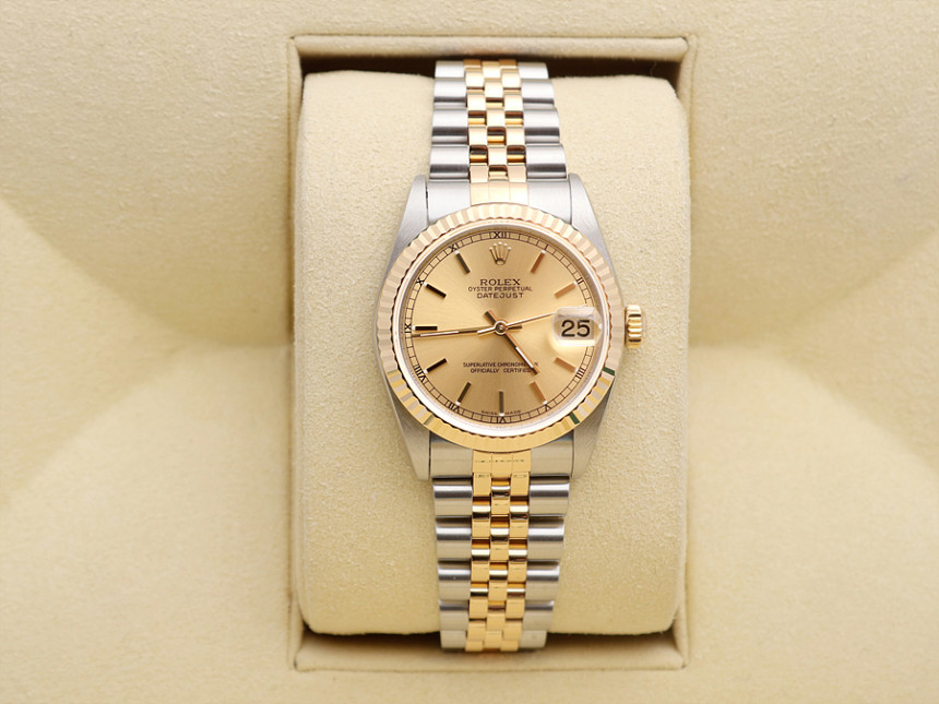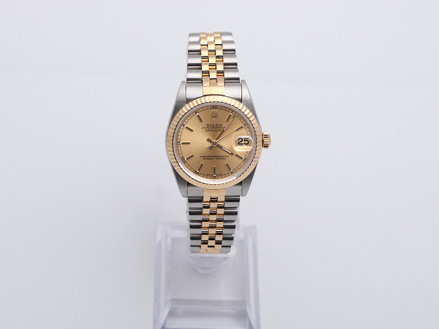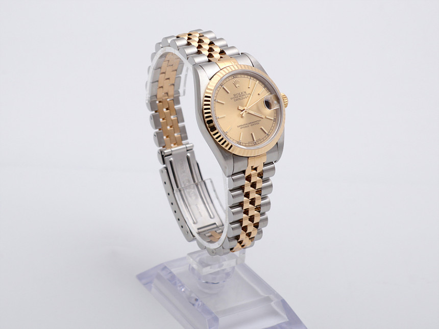 31미리, 스틸 & 18K 옐로 골드, 골드 바 인덱스, 3시 방향 캘린더 창이 세팅된 골드 다이얼, 골드 핸즈, 사이클롭스 렌즈가 적용된 크리스탈 사파이어, 18K 옐로 골드 플루티드 베젤, 쥬빌리 브레슬릿, 1999년.