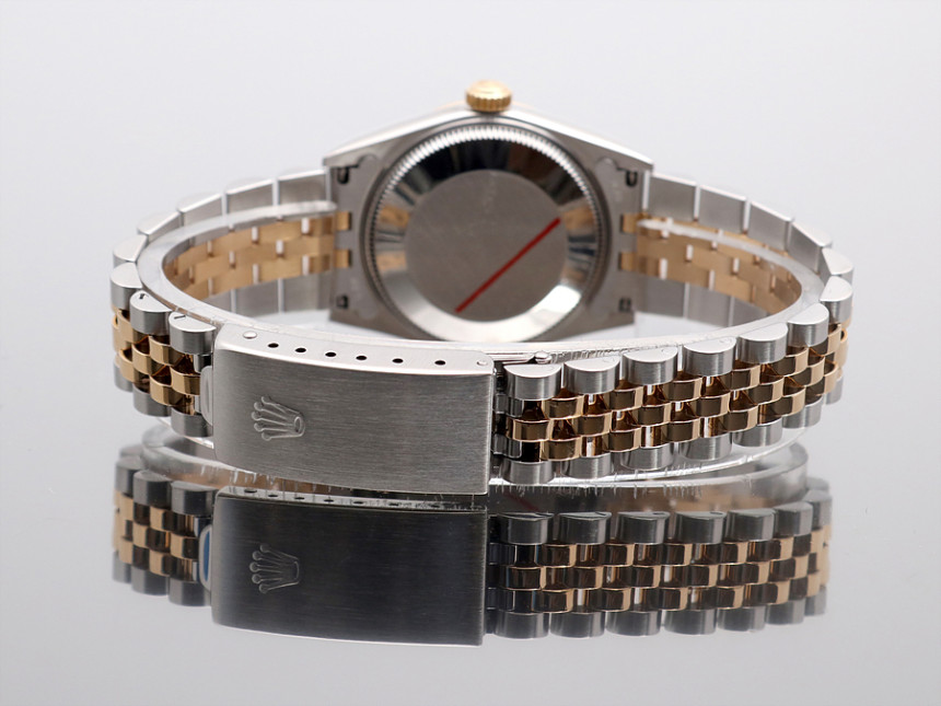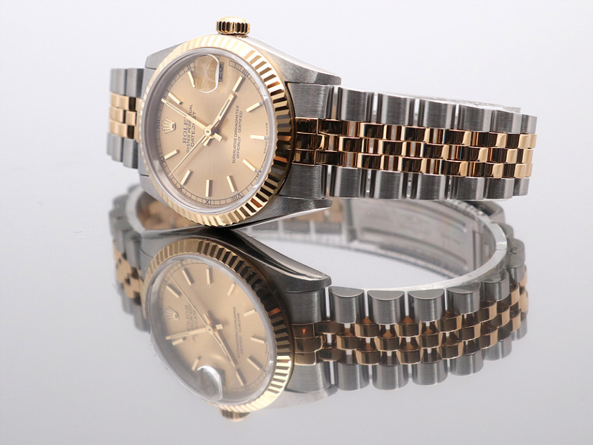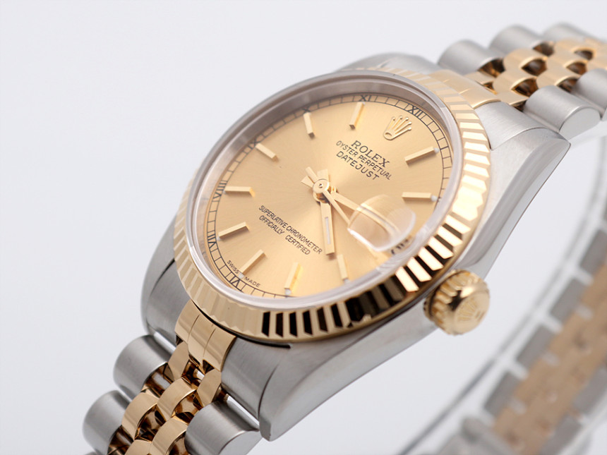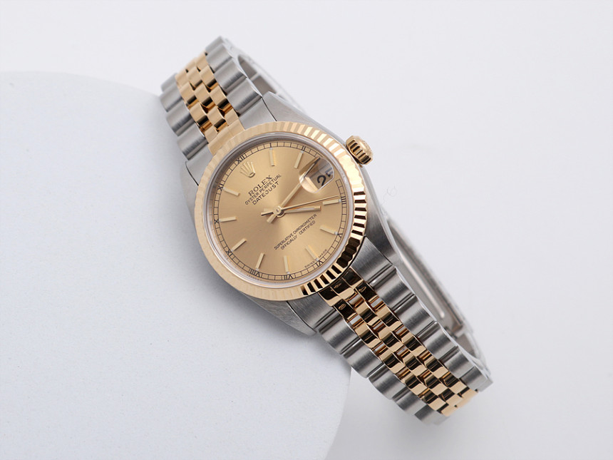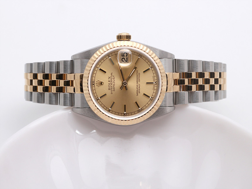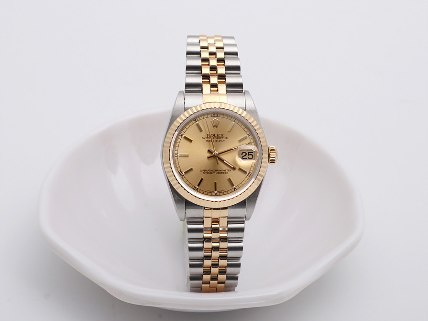31미리, 스틸 & 18K 옐로 골드, 골드 바 인덱스, 3시 방향 캘린더 창이 세팅된 골드 다이얼, 골드 핸즈, 사이클롭스 렌즈가 적용된 크리스탈 사파이어, 18K 옐로 골드 플루티드 베젤, 쥬빌리 브레슬릿, 1999년.
