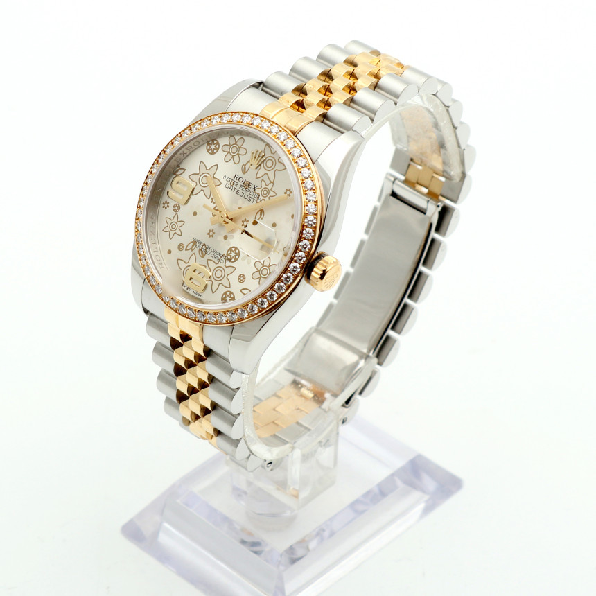 롤렉스의 스테디셀러 데이저스트입니다. 다이얼이 굉장히 유니크하죠. 롤렉스가 소량으로 생산하곤 하는 매우 실험적이고 유니크한 '플라워 모티프 다이얼' 입니다. 꽃향기가 다이얼을 감싸고 있는 것 같아 아름답습니다. 세련되고 환한 실버톤 다이얼 위로 수놓아진 플라워 패턴과 엣지 있는 6시, 9시 골드 인덱스를 감상해 보세요. 여기에 베젤의 다이아는 천만원이 넘는 호화스러운 옵션인 만큼 시계에 확실한 근사함을 더합니다.