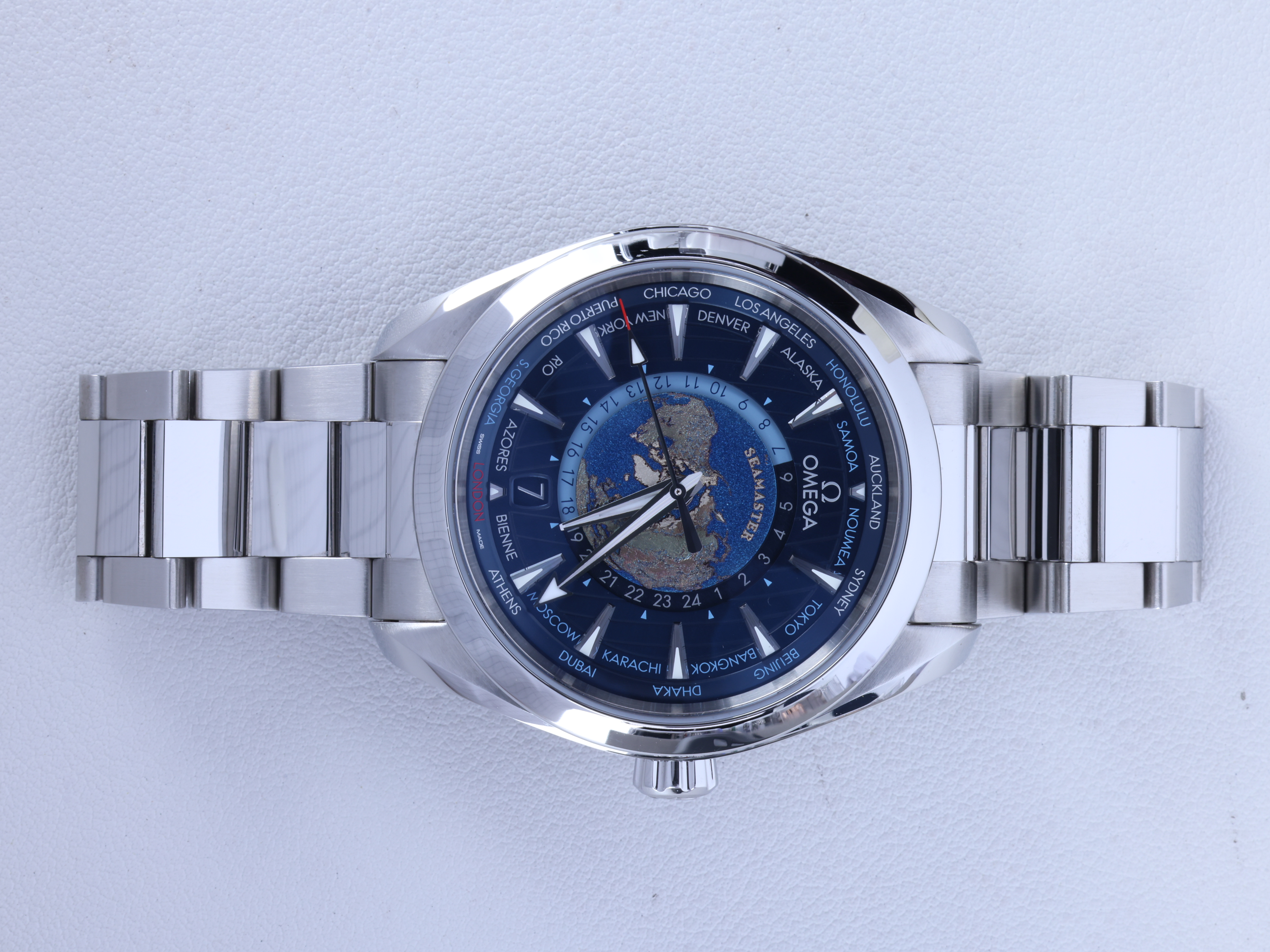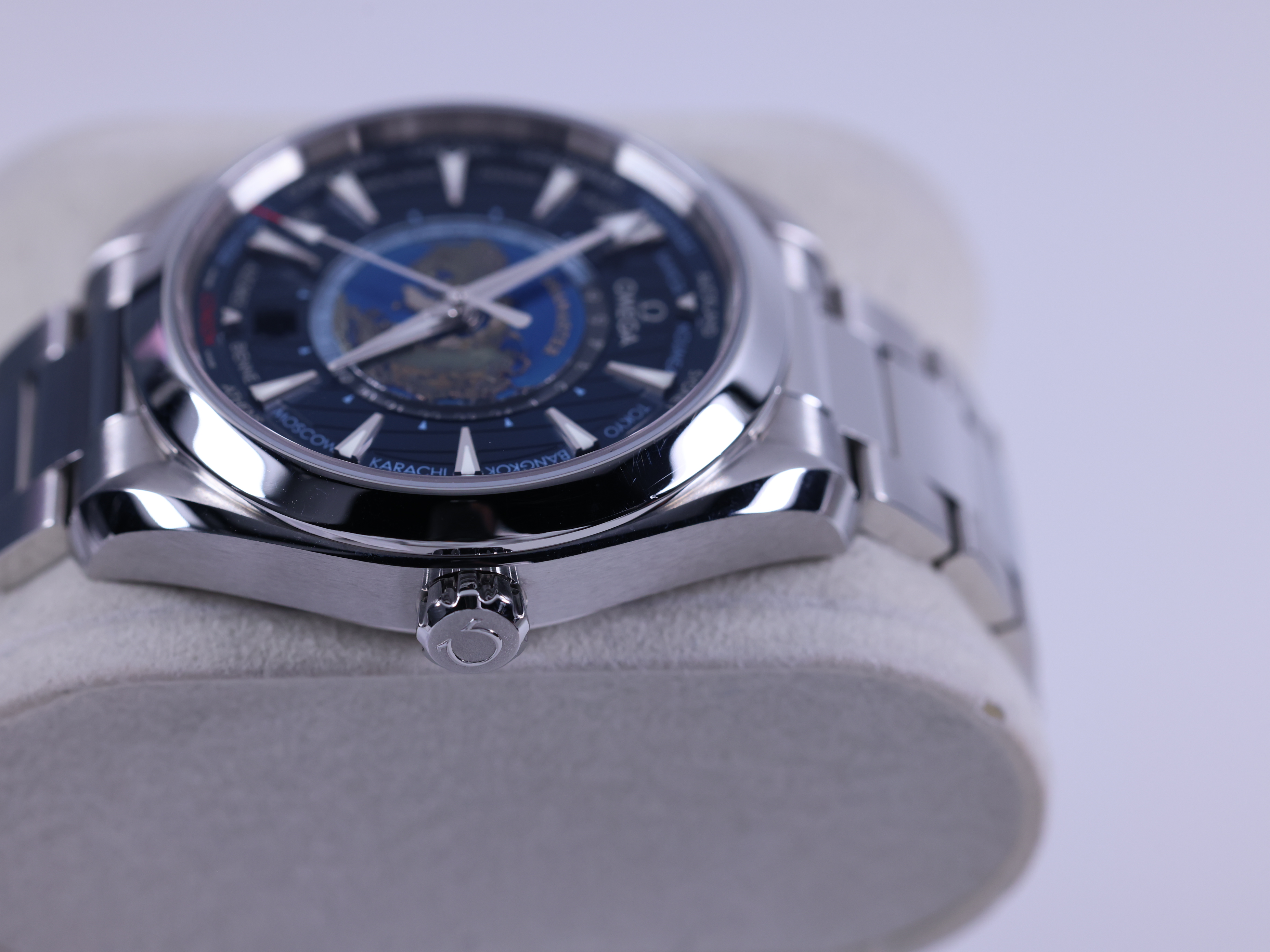 Omega Aqua Terra Worldtimer Blue,Aqua Terra 150M Worldtimer,Aqua Terra Worldtimer Steel Blue,Aqua Terra Worldtimer,아쿠아 테라 월드타이머,Seamaster,Omega,오메가,오메가 아쿠아 테라 150M GMT 월드타이머 43,오메가 아쿠아 테라 월드타이머 스틸 블루,220.10.43.22.03.001,블루,43mm,스테인리스 스틸,셀프와인딩,Aqua Terra GMT Worldtimer,오메가 지엠티 월드타이머,셀프 와인딩,Switzerland,Stainless steel,Folding clasp,Date,24-hour ring / applied dagger indices,Hour + minute + seconds,.블루,트라이앵글,폴딩 클라스프,데이트,월드 타임,투명 케이스백,21 mm,원형,파일럿,남성용,Date, 24-hour ring / applied dagger indices