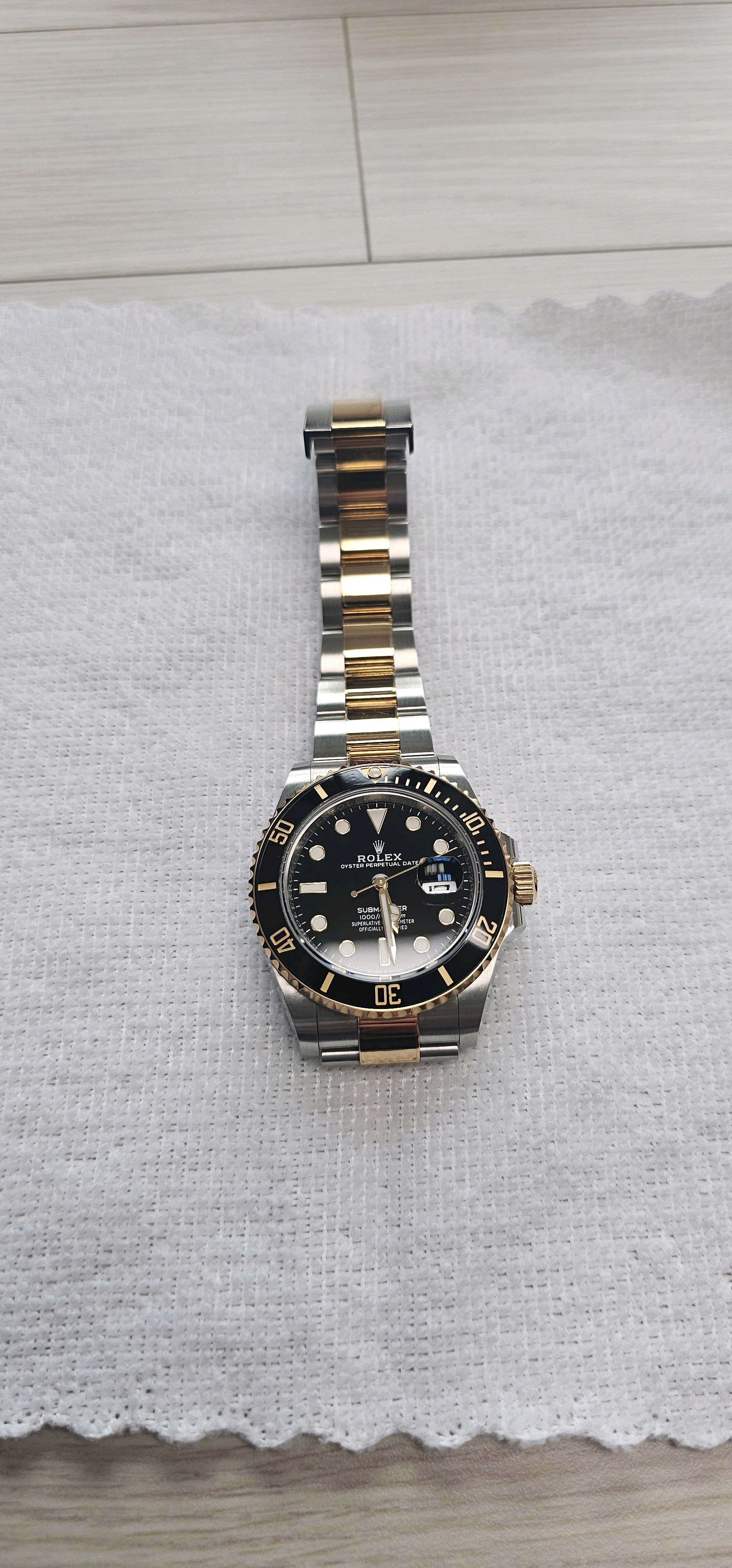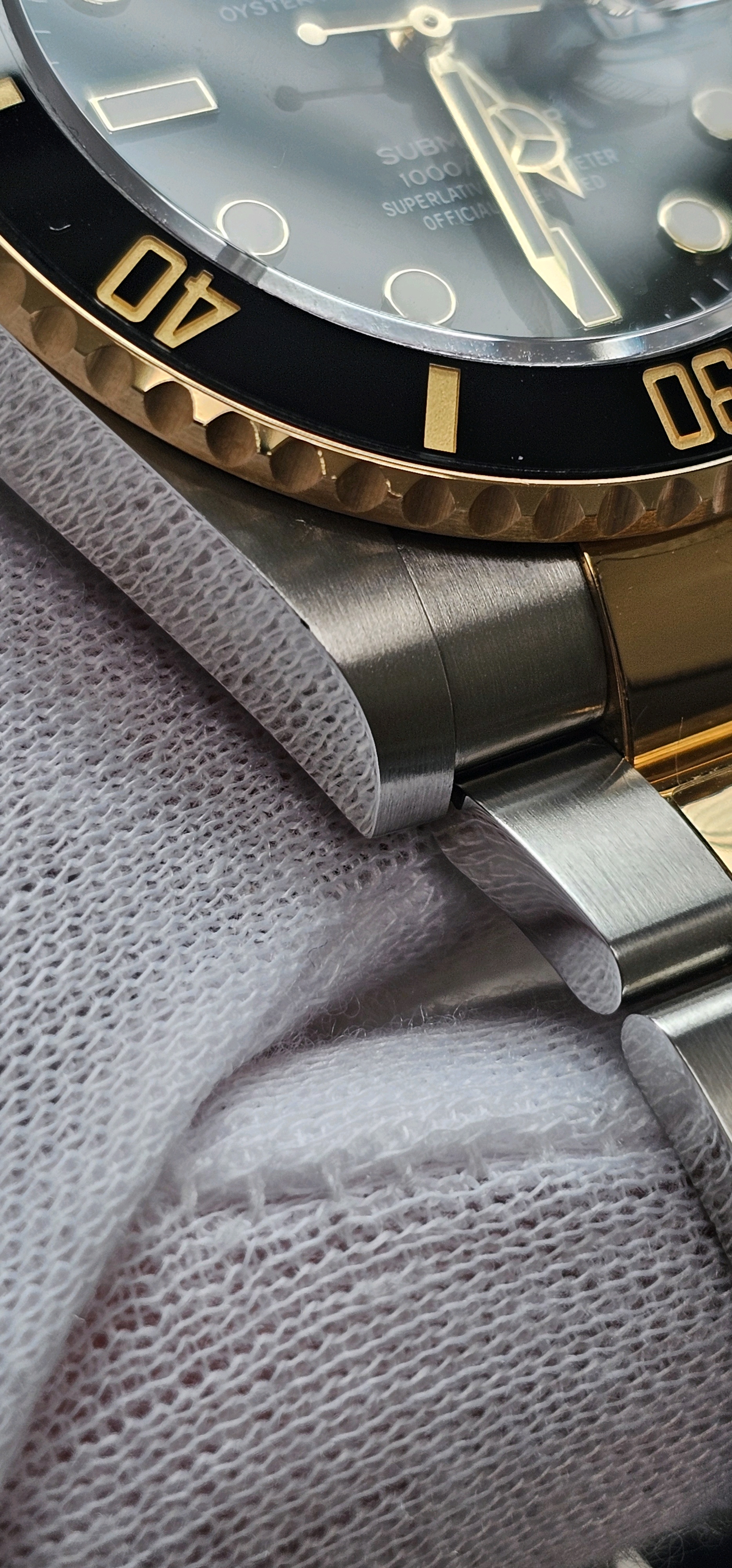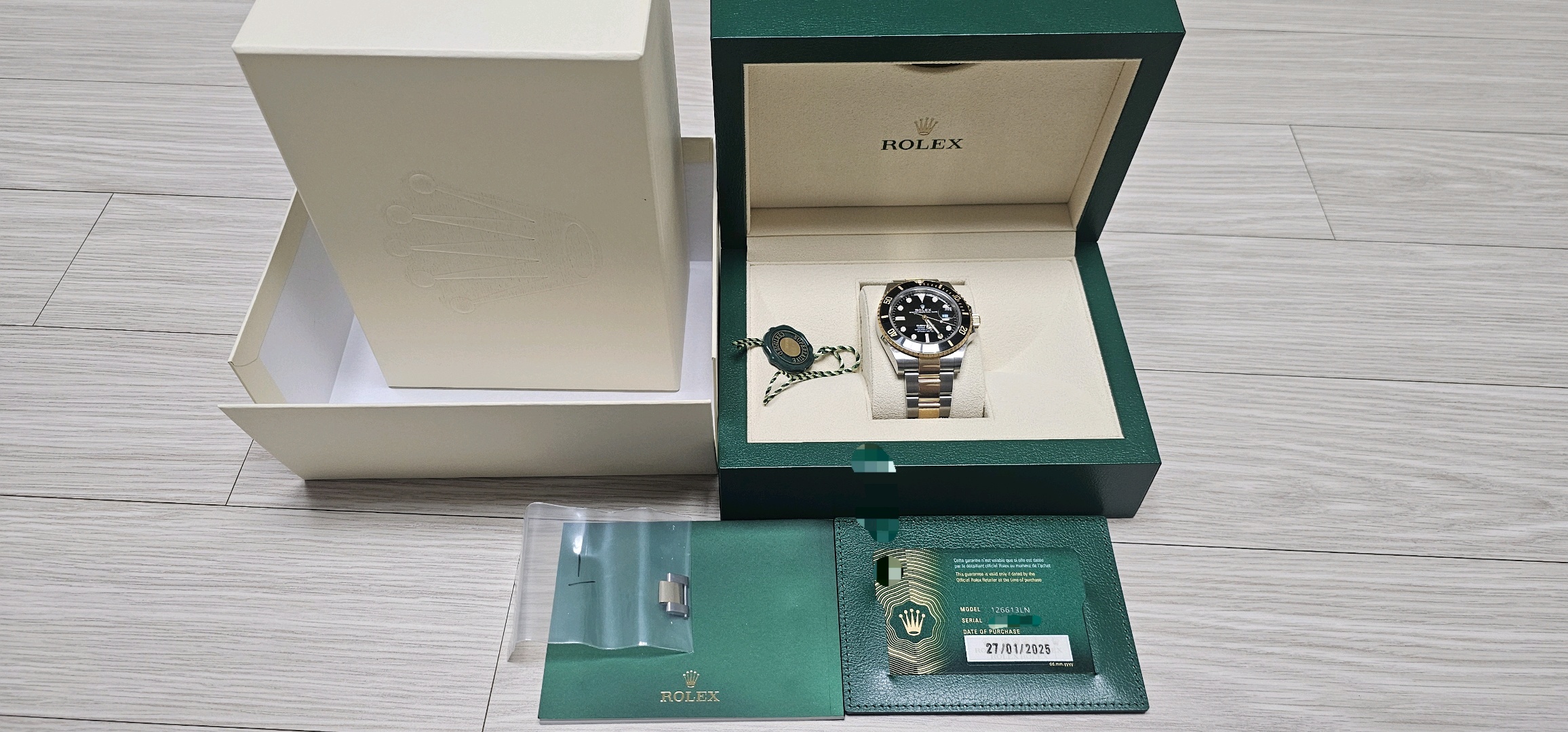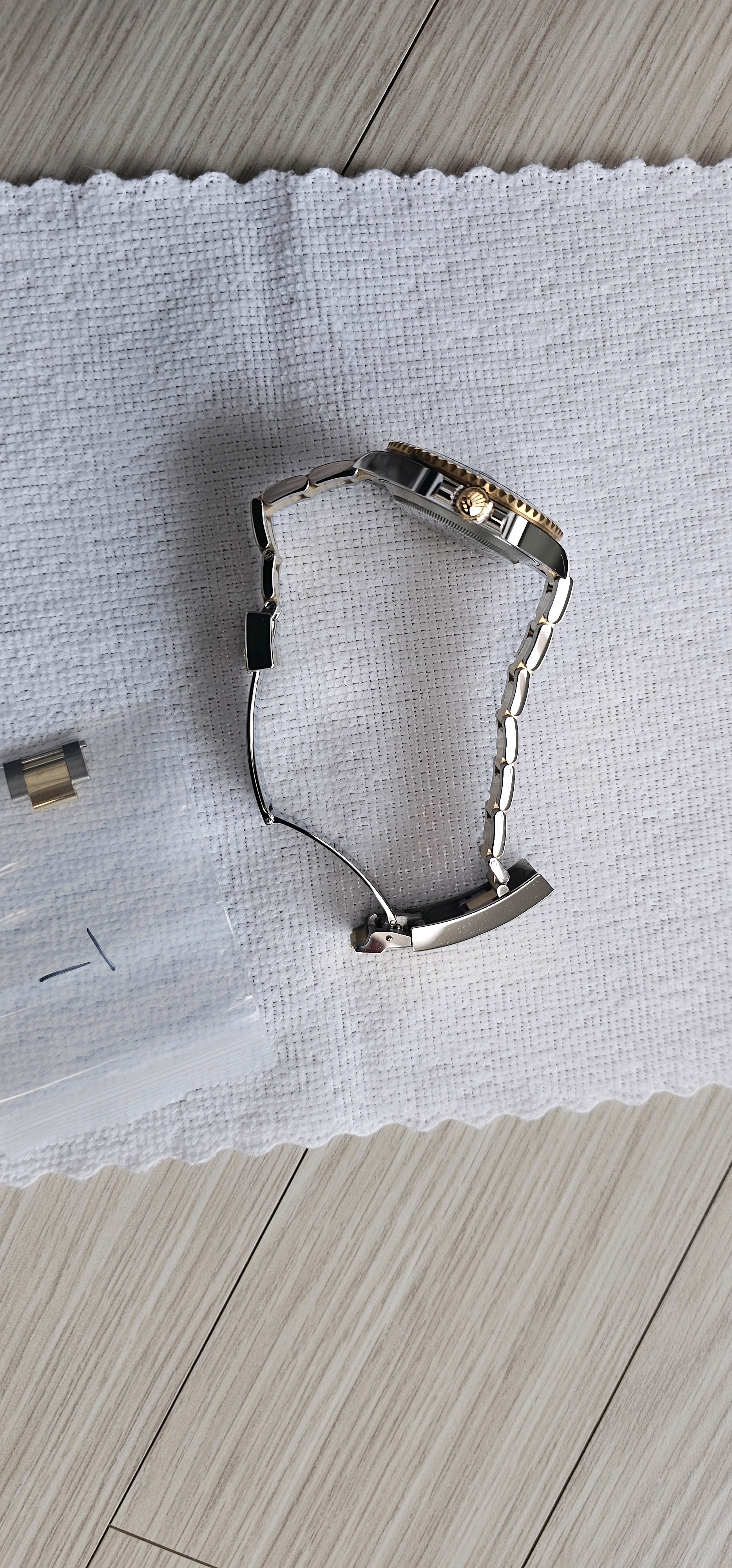 2025년 1월말 구매, 전체 부속품 모두 보유, 실착용 3회, 골드 부위만 필름 붙여놓음, 7시방향 러그 모서리 미세한 찍힘 자국 있음, 케이스 용두 방향 실기스 존재 이외 상태 최상