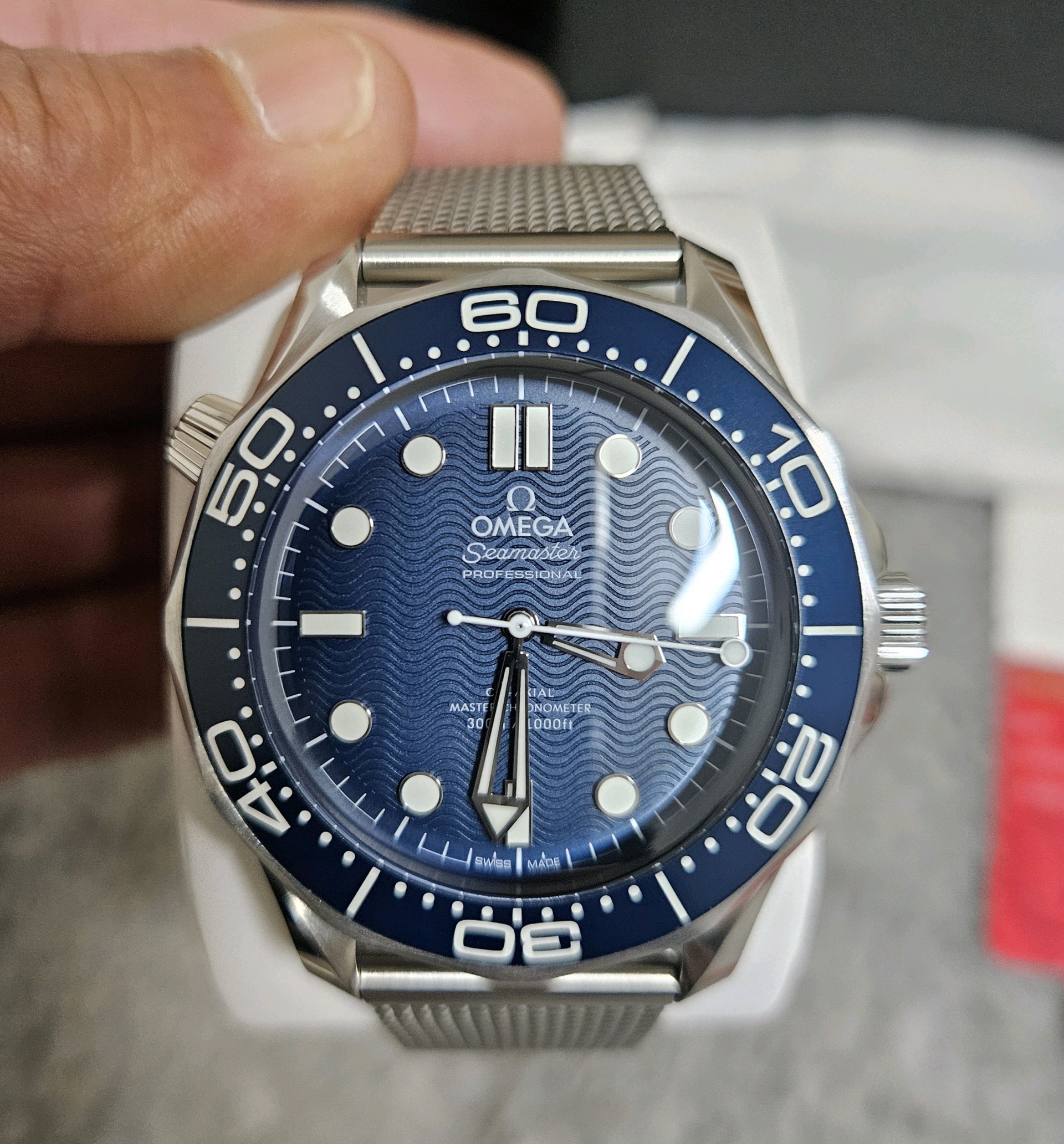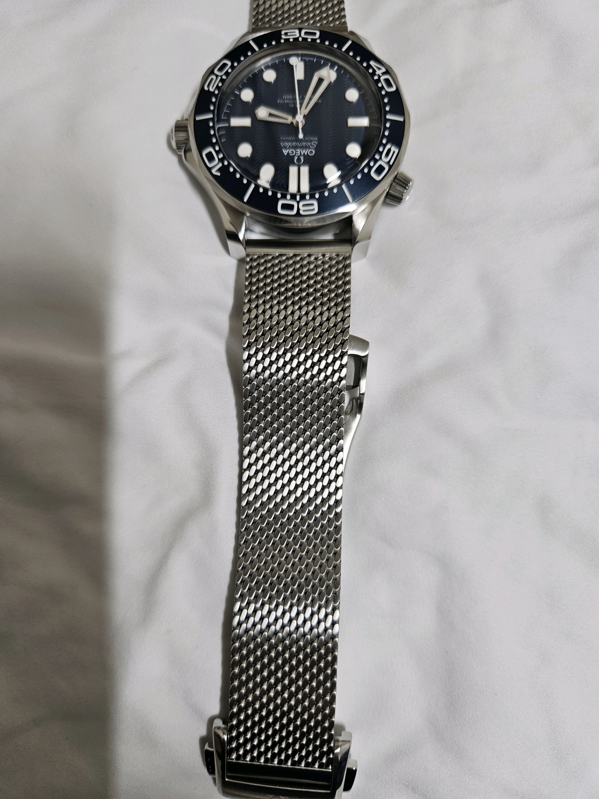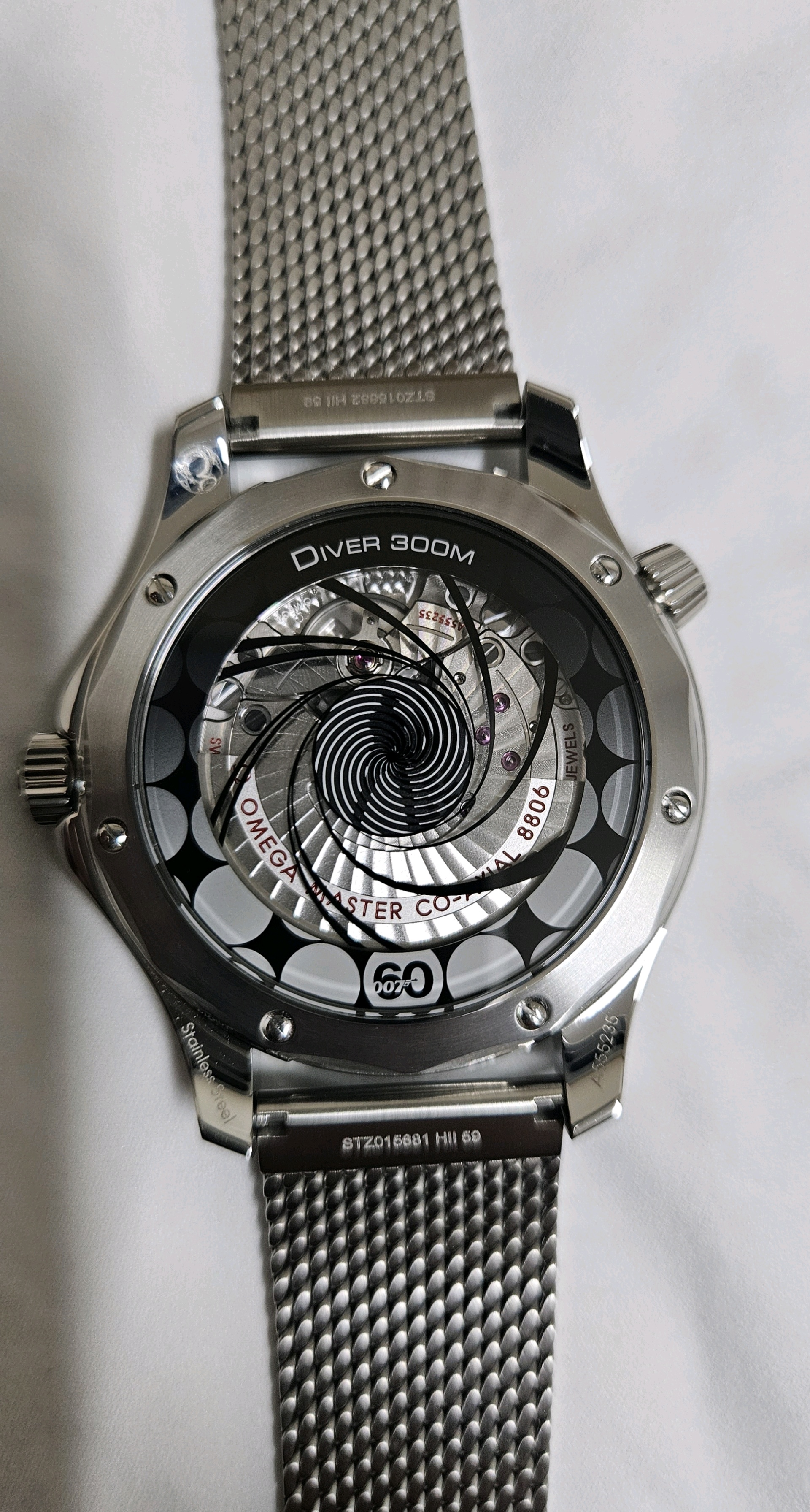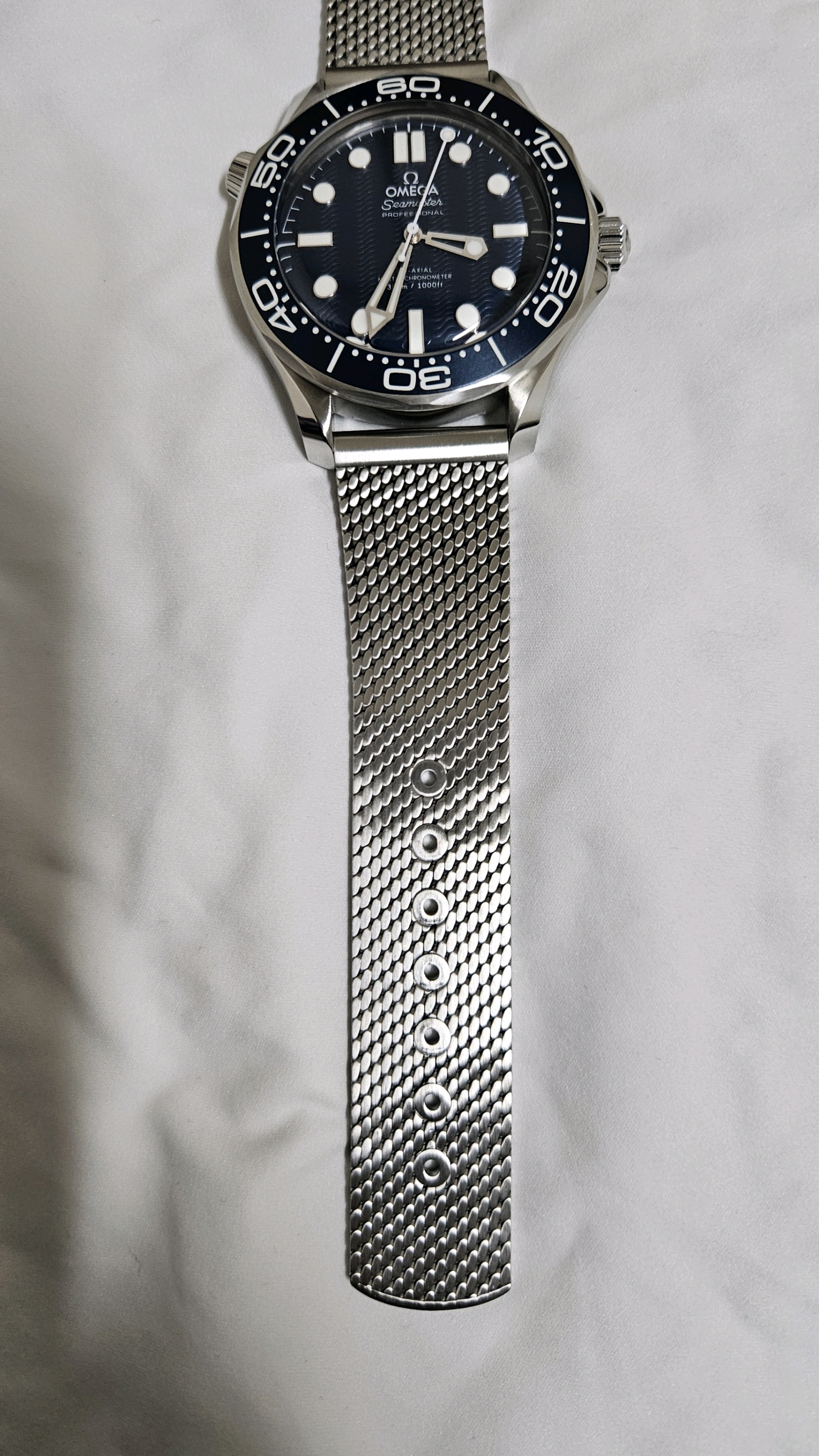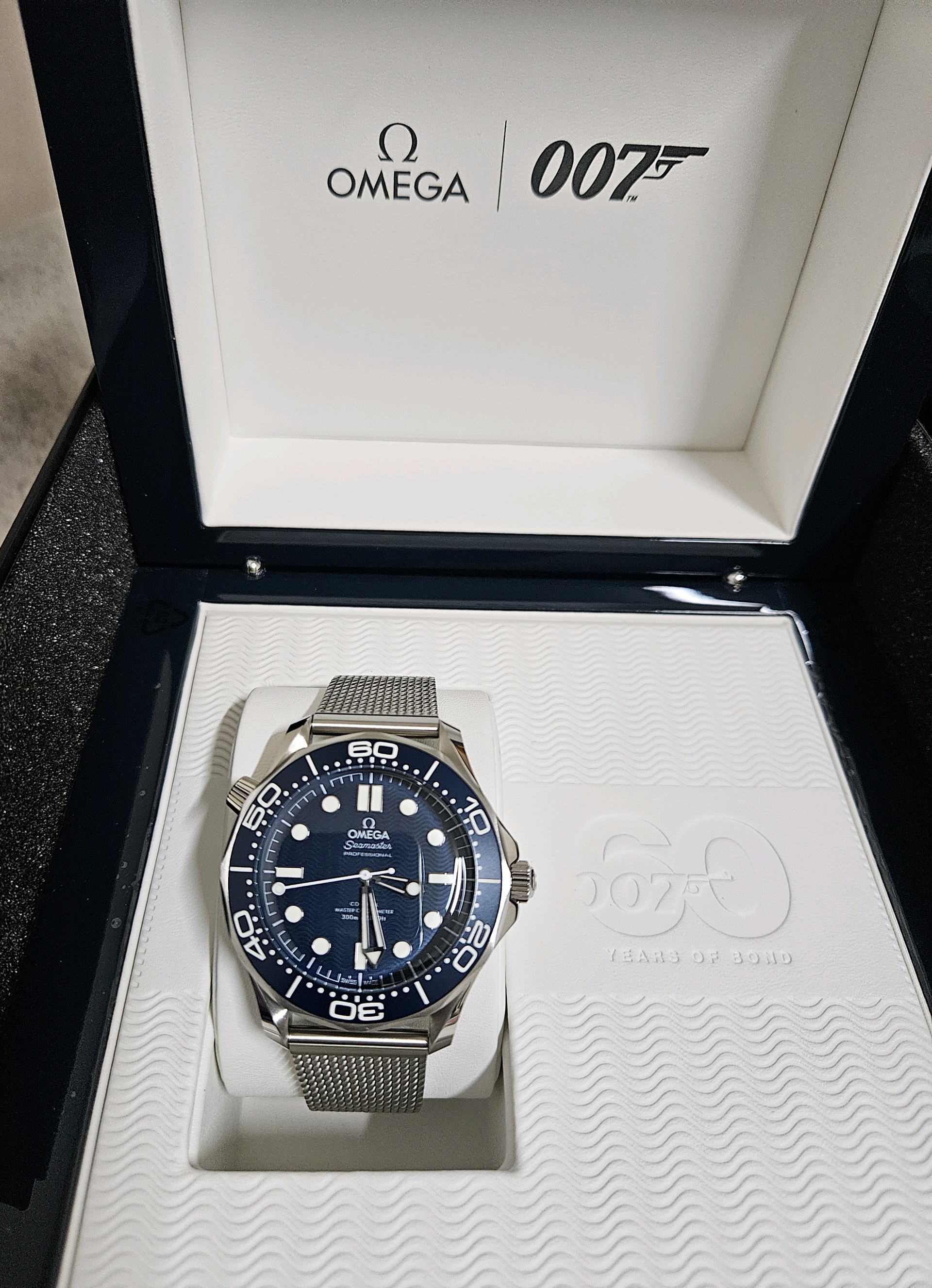 Diver300M,210.30.42.20.03.002,씨마스터,씨마,다이버,다이버300,300,오메가,제임스 본드,James Bond,시스루백,물결,Omega블루,스테인레스스틸,사파이어크리스탈,42mm,14.3mm,약156g,300m,세라믹,역회전방지베젤,셀프와인딩,Cal.8806,25,200진동,약55시간,SeaMaster,블루,스테인레스 스틸,메쉬형,메쉬,폴딩 클래스프,사파이어 크리스탈,Diver 300M,Seamaster,Omega,다이버 300M,오메가 SMP,오메가 씨마스터 프로페셔널,Seamaster Diver 300M 007 60th Anniversary,스테인리스 스틸,Switzerland,Stainless steel,Folding clasp,Applied hour markers,Hour + minute + seconds,.블루,도트,패턴,폴딩 클라스프,투명 케이스백,20 mm,원형,남성용,Applied dotted & baton indices