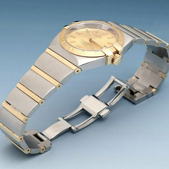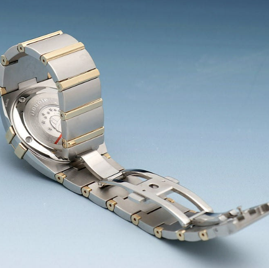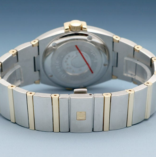 어느 손목에나 안정적인 35미리의 사이즈에 스틸과 18K 옐로우 골드로 제작된 콤비입니다. 고급스러운 골드 바 인덱스, 골드 다이얼, 골드 핸즈가 점잖으면서도 근사합니다. 골드 베젤 위로는 로만 인덱스가 새겨져 시선을 끕니다. 잘생긴 비주얼만큼이나 다재다능한 기능이 탑재되어 있는데요. 열 보정 장치가 장착된 퍼페추얼 캘린더 쿼츠 무브먼트가 탑재되어 있어 윤달(2월 29일)을 포함한 모든 날짜의 변화를 인식하는 메모리 기능이 있습니다. 무려 2100년 2월 28일까지의 날짜의 변화를 인식할 수 있다고 하니 대단하죠. 또한 배터리 소진 표시 기능이 있는 오메가 1680 칼리버가 적용되어 있습니다. 이 배터리의 수명은 보통 48개월 정도입니다.