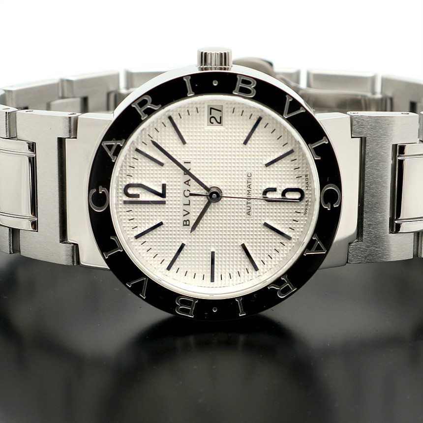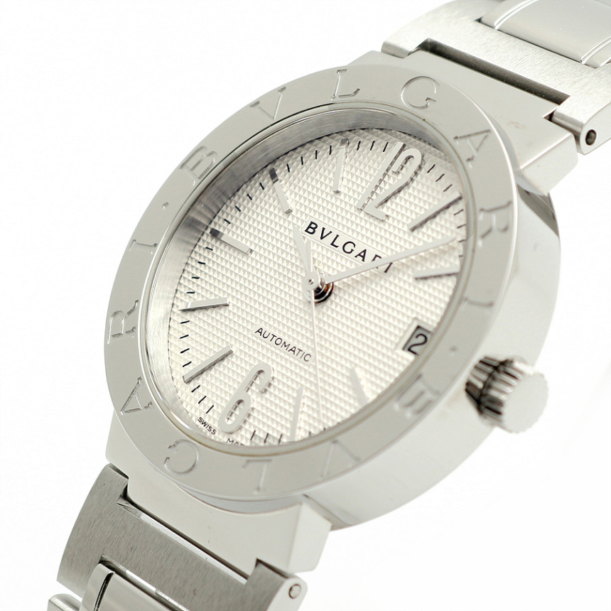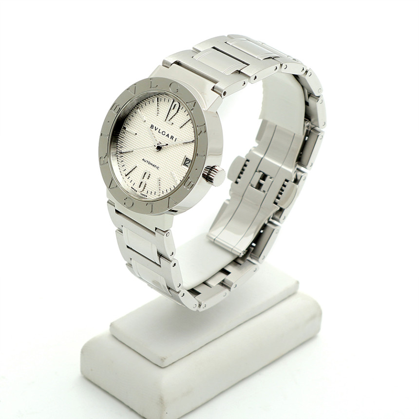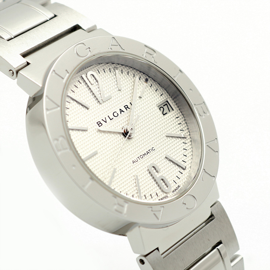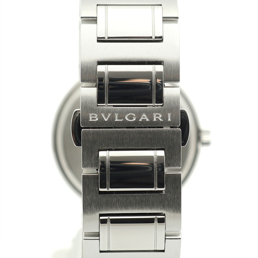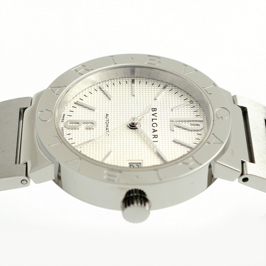 [소재 및 특징] 33미리, 스틸 소재, 'BVLGARI'가 새겨진 유광 베젤, 유광과 무광이 교차하는 매력적인 브레이슬릿, 3시 방향 날짜창, 사파이어 글래스, 버튼식 버클
