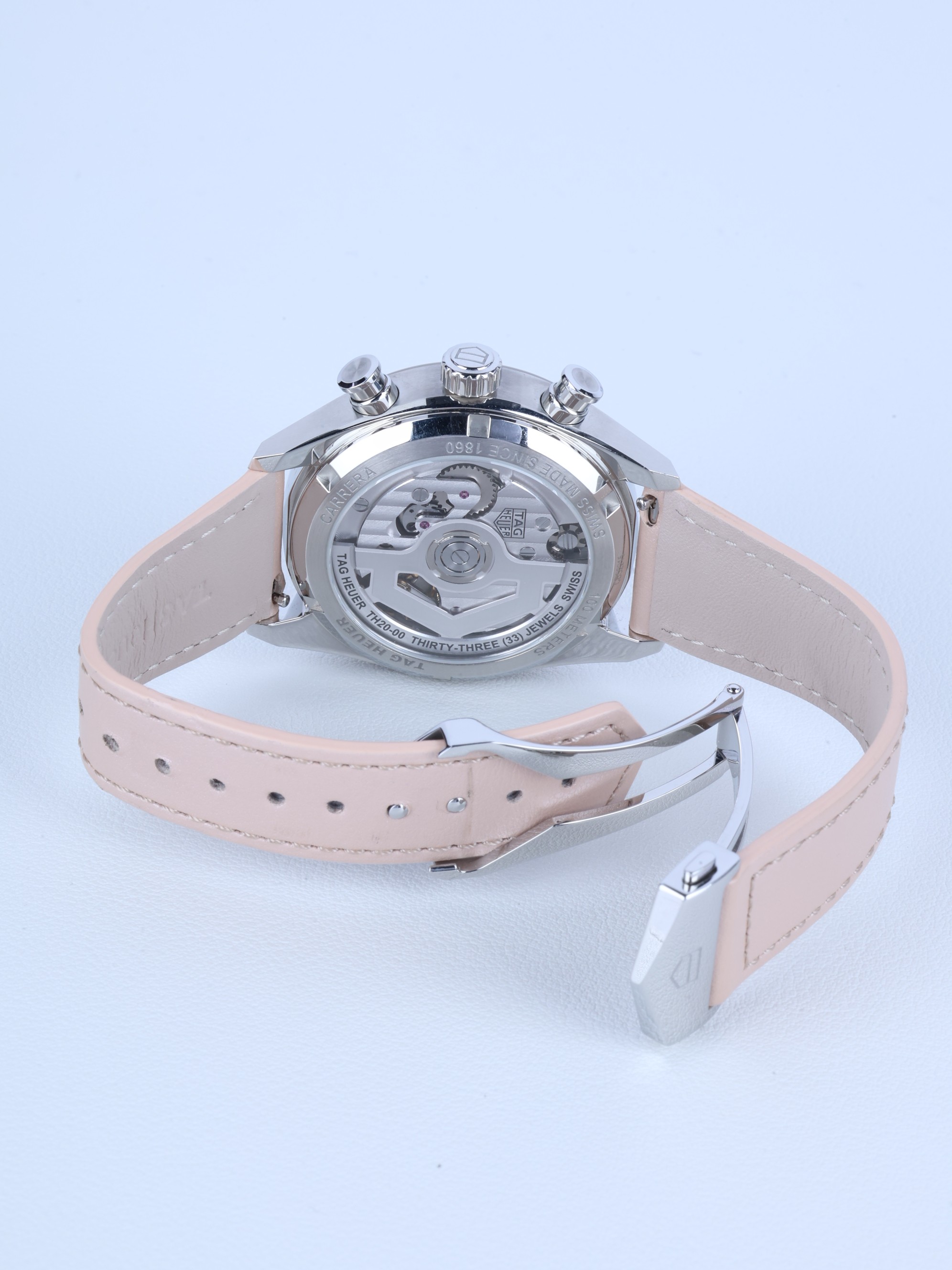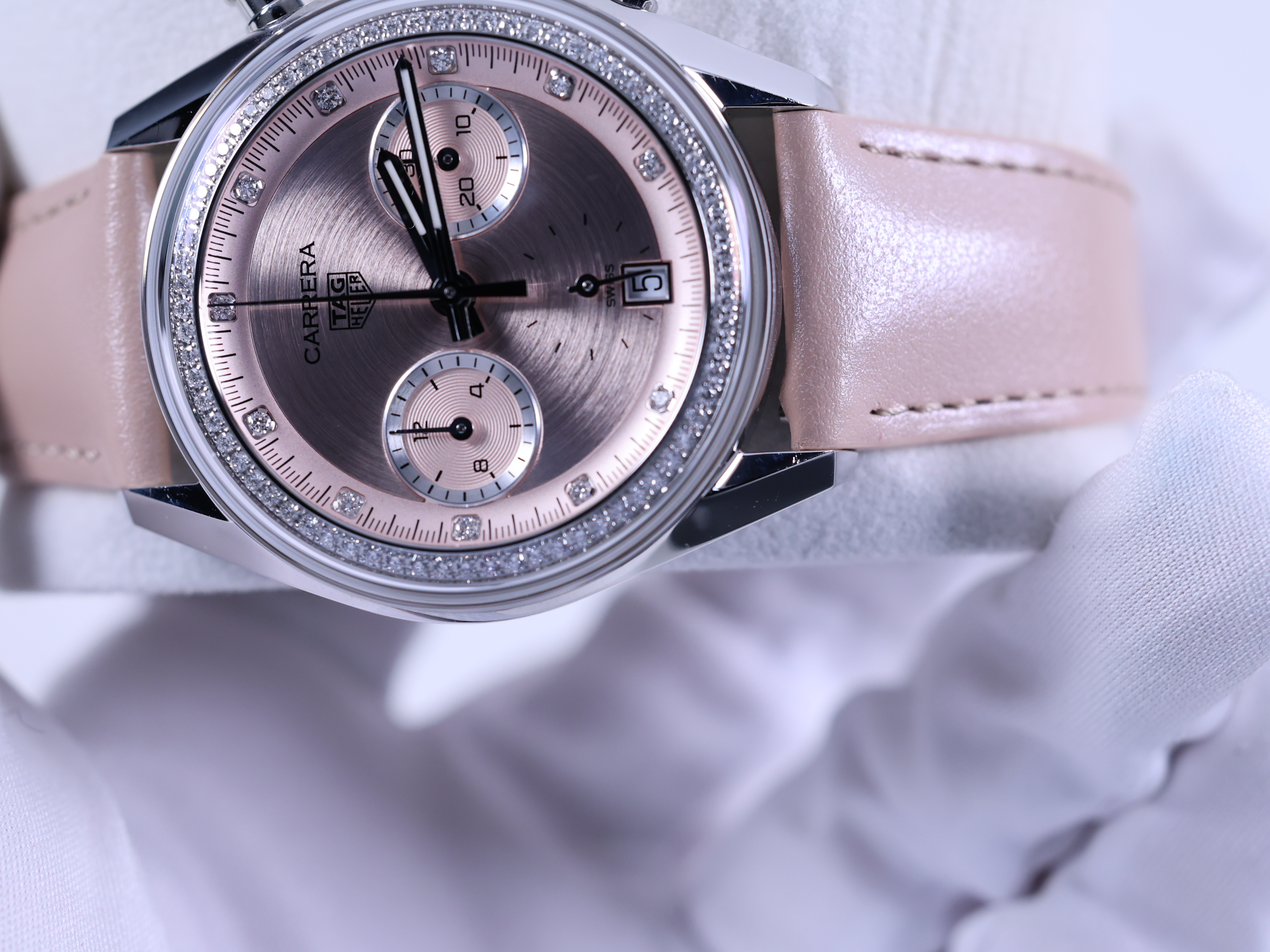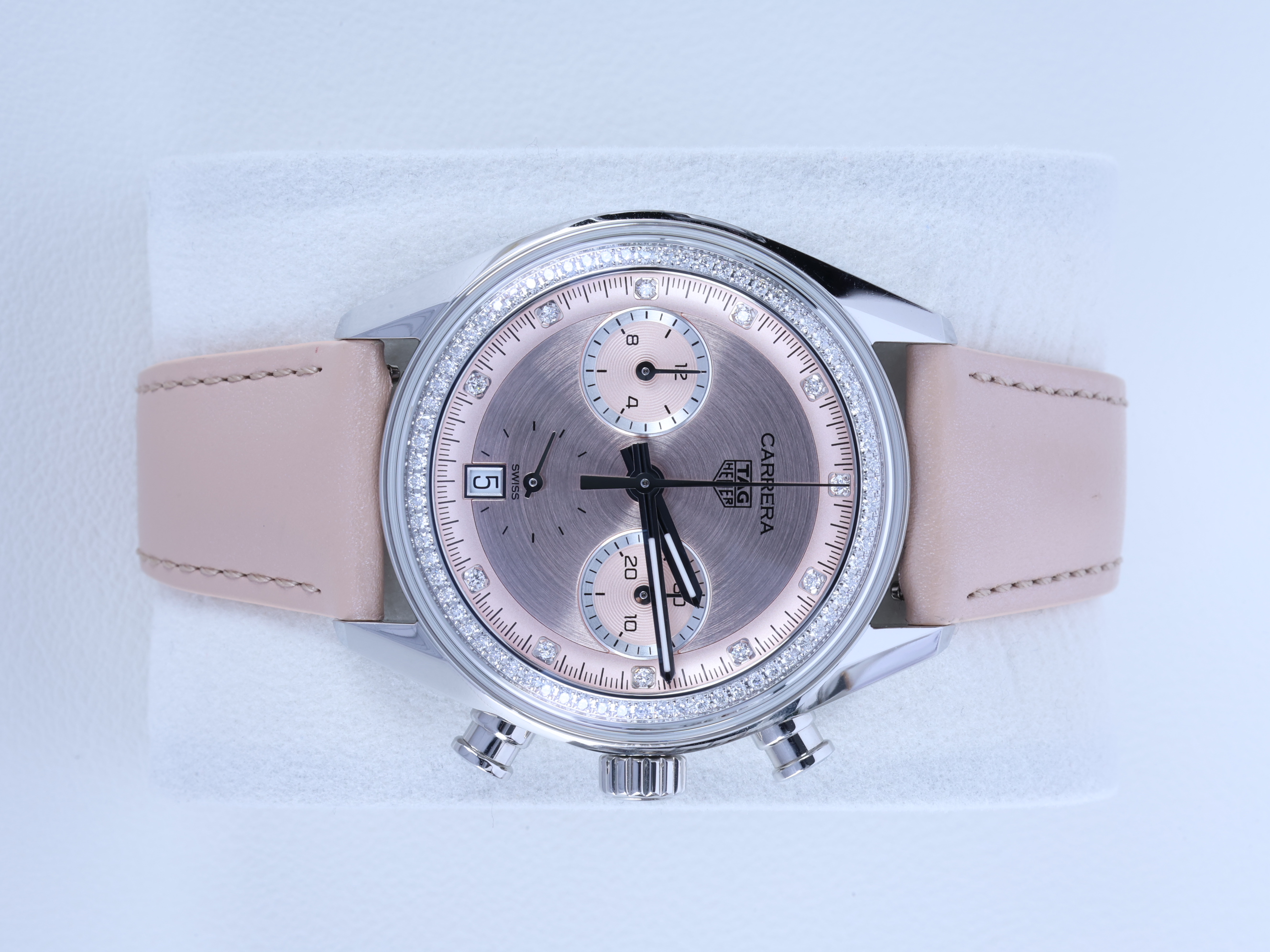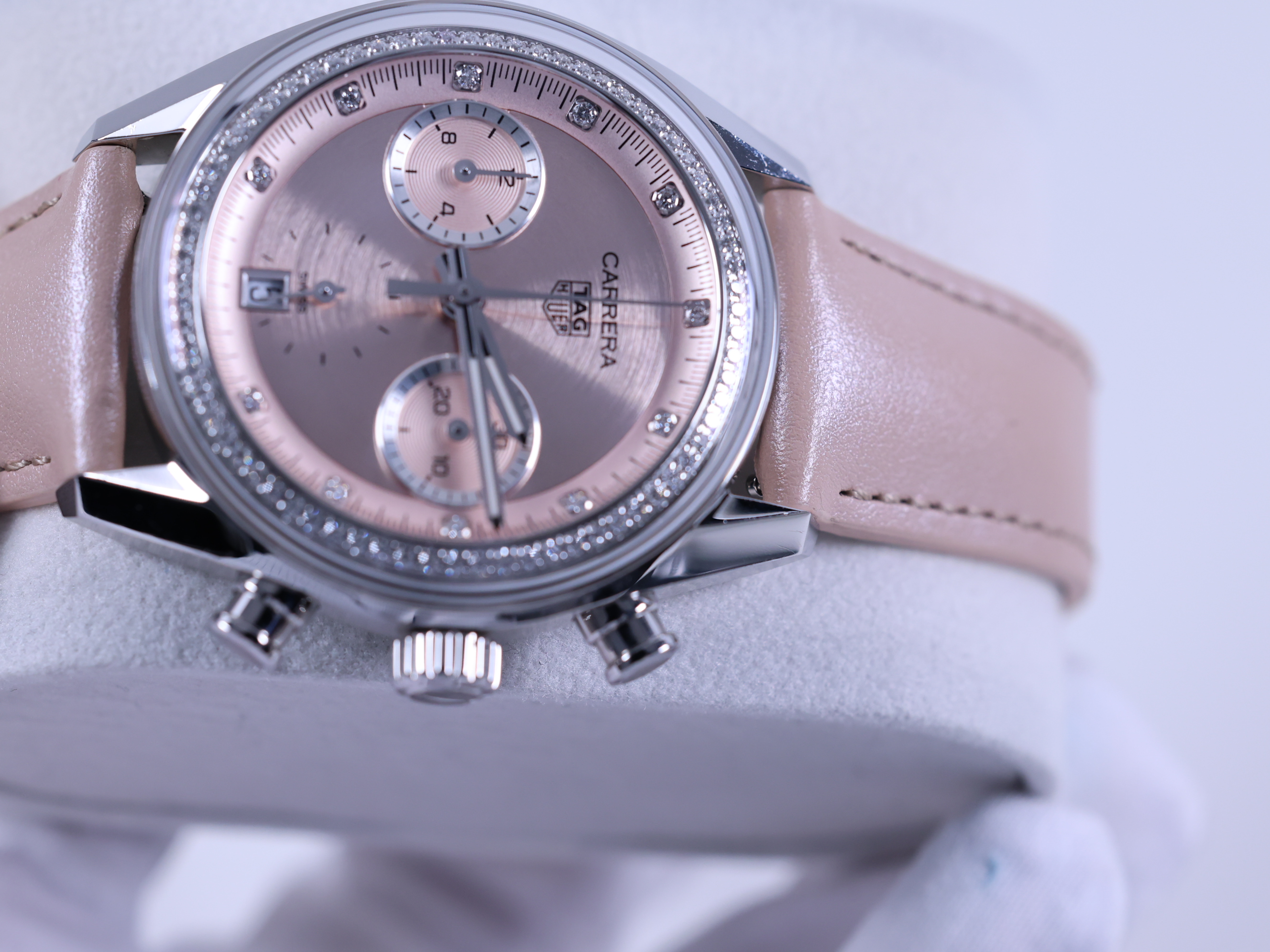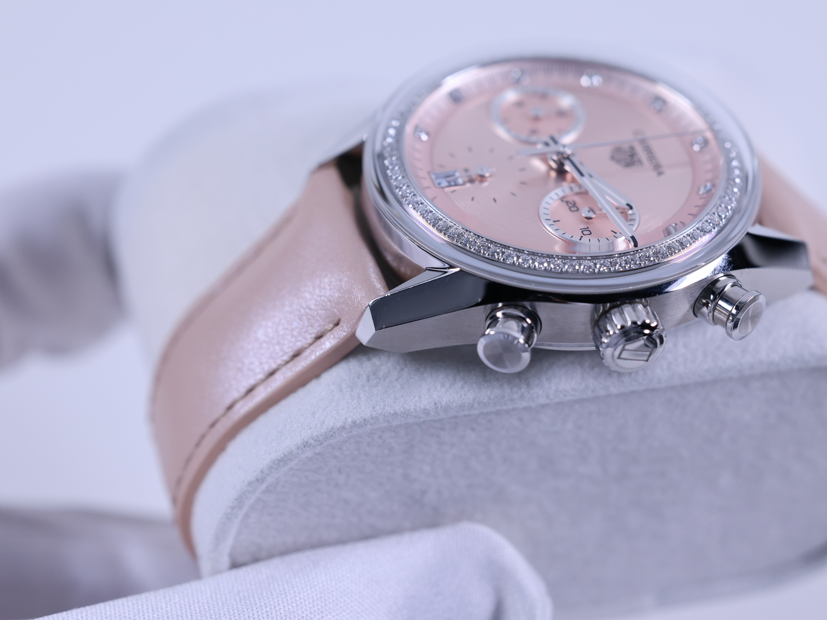 까레라 크로노그래프 핑크 스틸 다이아몬드 세팅 레이싱 남녀공용 셀프 와인딩 시스루백 씨스루백 투명 케이스백 크로노그래프 크로노 데이트,CBS2215.FC6568,핑크,스테인리스 스틸,가죽,스트랩,39mm,셀프 와인딩,TH20-00,Switzerland,Stainless steel,Folding clasp,Date,chronograph subdials,small seconds / diamond-set indices,Carrera Chronograph,까레라 크로노그래프,Carrera,TAG Heuer,태그 호이어,Date, chronograph subdials, small seconds / diamond-set indices