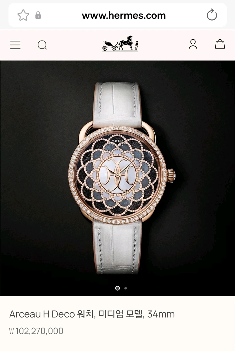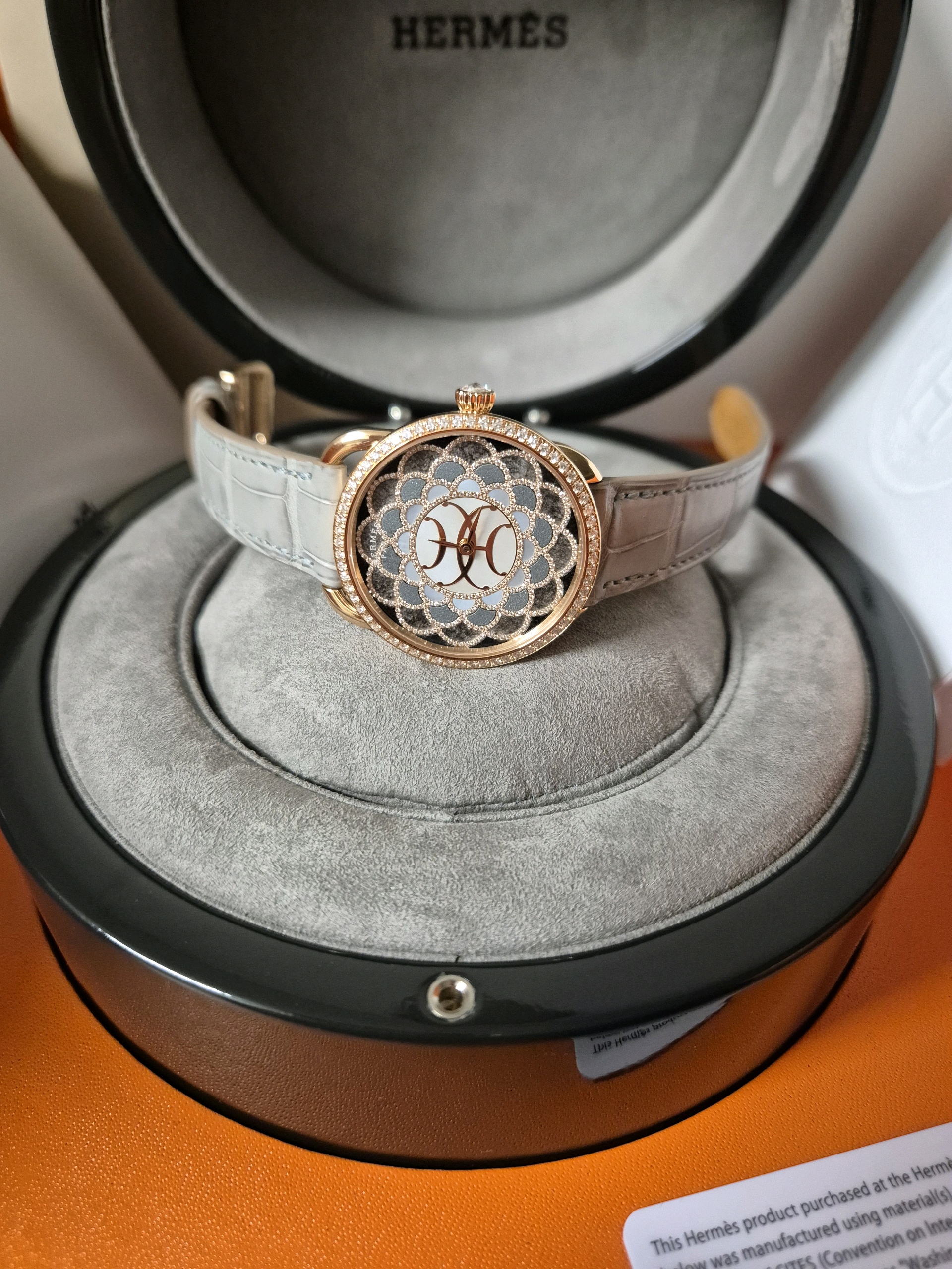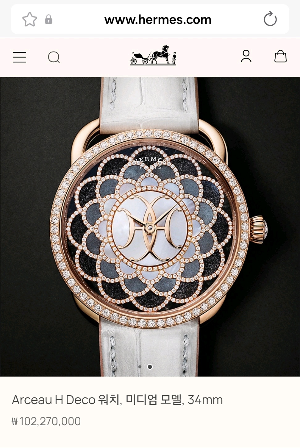 W403427WW00,에르메스 아쏘 H 아트 아르 데코 주얼리 쥬얼리 미디엄 미디움 여성 다이아 자개 로즈 골드 로골,셀프 와인딩,Rose gold + diamond,Pin buckle,No indices,Arceau H Deco,아쏘 H 데코,Arceau,Hermes,에르메스