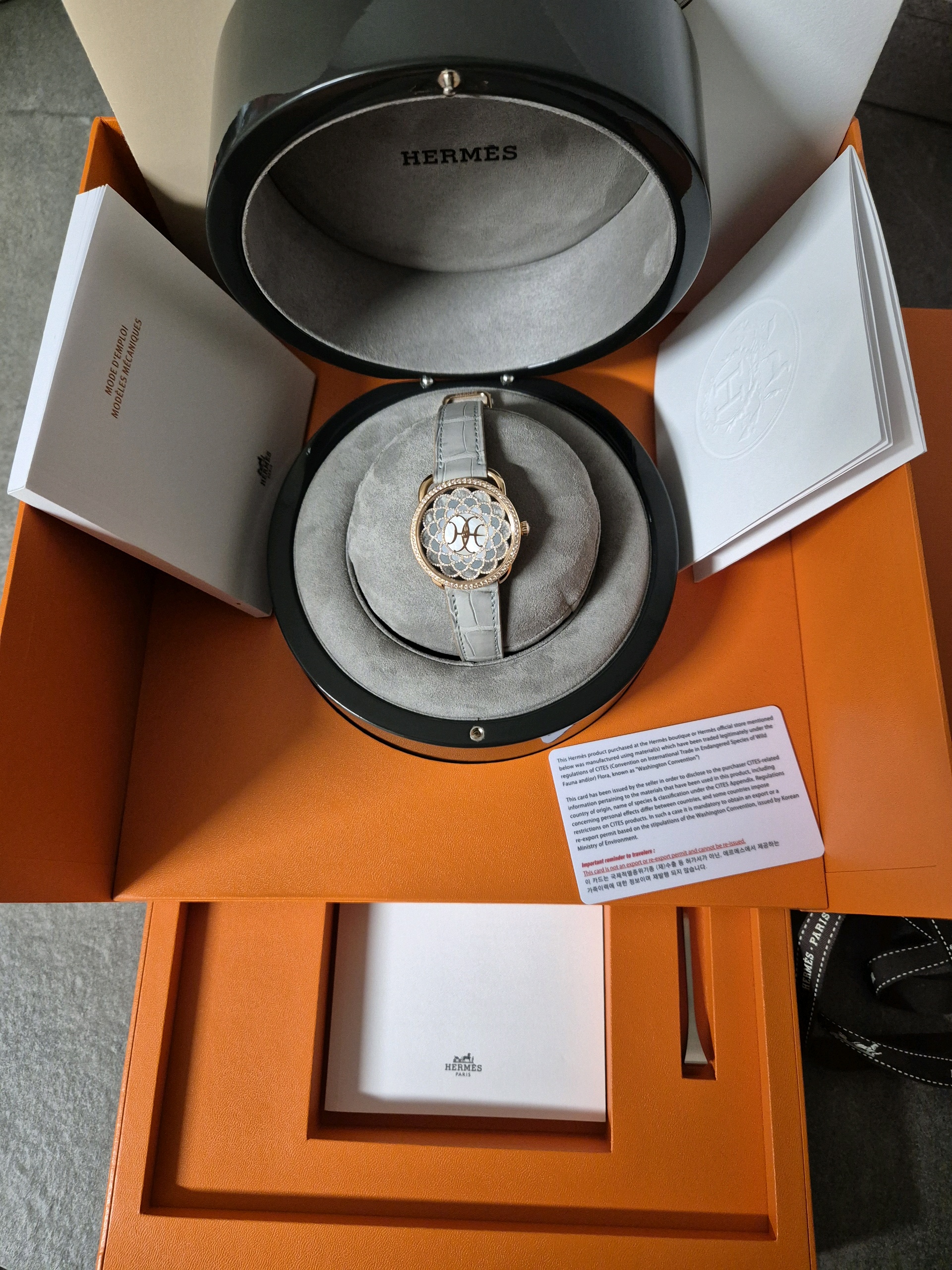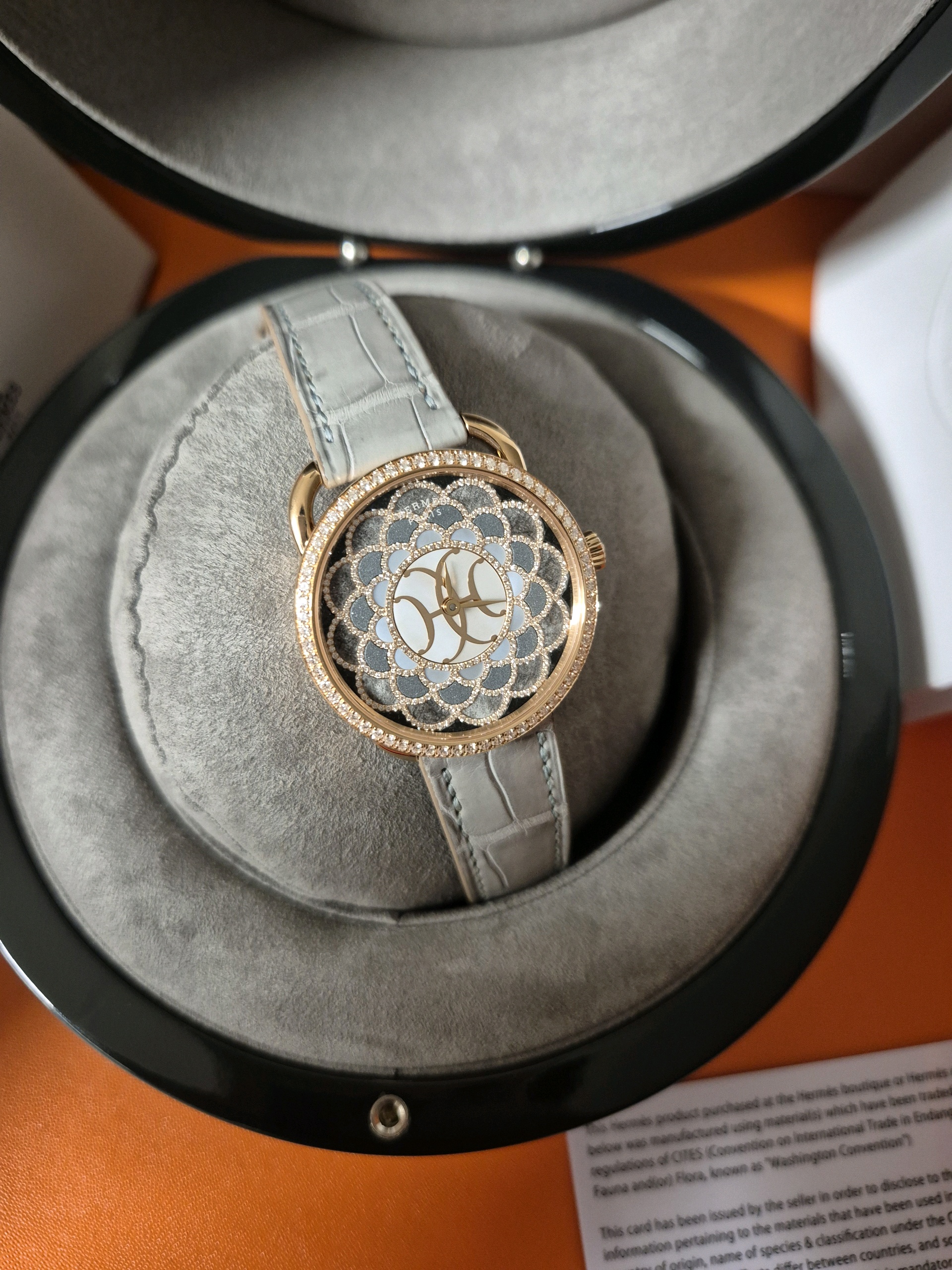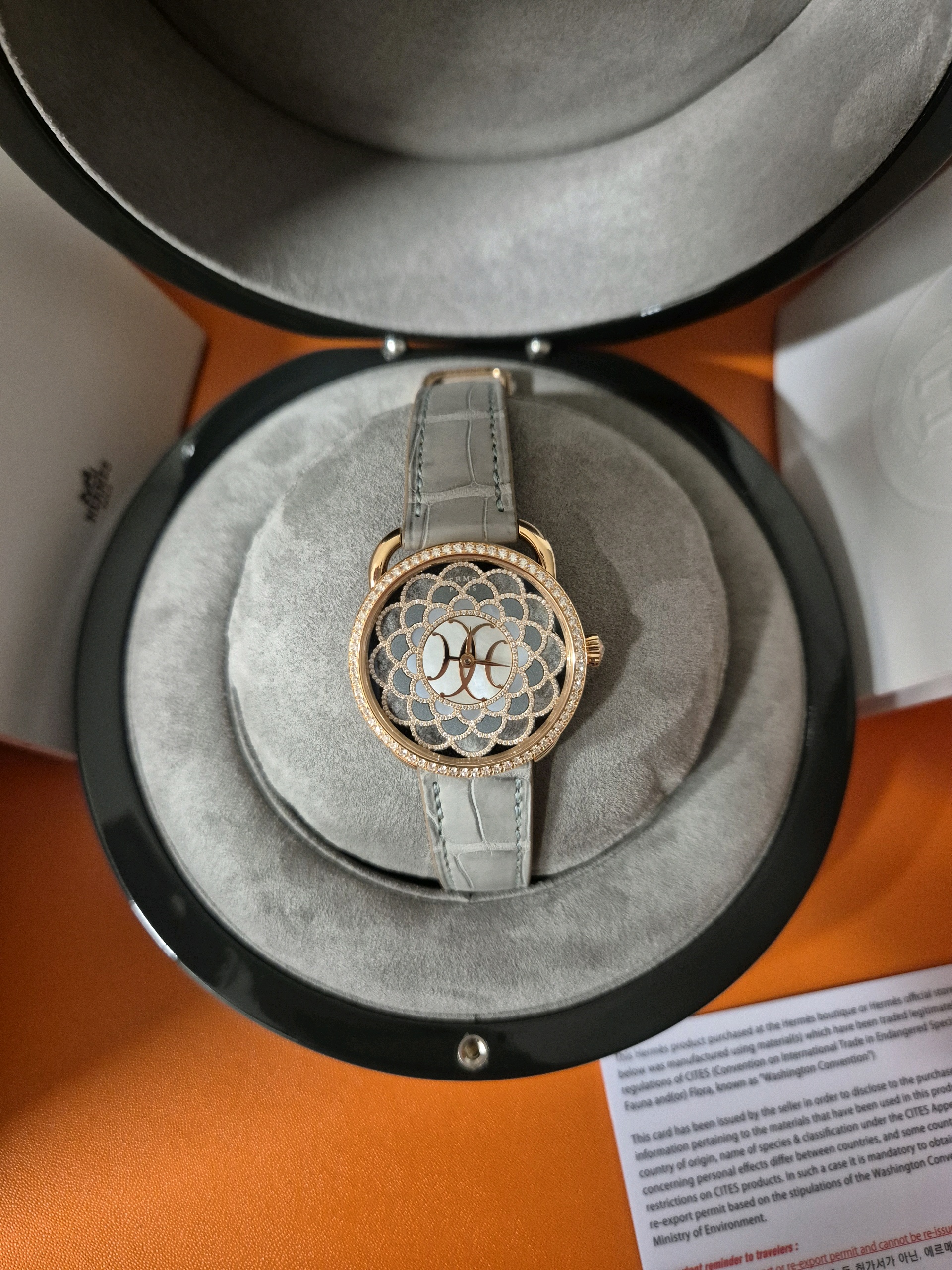 W403427WW00,에르메스 아쏘 H 아트 아르 데코 주얼리 쥬얼리 미디엄 미디움 여성 다이아 자개 로즈 골드 로골,셀프 와인딩,Rose gold + diamond,Pin buckle,No indices,Arceau H Deco,아쏘 H 데코,Arceau,Hermes,에르메스