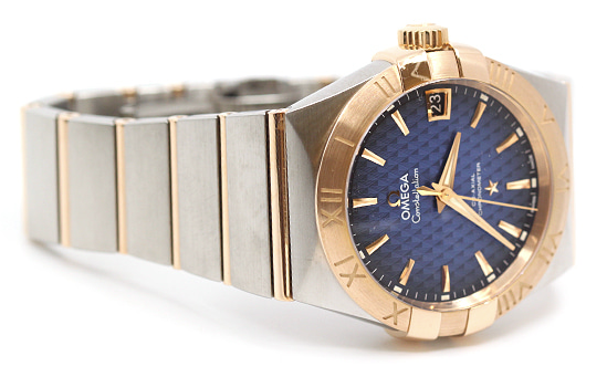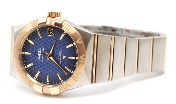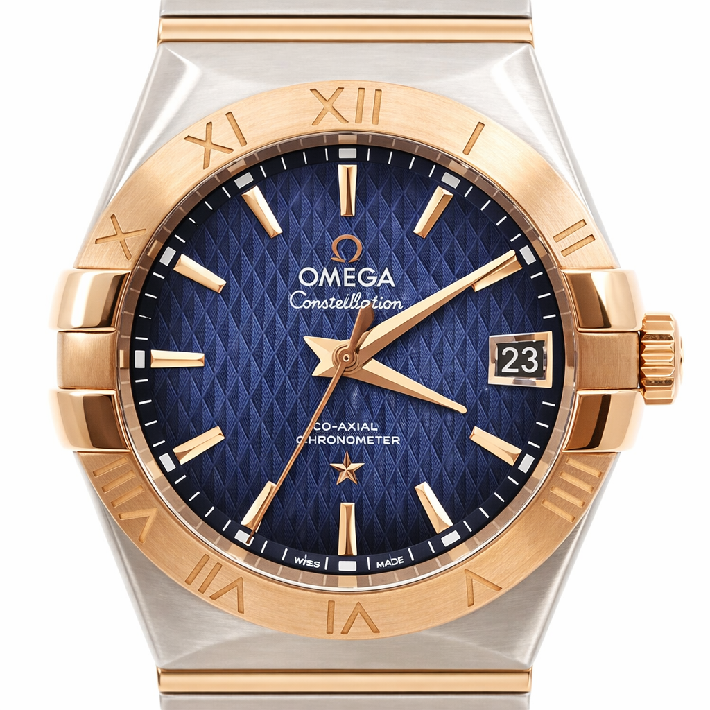 오메가 컨스텔레이션 컨스틸레이션 그리프스 블루 로젠지 패턴 스틸 레드 로즈 골드 로골 스틸 투톤 38 38mm 그리프스 오토매틱 셀프와인딩,Omega constellation griffes blue steel red rose gold steel two tone blue,123.20.38.21.03.001,블루,스테인리스 스틸,레드 골드,38mm,셀프 와인딩,Omega 8500,Switzerland,Red gold,Folding clasp,Date / applied trapezoidal indices,Constellation,컨스텔레이션,Omega,오메가,스테인리스 스틸, 레드 골드