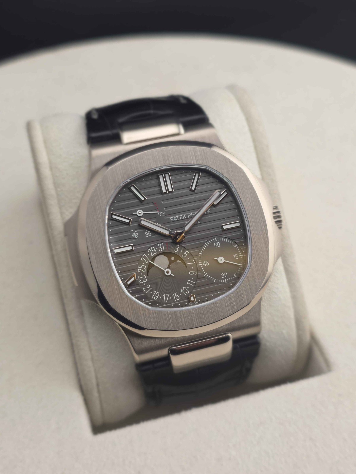 5712G-001,Nautilus Moonphases,노틸러스 문페이즈,Nautilus,Patek Philippe,파텍필립,PP Patek Philippe Nautilus Moonphases moonphase 40mm white gold strap 5712G 5712,PP 파텍필립 파텍 필립 노틸러스 문페이즈 문 페이즈 40mm 화이트골드 화이트 골드 스트랩 5712G 5712,그레이,화이트 골드,셀프 와인딩,Switzerland,White gold,Deployant folding clasp,Small seconds,date indicator with moonphase,power reserve / applied baton indices,Nautilus Moon Phases,Small seconds, date indicator with moonphase, power reserve / applied baton indices