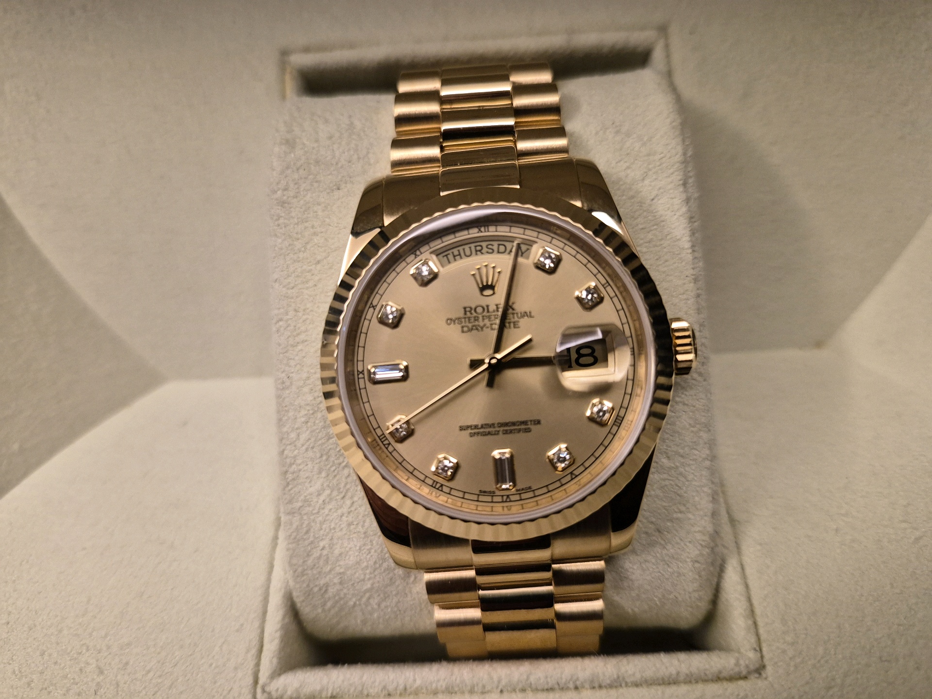 day-date36,118238,m118238-0116,샴페인,다이아몬드,옐로우 골드,프레지던트 브레이슬릿,사파이어 크리스탈,36mm,데이데이트,데데,데이트,옐로우골드,옐골,금통,금장,어버이날 선물,50대 추천,단종,Rolex,다이아몬드 세팅,Switzerland,Yellow gold,Hidden folding clasp,Day,date / diamond-set indices,Hour + minute + seconds,Day-Date 36,데이데이트 36,Day-Date,롤렉스,Day, date / diamond-set indices