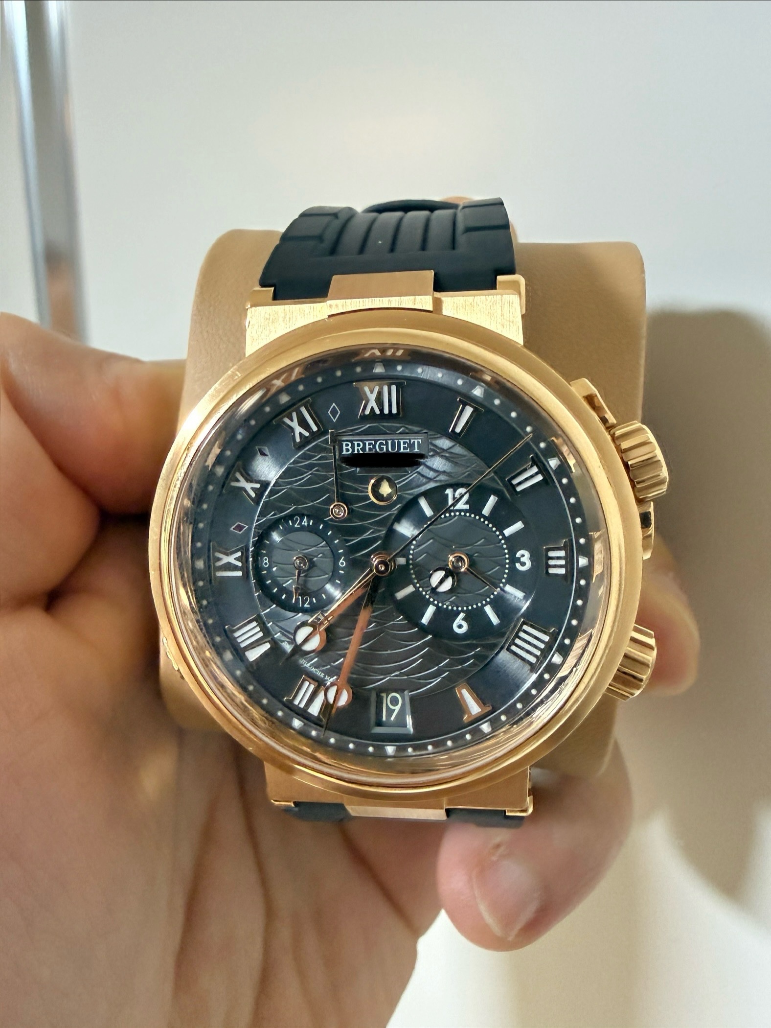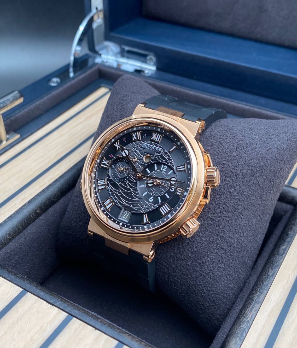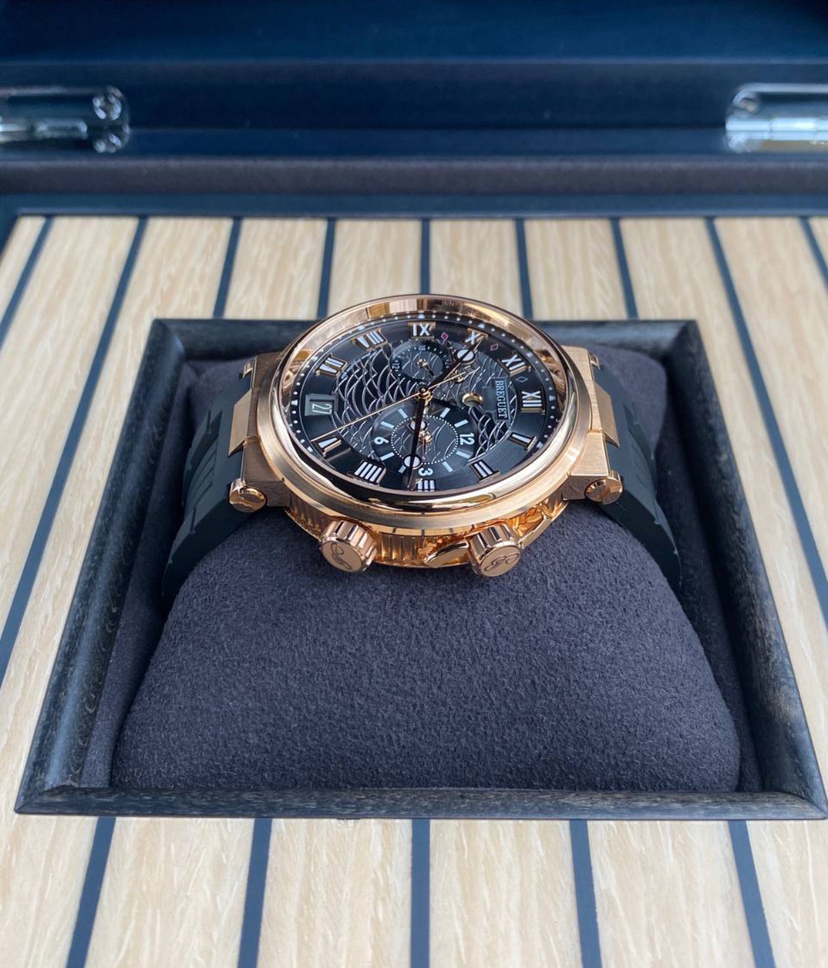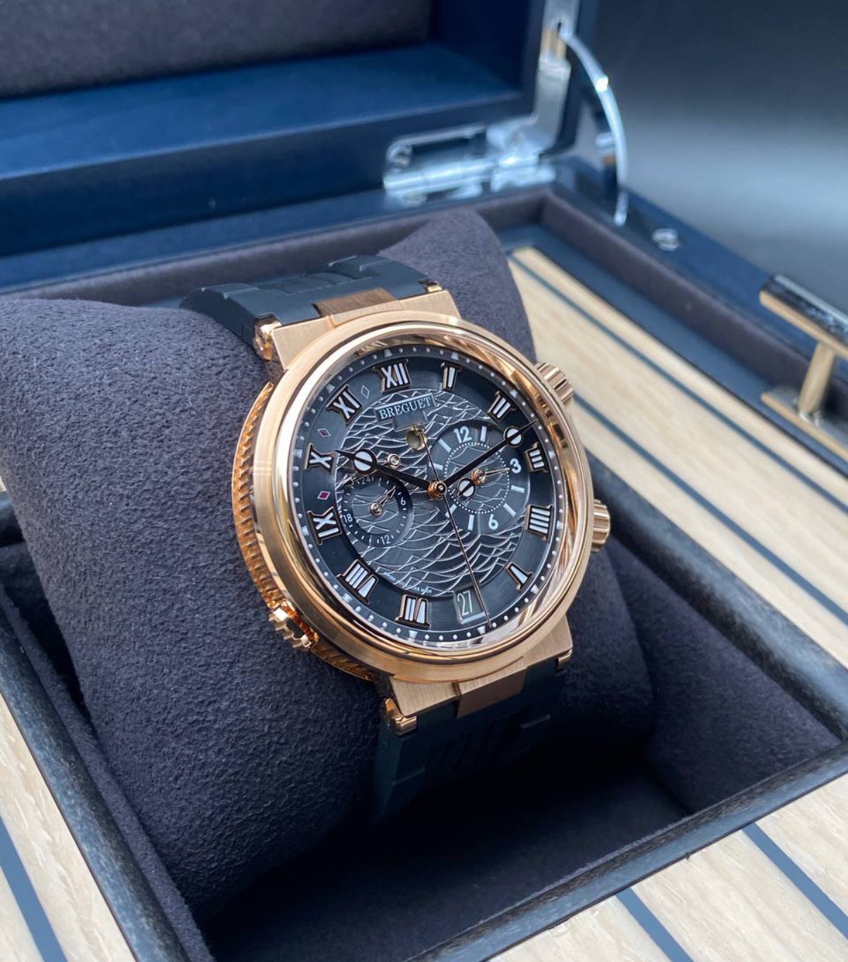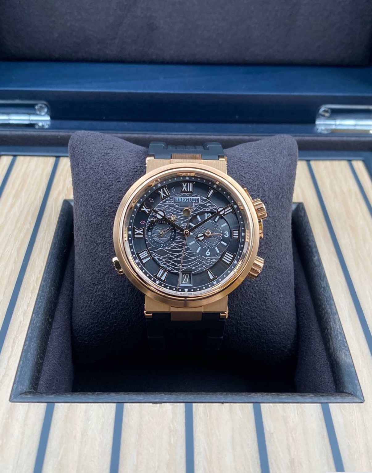브레게 특유의 뮤지컬 알람 기능이 탑재된 마린 라인의 상위 사양 모델입니다.