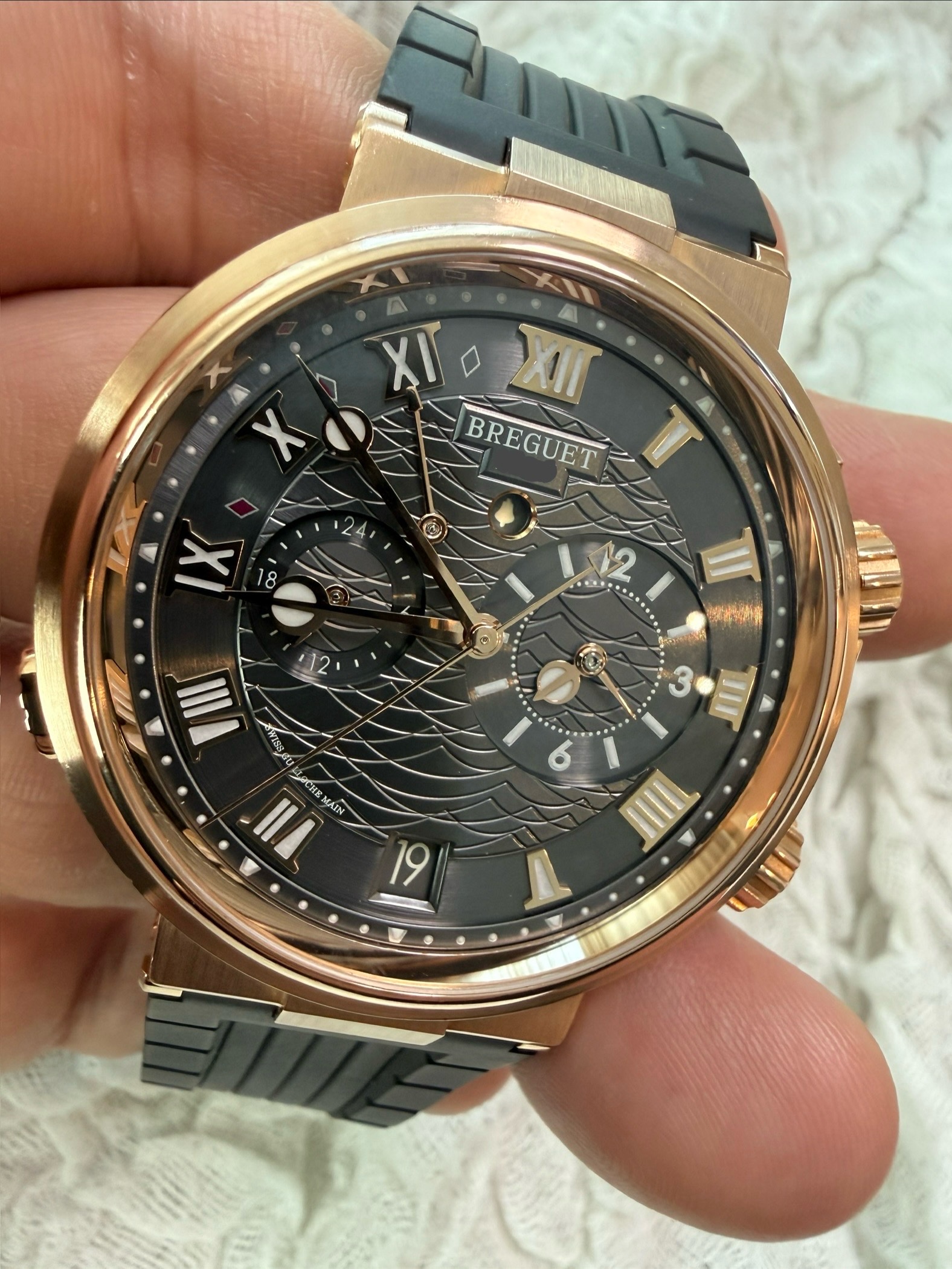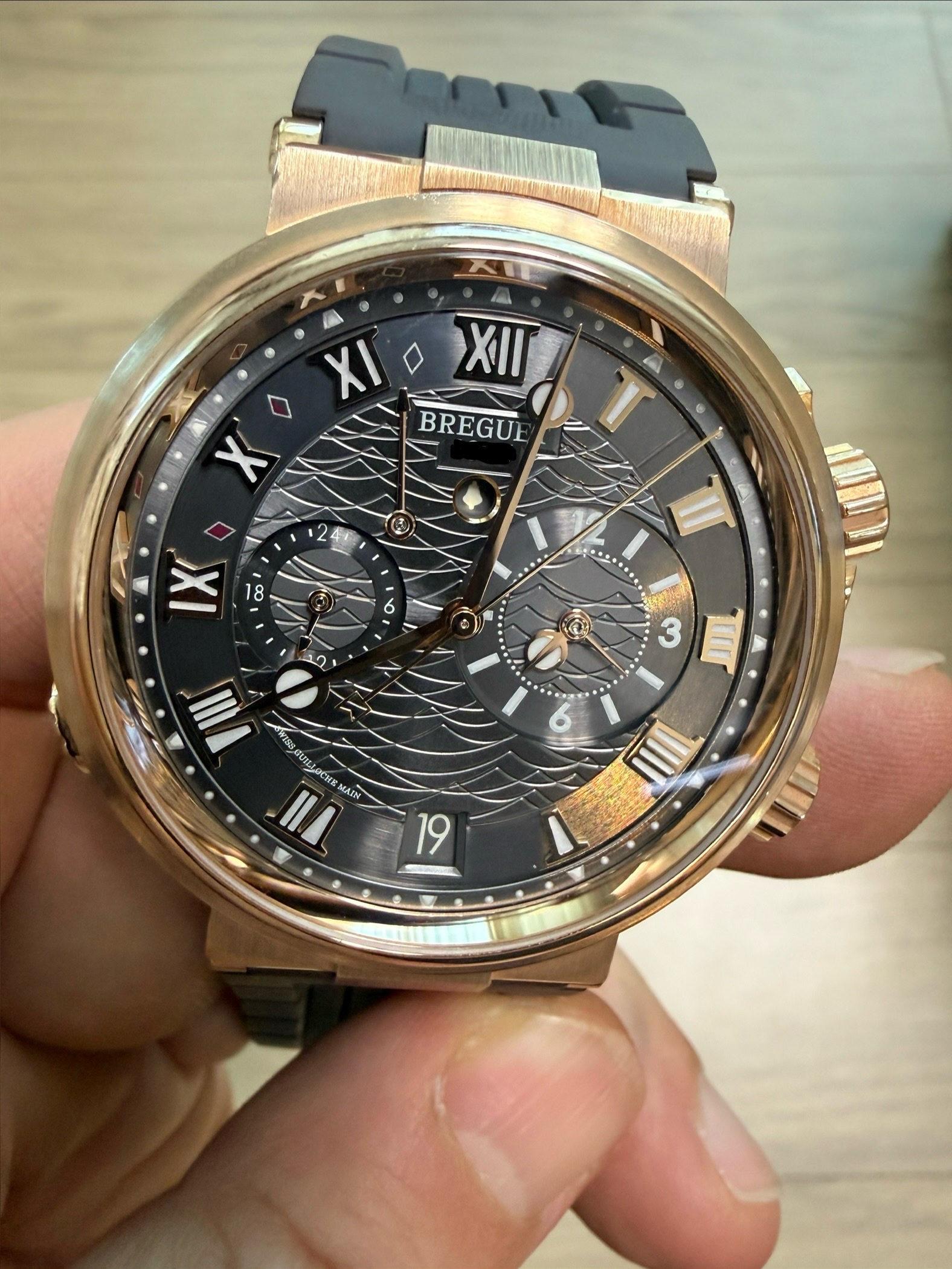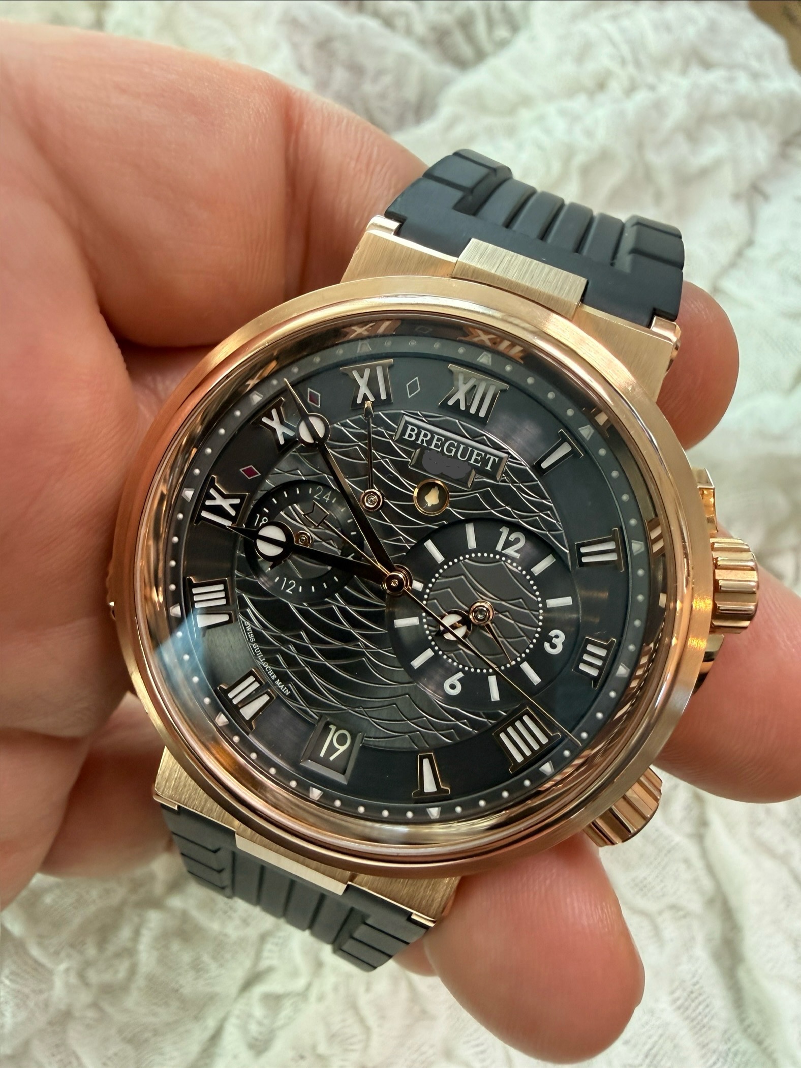 5547BR/G3/5ZU,슬레이트 그레이,로즈 골드,러버,스트랩,40mm,셀프 와인딩,Cal. 519F/1,Switzerland,Rose gold,Deployant folding clasp,Date,alarm,alarm power reserve,on/off,second time zone / roman numeral indices,Marine Alarme Musicale,마린 알람 뮤지컬,Marine,Breguet,브레게,Date, alarm, alarm power reserve, on/off, second time zone / roman numeral indices