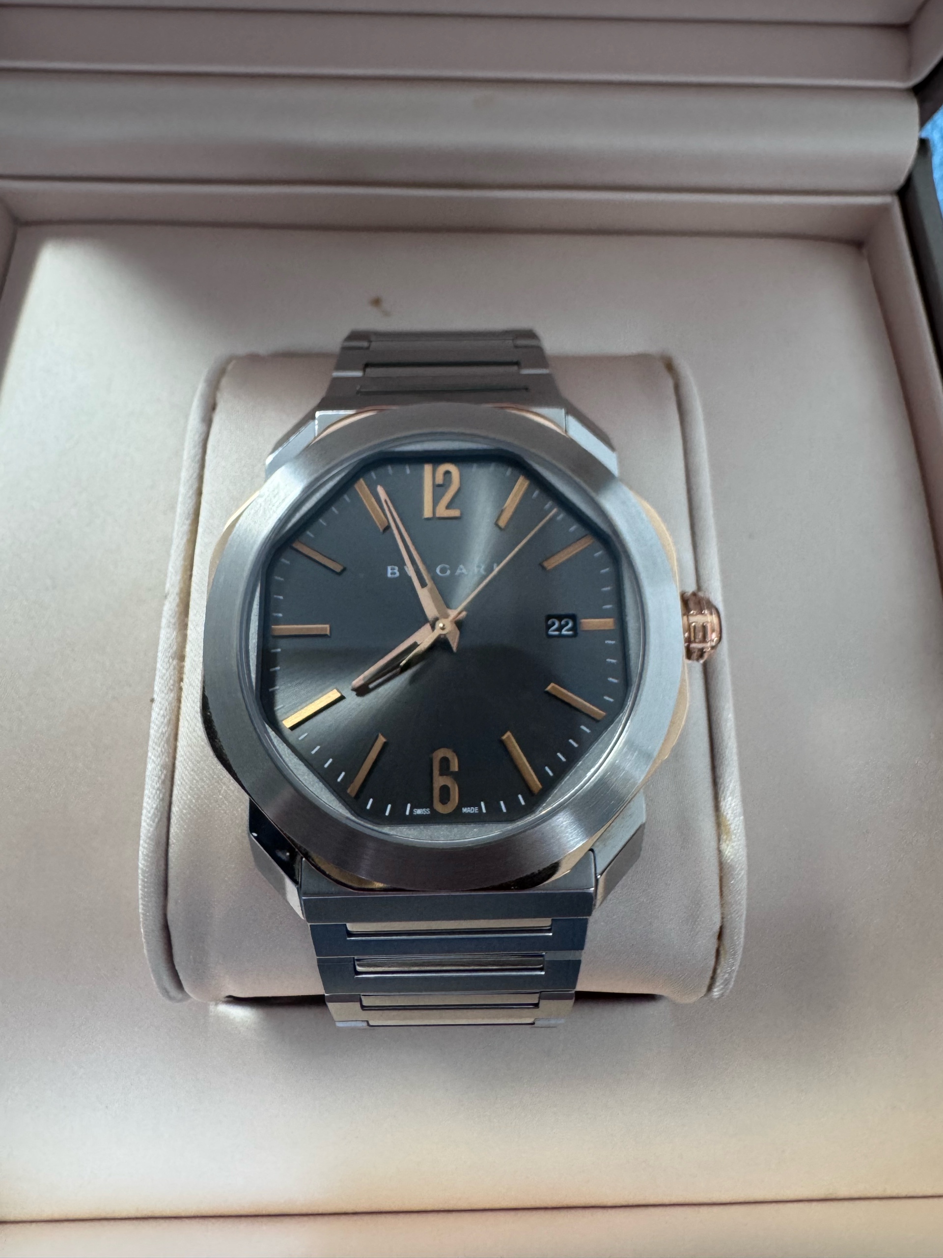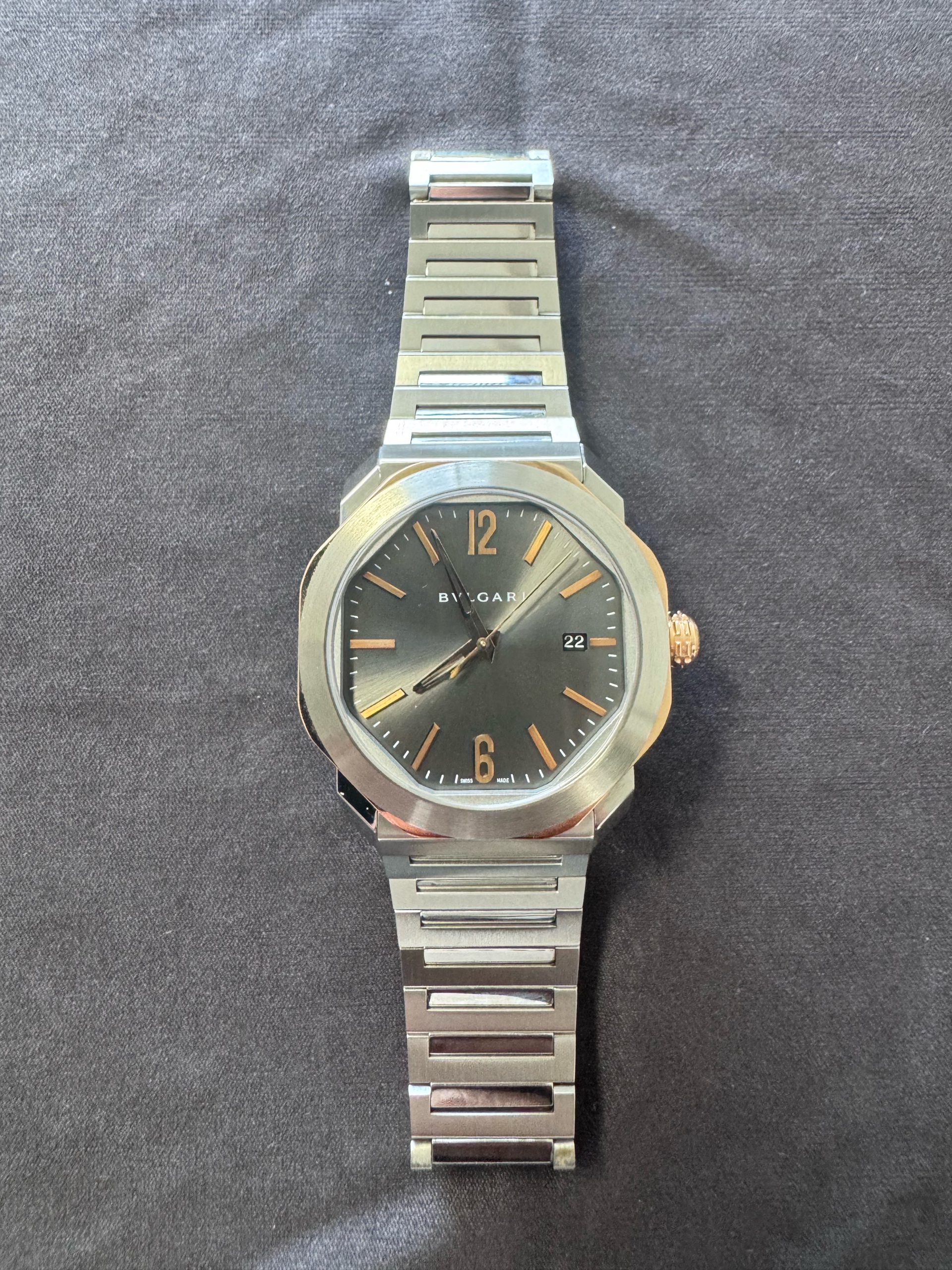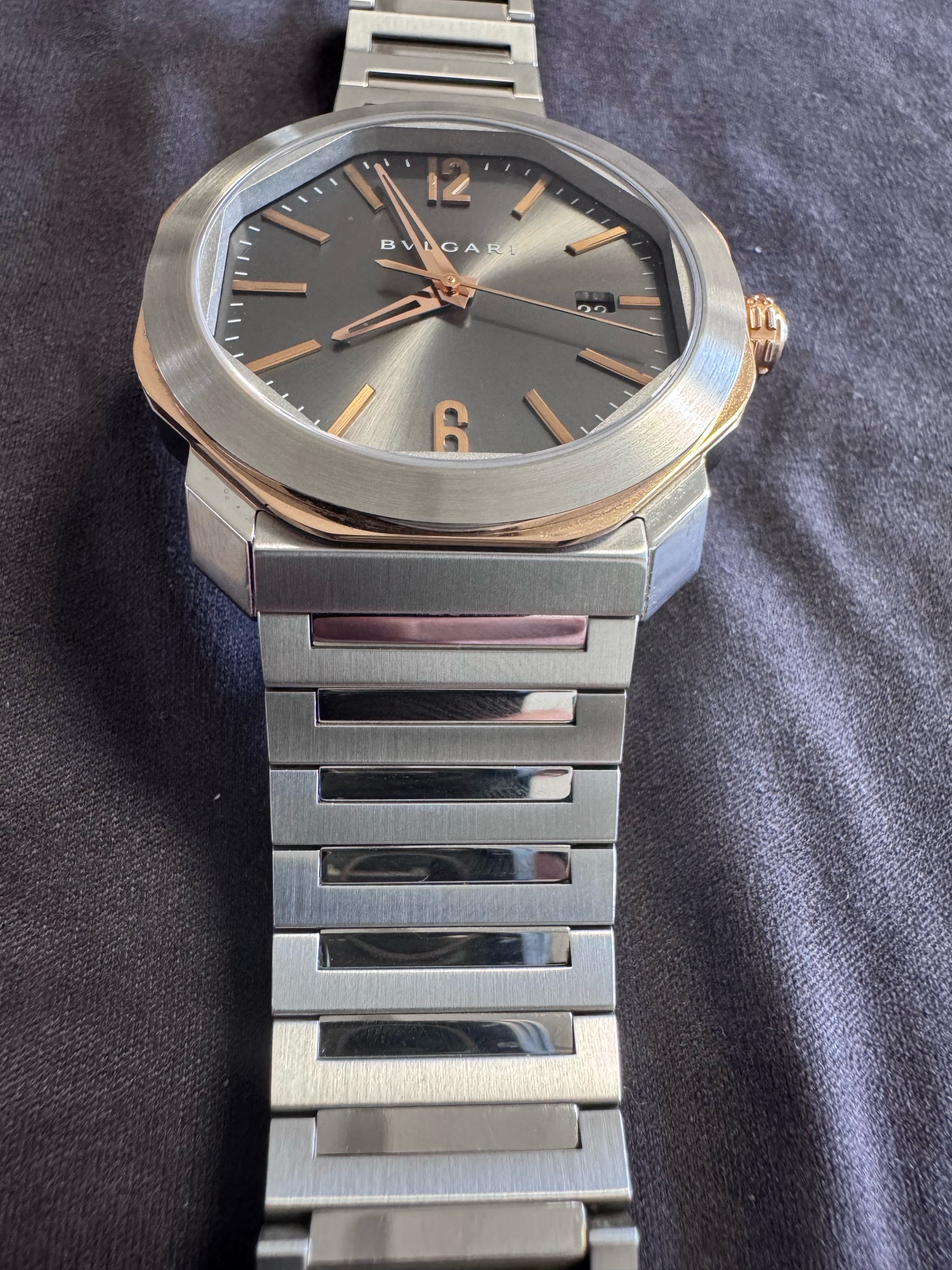 불가리 옥토 로마 옥토로마 스틸 그레이 스틸 골드 투톤 103083,Bvlgari Bulgari Octo Roma steel grey gray steel gold two tone 103083,그레이,스테인리스 스틸,Octo Roma,옥토 로마,Octo Finissimo,Bvlgari,불가리,셀프 와인딩,Rose gold + ceramic,Butterfly folding clasp,Date / applied arabic numerals & baton indices