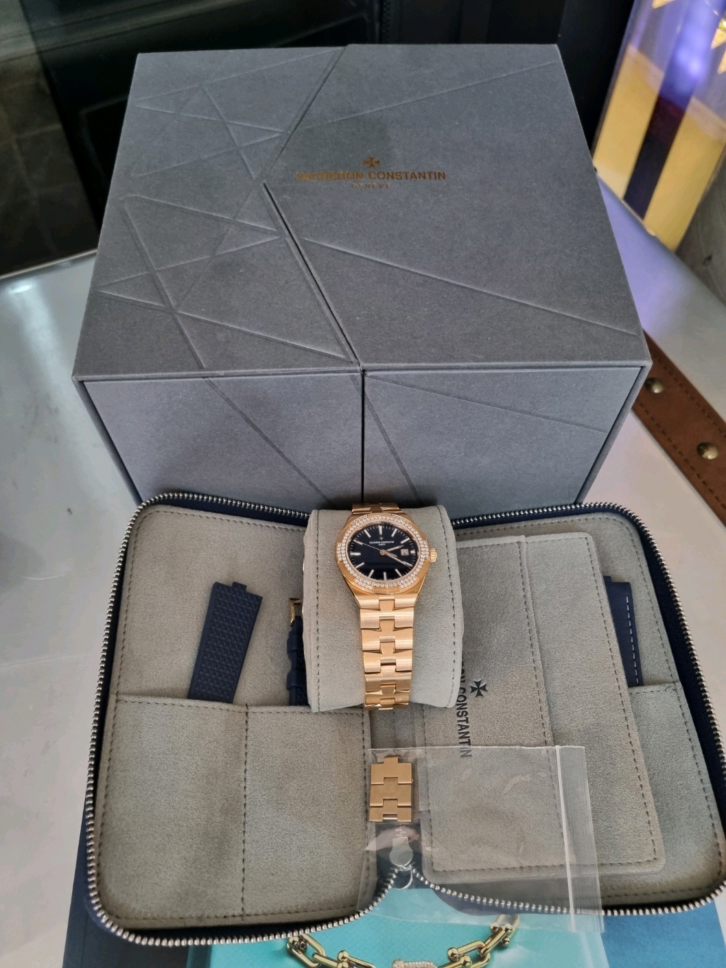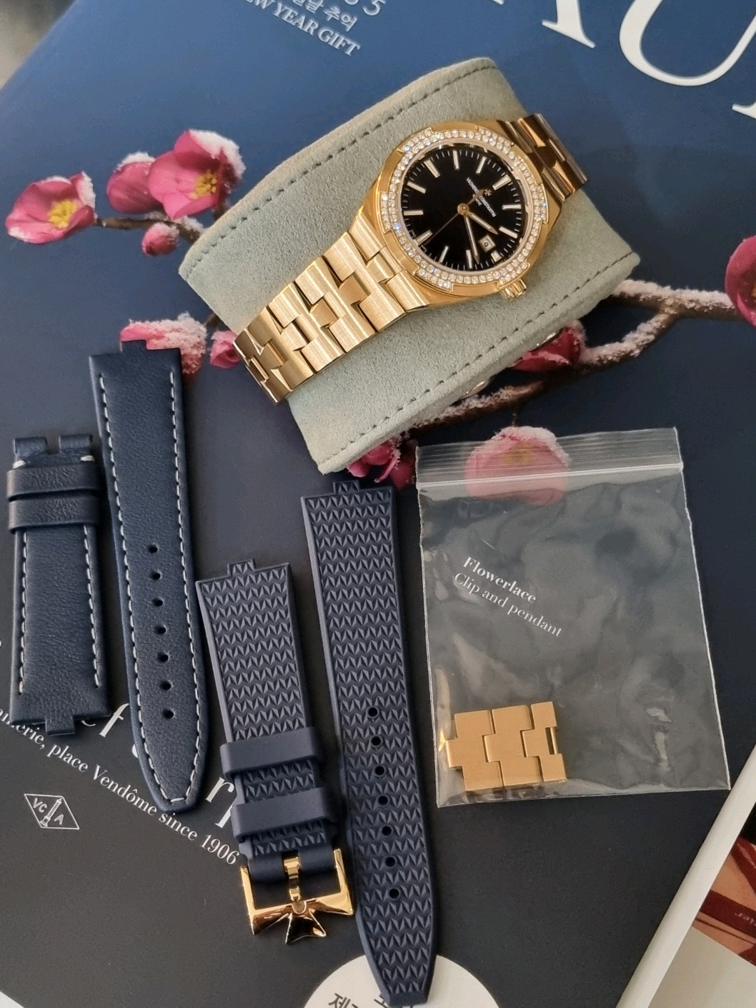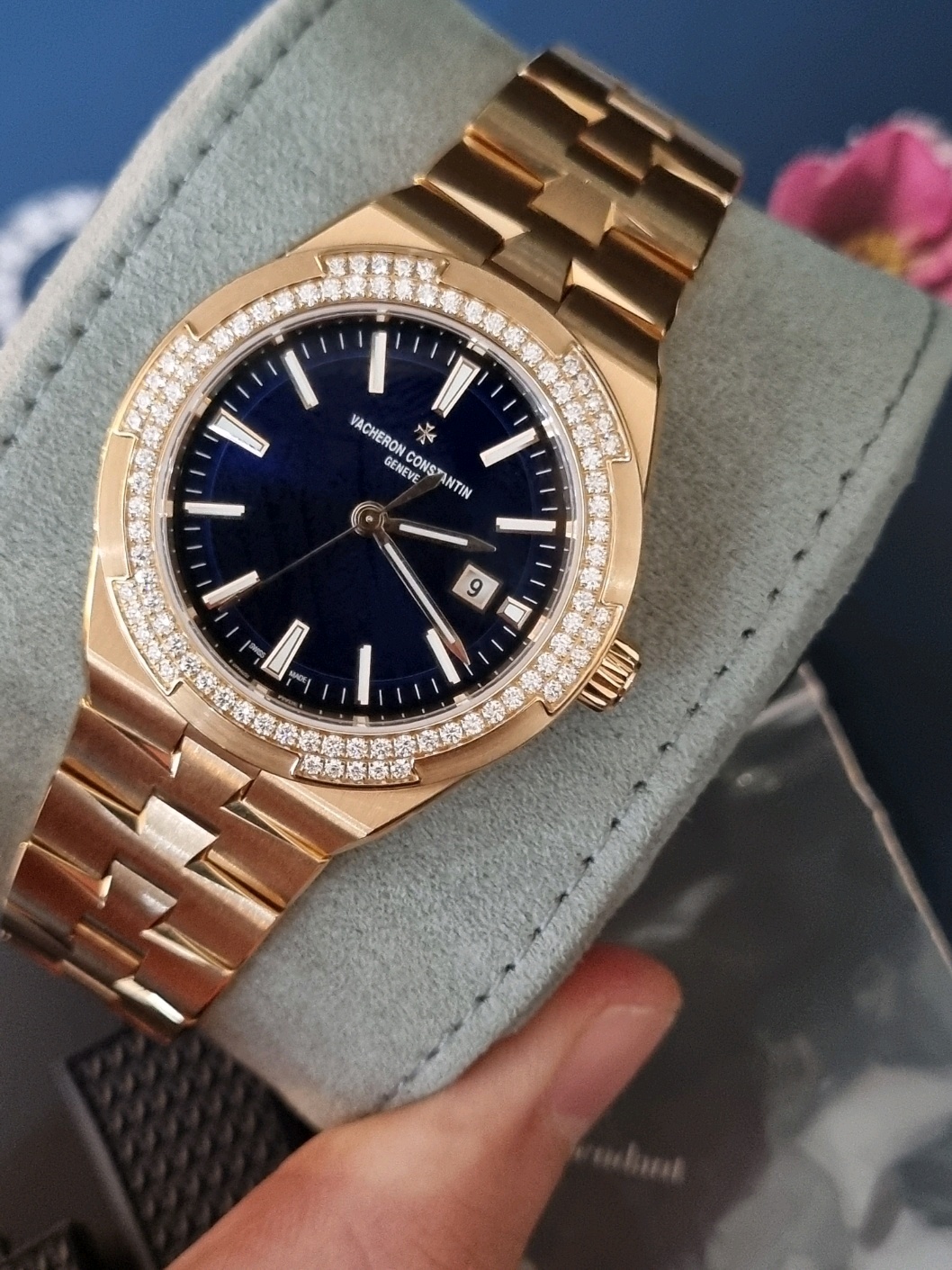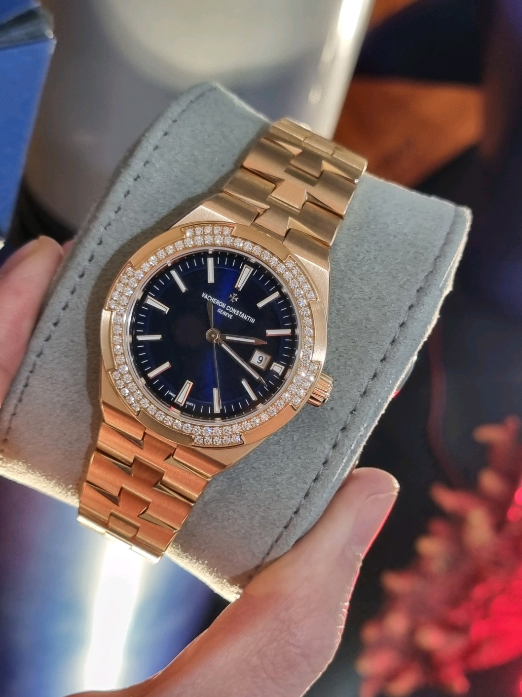 VC 바쉐론 콘스탄틴 오버시즈 셀프 와인딩 일체형 브레이슬릿 시스루백 씨스루백 시스루 씨스루 백 투명 사파이어 케이스백 블루 핑크 골드,4605V/200R-B978,블루,핑크 골드,브레이슬릿,35mm,다이아몬드 세팅,셀프 와인딩,1088/1,Switzerland,Pink gold,Folding clasp,Date / applied baton & trapezoidal indices,Overseas Self-Winding,오버시즈 셀프 와인딩,Overseas,Vacheron Constantin,바쉐론 콘스탄틴