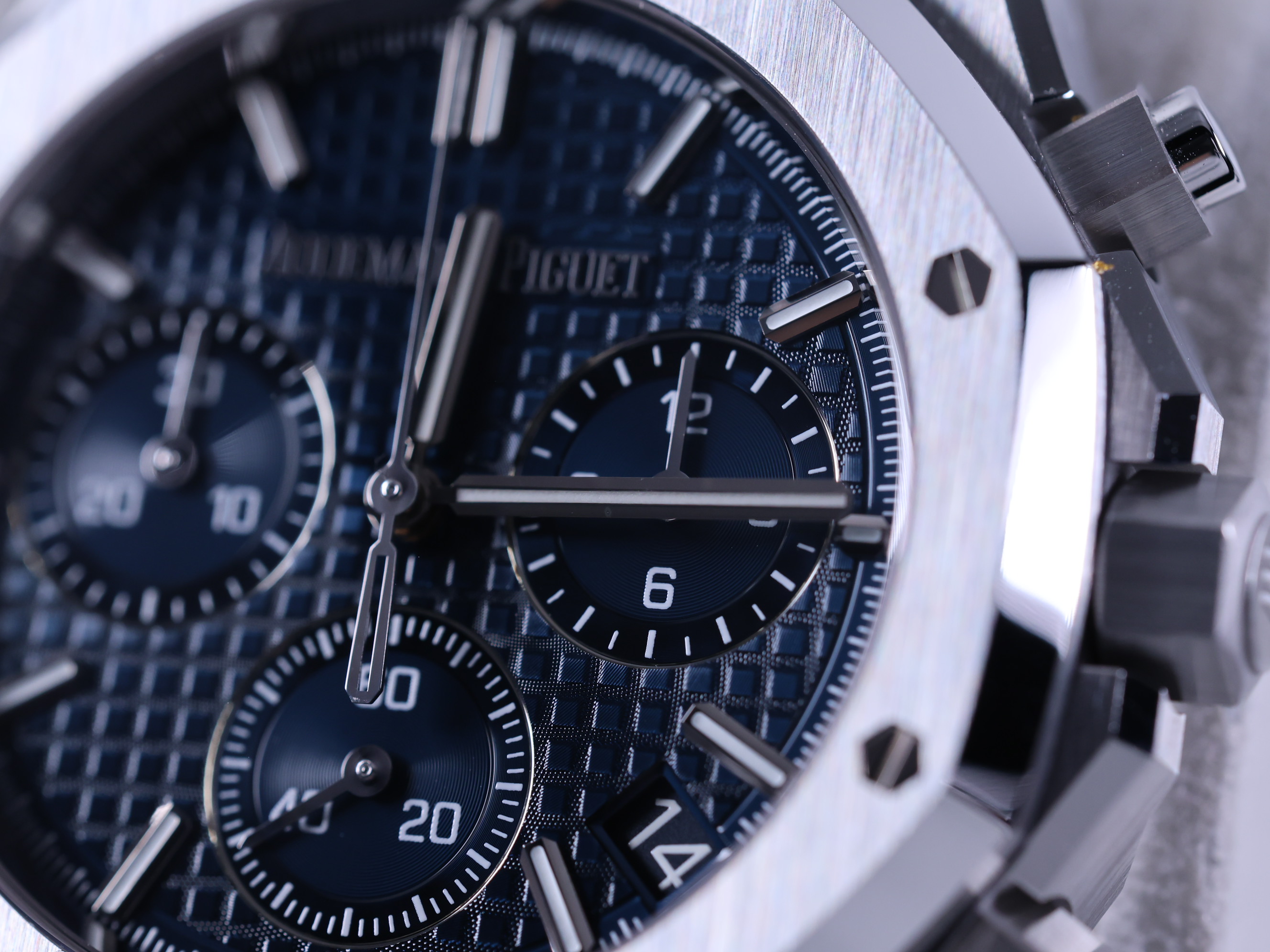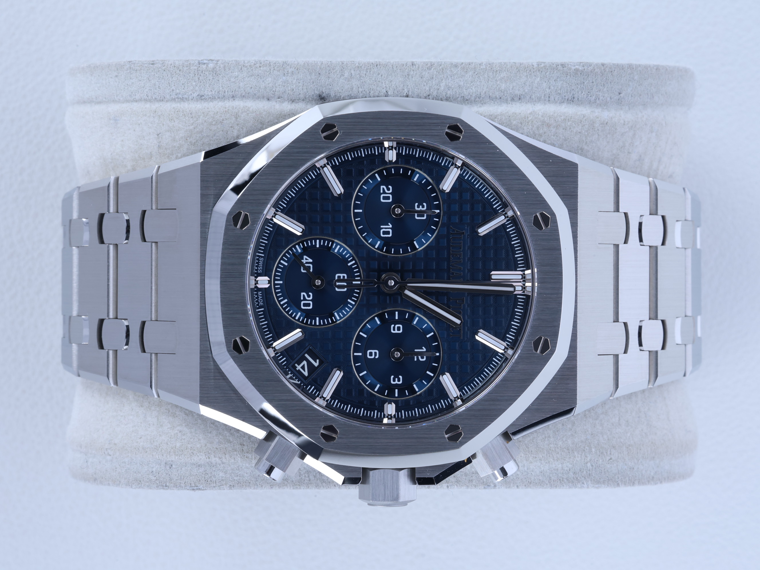 RoyalOakChronograph,26240ST.OO.1320ST.01,로열오크,로얄오크,AP,오데마,피게,팔각베젤,옥타곤,제랄드젠타,제럴드젠타,크로노,크로노그래프,블루,스테인레스스틸,사파이어크리스탈,41mm,AudemarsPiguet,스테인레스 스틸,사파이어 크리스탈,Royal Oak Chronograph,Royal Oak,Audemars Piguet,오데마 피게,오데마피게,로얄오크 크로노그래프,스테인리스 스틸,Switzerland,Stainless steel,Butterfly clasp,Date,chronograph subdials,small seconds / applied hour markers,Hour + minute + central chronograph + counter (2) + small seconds,로열 오크 크로노그래프,시스루 씨스루 백 시스루백 씨스루백 투명 사파이어 케이스백,Royal Oak Selfwinding Chronograph,Butterfly folding clasp,Date, chronograph subdials, small seconds / applied baton indices,Royal Oak