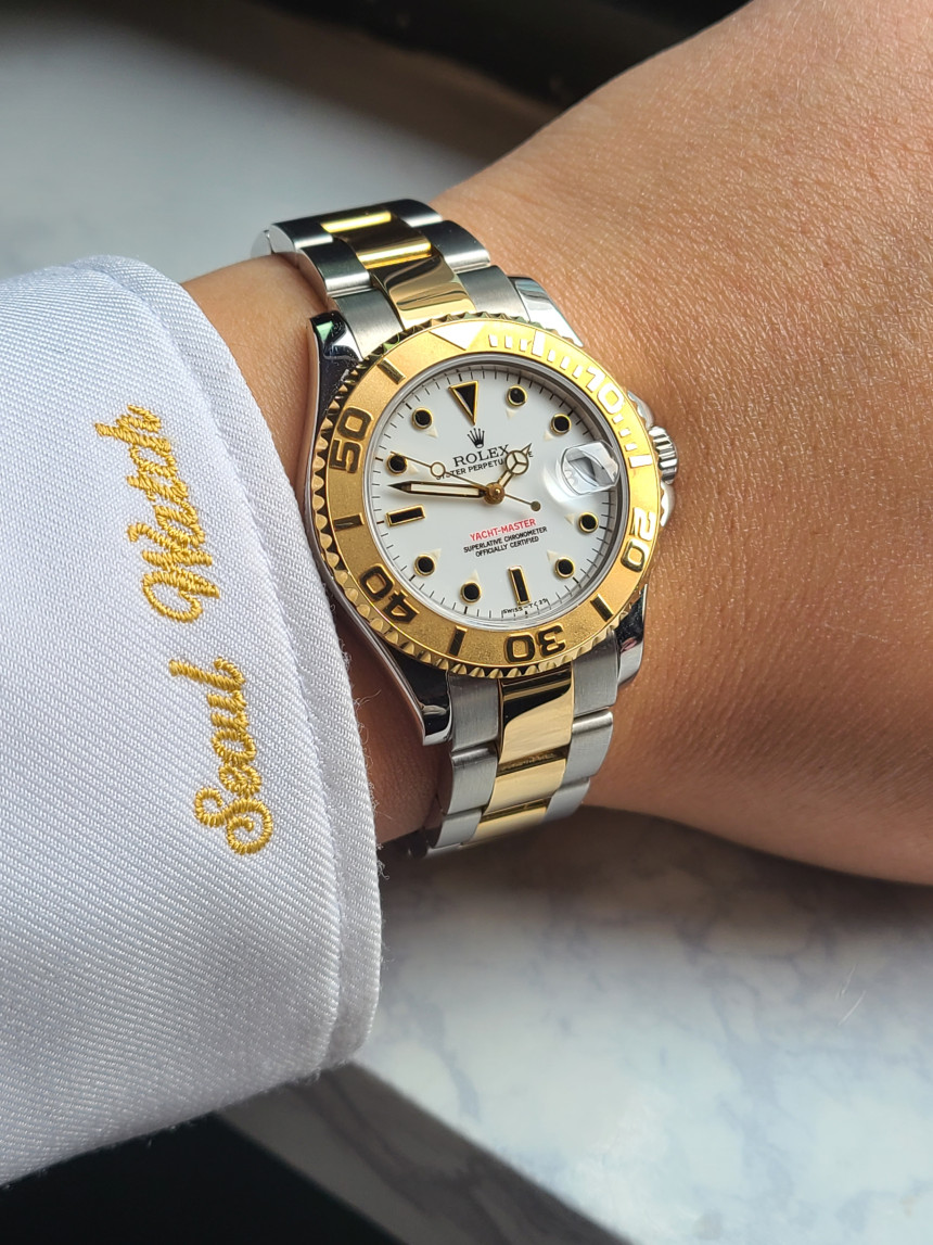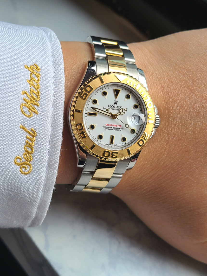멋진 롤렉스 시계 소개합니다. 롤렉스 요트마스터 화이트 다이얼 중형 18K 옐로우골드 콤비 모델 입니다. 남성용과 여성용 둘 다 착용할 수 있는 중형 미디움 사이즈로 발매되어온 요트마스터 35 입니다.