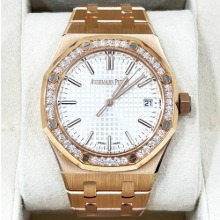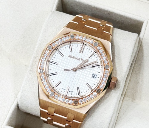 오데마피게 로얄오크 50주년 15551OR 핑크골드 금통 베젤 다이아 실버판 37mm 여성용 모델 입니다.