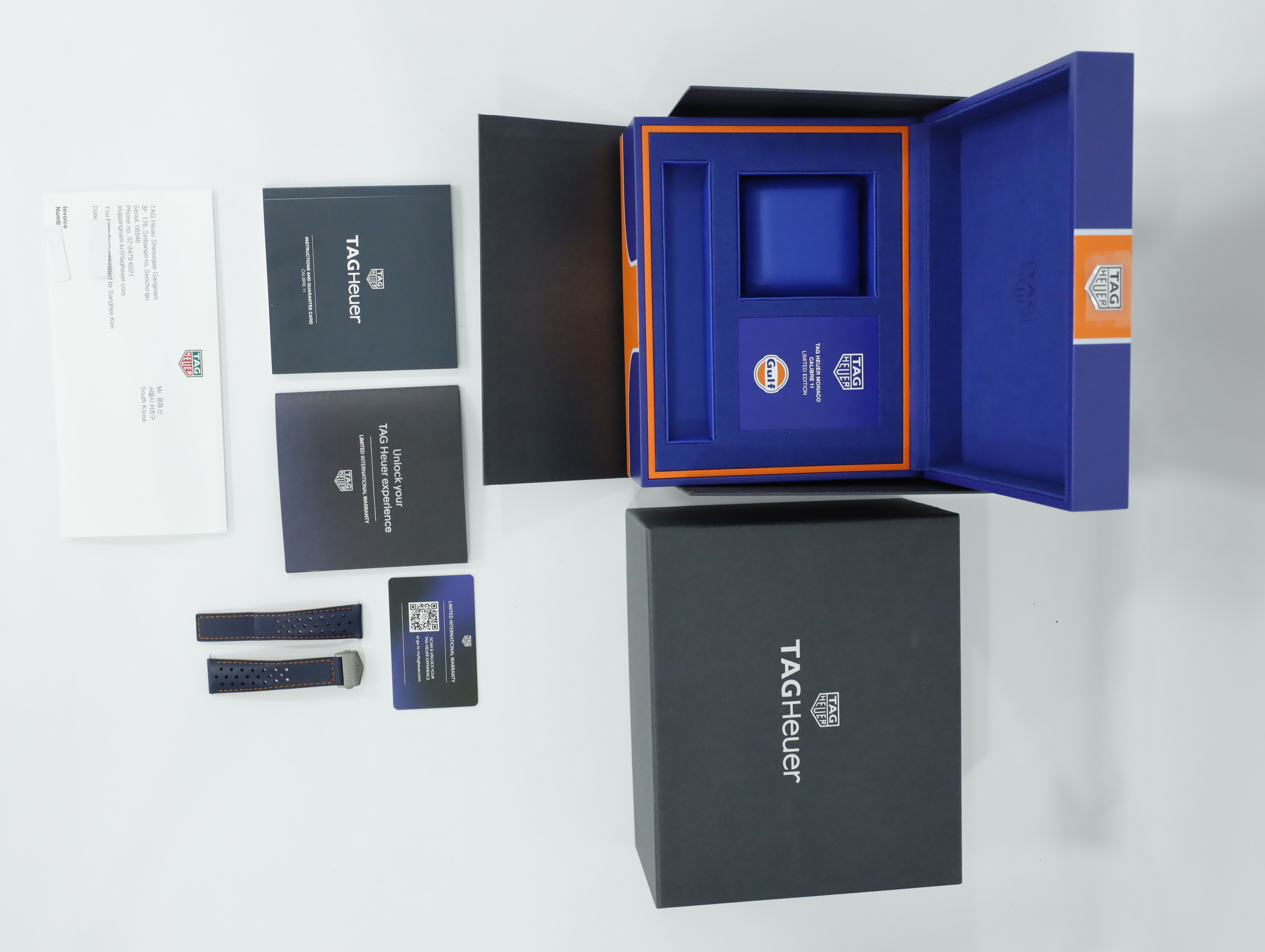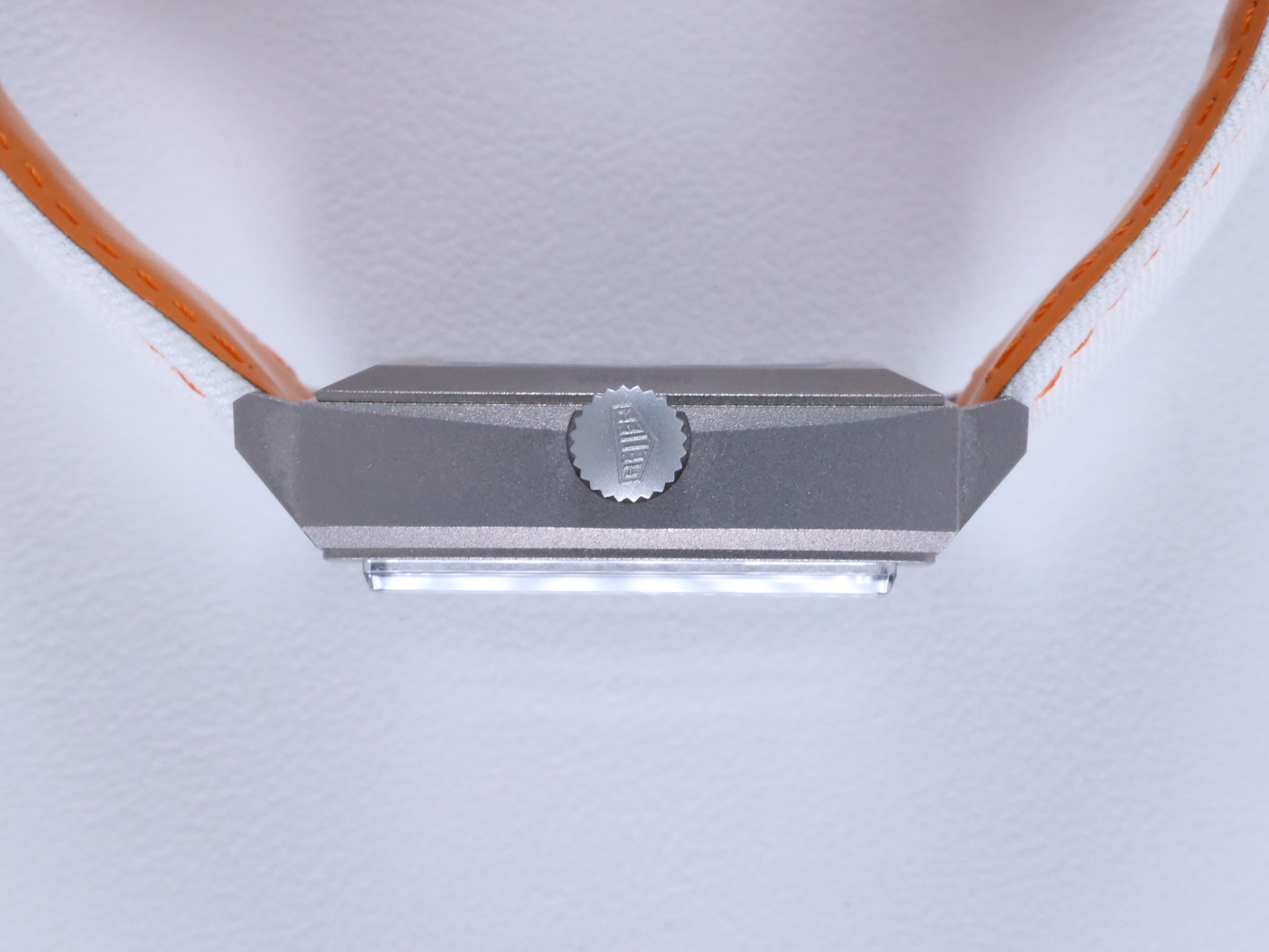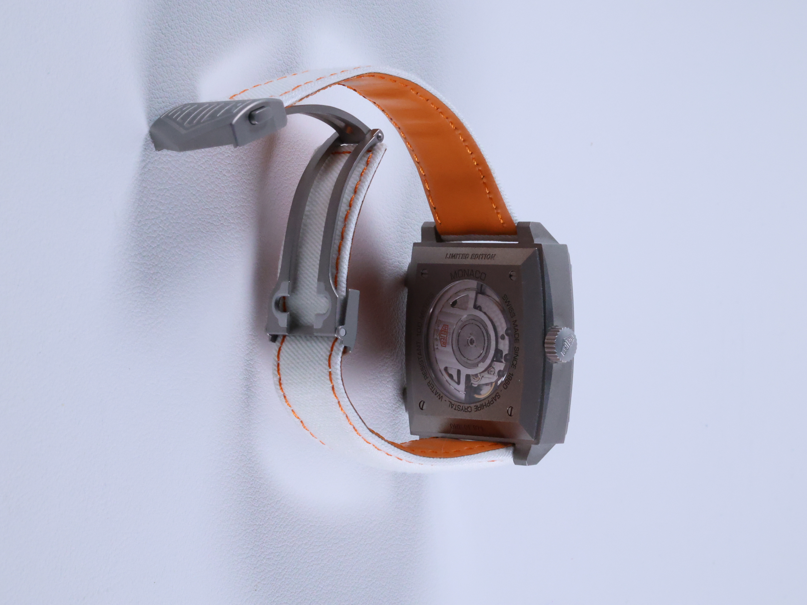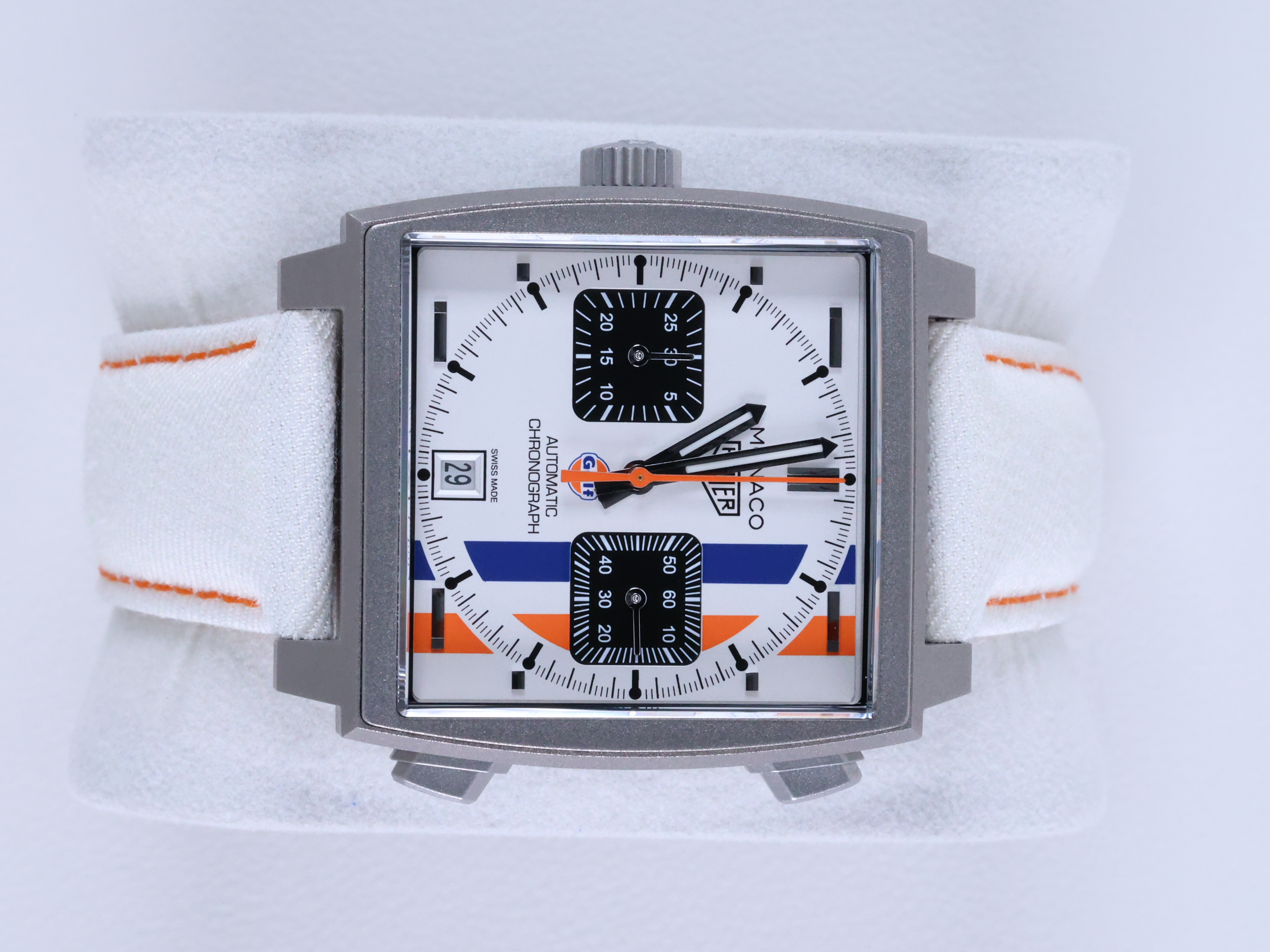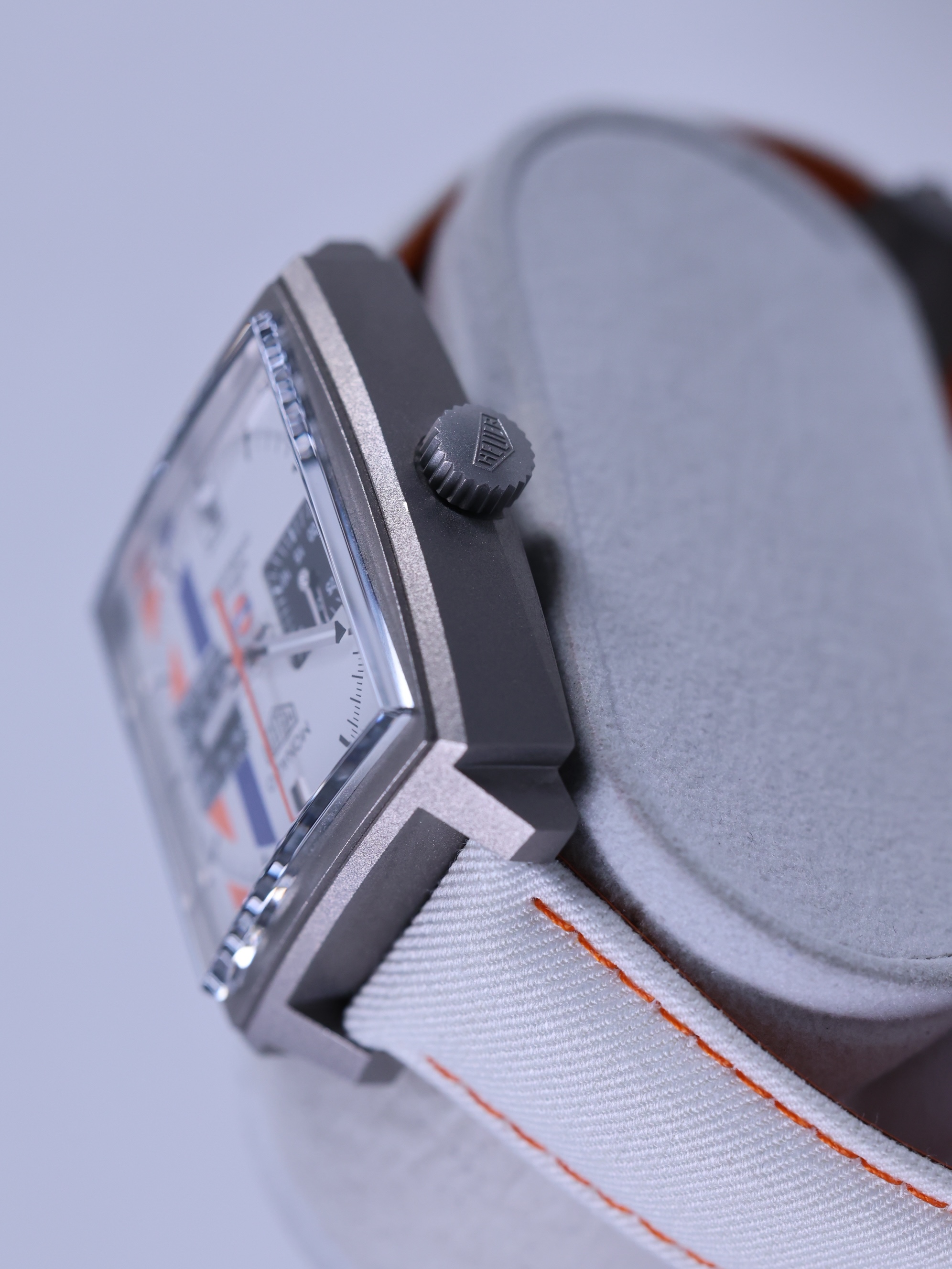 모나코 크로노그래프 X 걸프 실버 티타늄 도트 레이싱 에디션 남녀공용 셀프 와인딩 사각형 시스루백 씨스루백 투명 케이스백 크로노그래프 크로노 데이트,CAW218G.EB0393,실버,티타늄,가죽,스트랩,셀프 와인딩,Caliber 11 Automatic,Switzerland,Titanium,Folding clasp,Date,chronograph subdial,small seconds / dotted & baton indices,Monaco Chronograph X Gulf,모나코 크로노그래프 X 걸프,Monaco,TAG Heuer,태그 호이어,Date, chronograph subdial, small seconds / dotted & baton indices