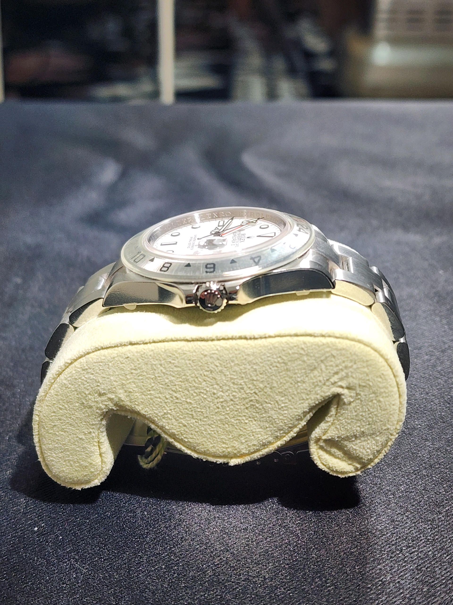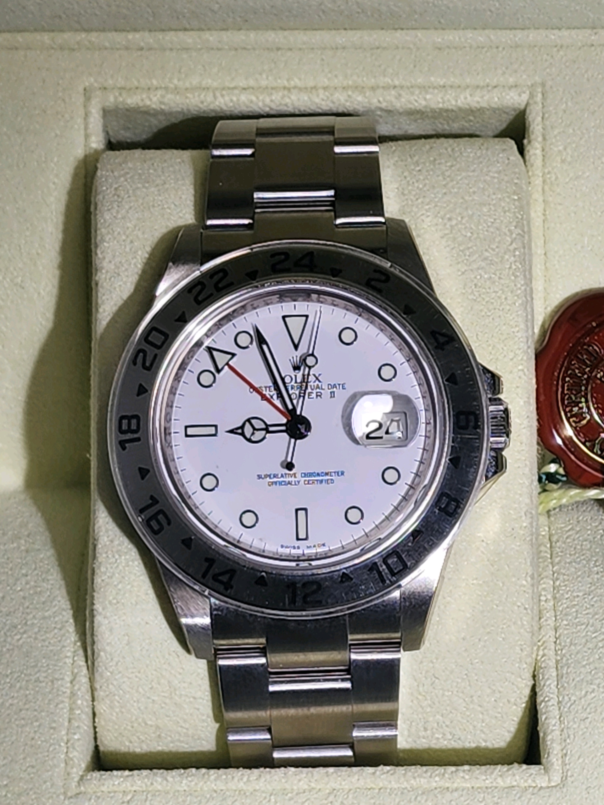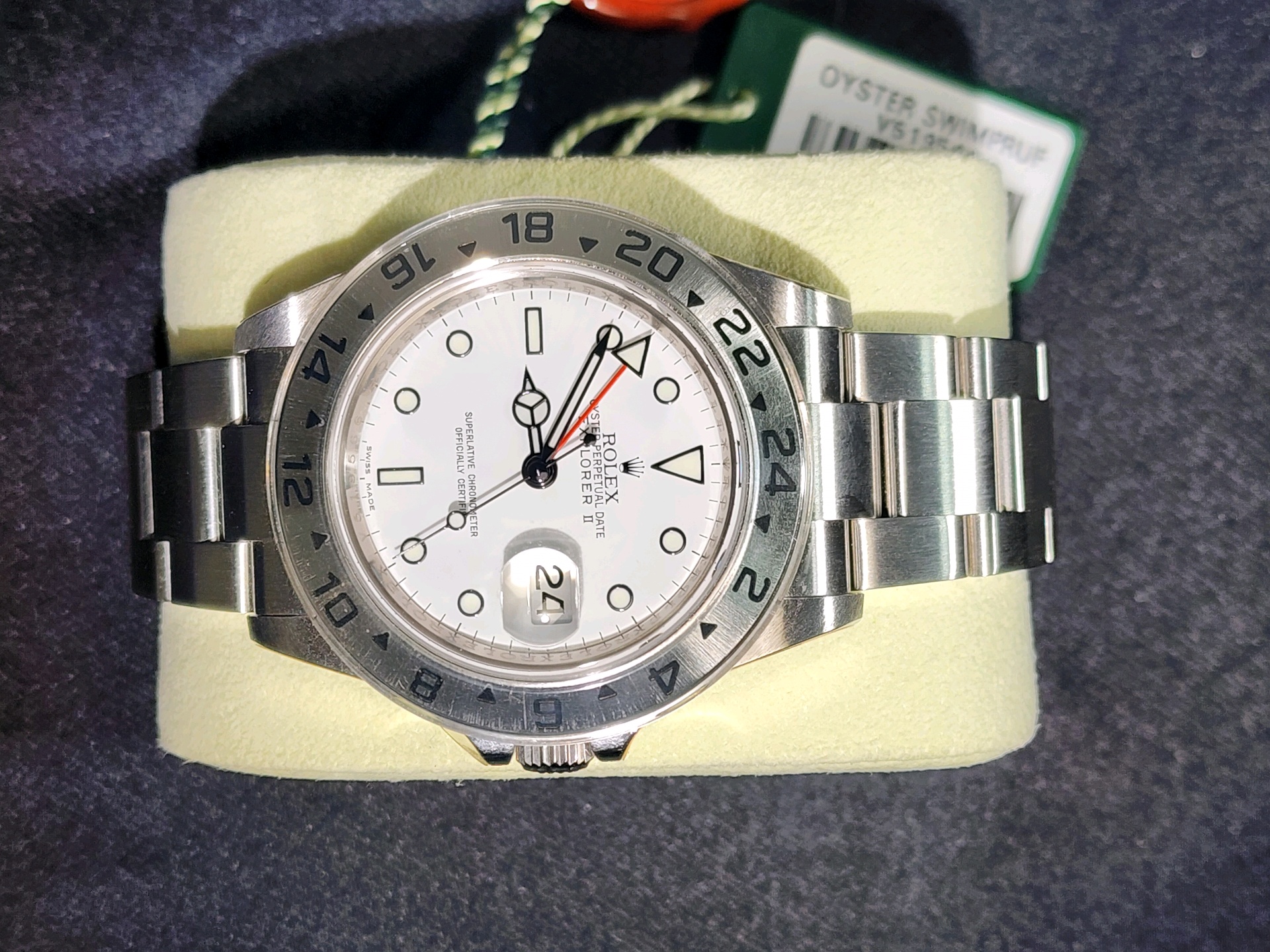 요즘 시장에서 특히 수요가 높은 모델이며, 화이트 폴라 다이얼 + 레드 GMT 핸즈 조합으로 익스2의 가장 인기 있는 구성입니다.