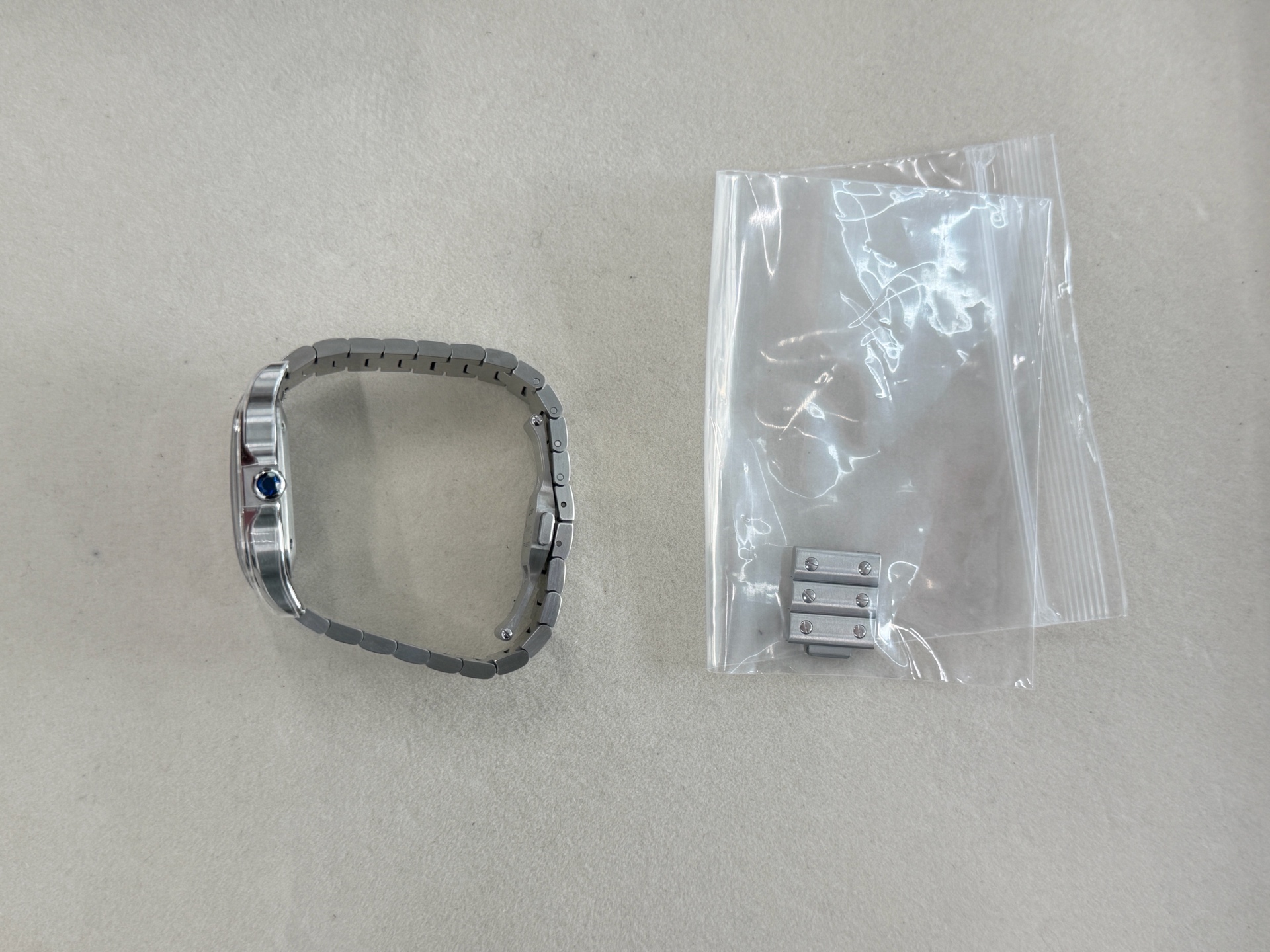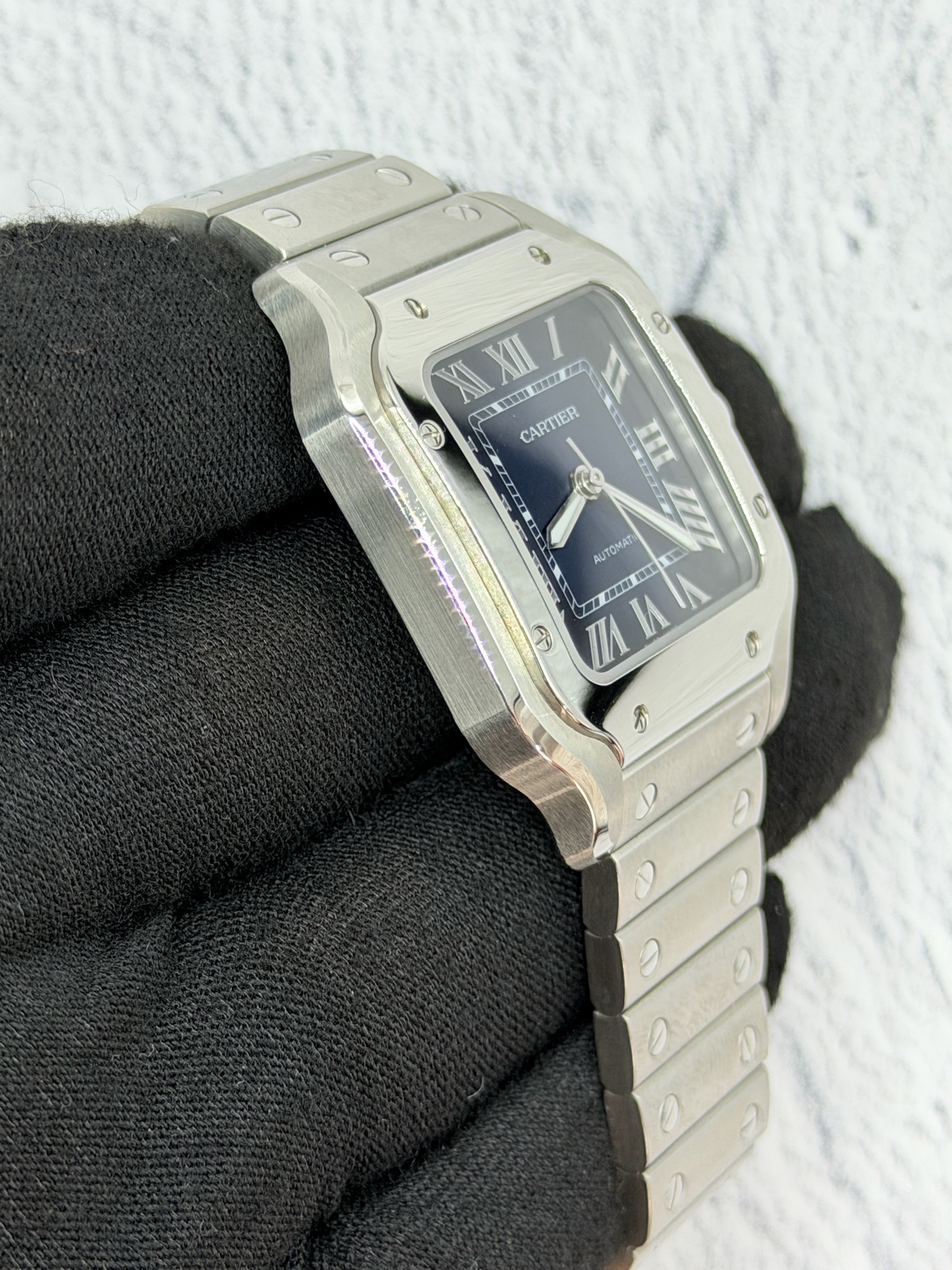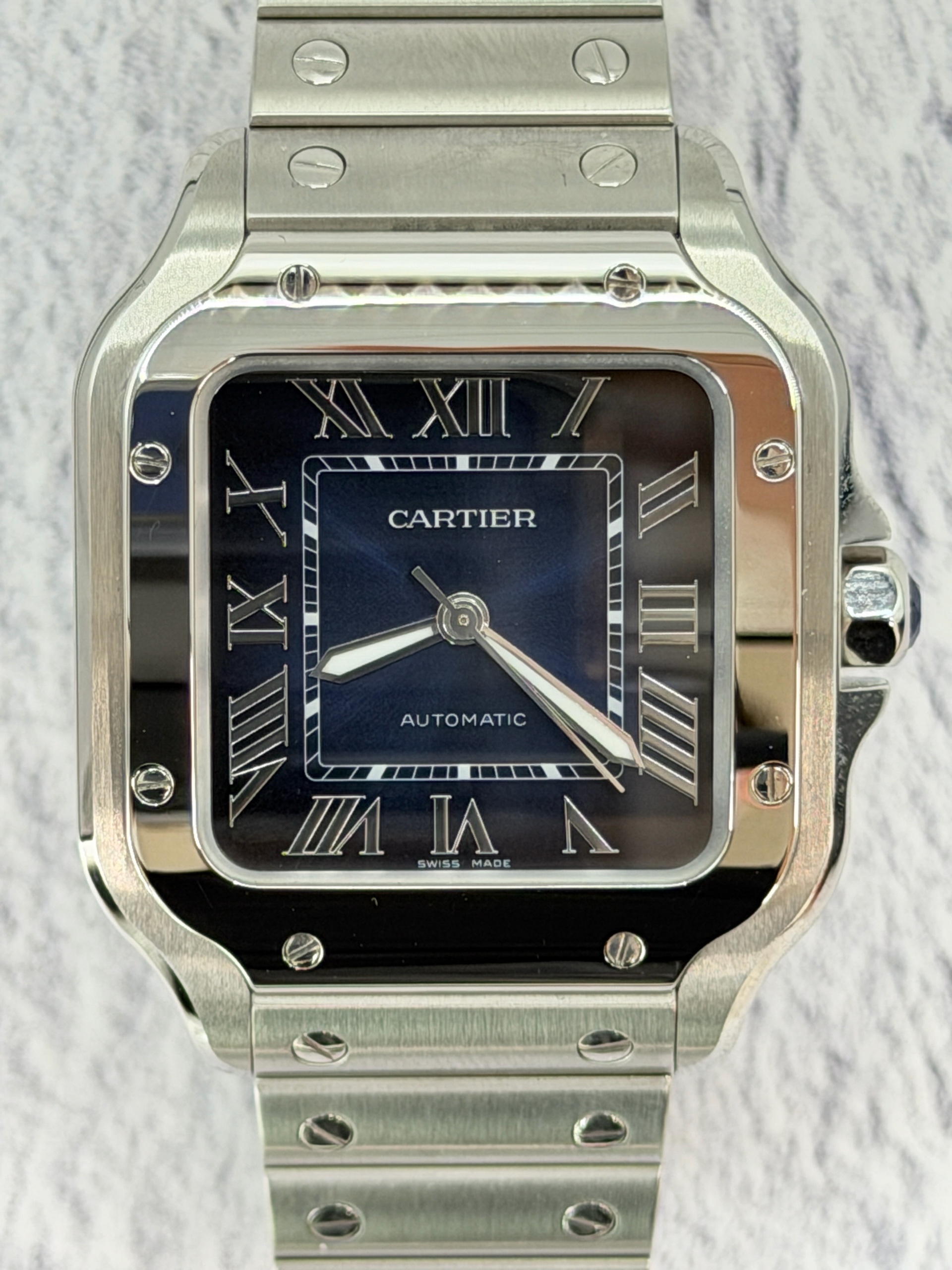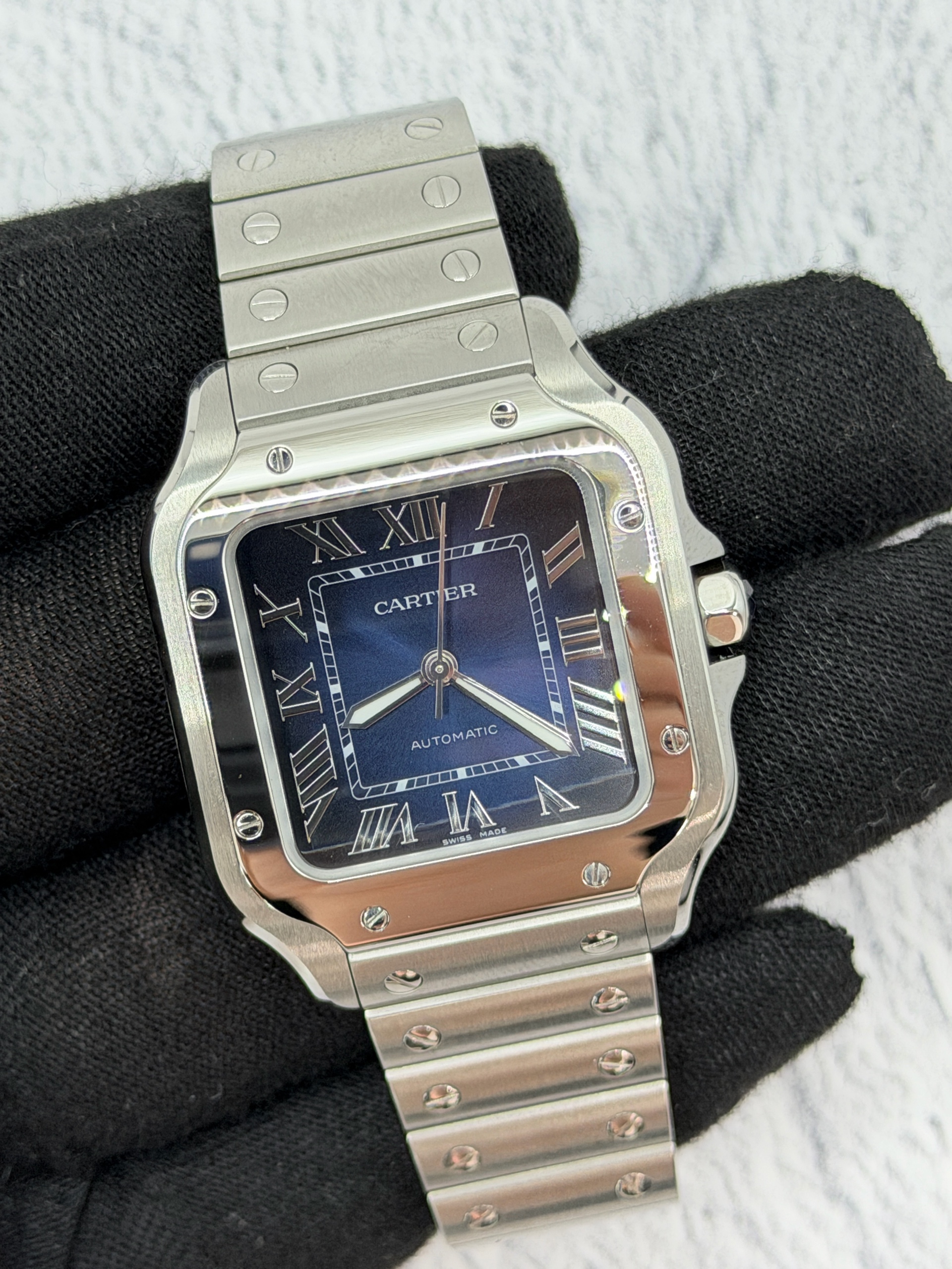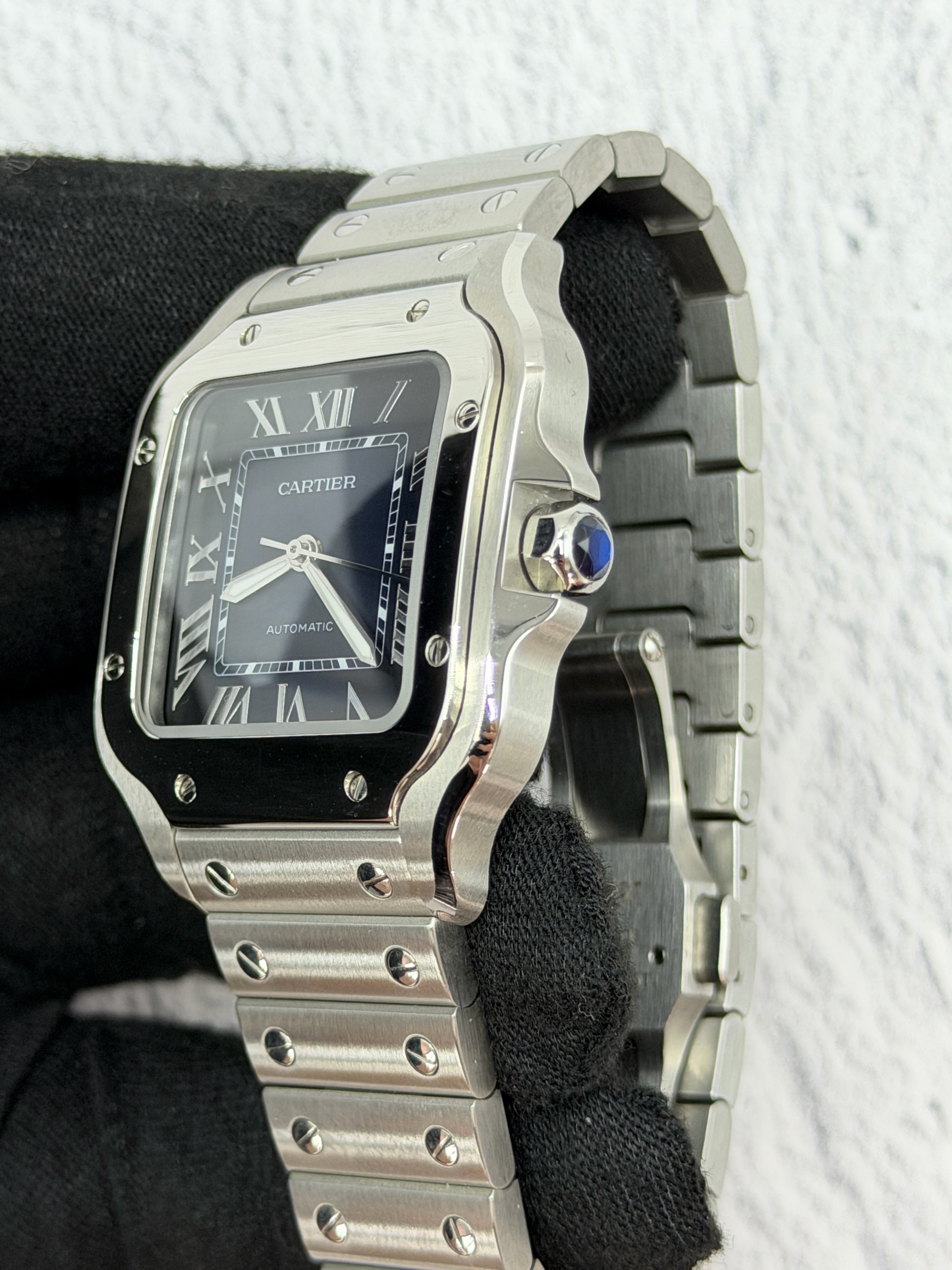 WSSA0063,Cartier Santos Medium MM Blue Steel Automatic Selfwinding WSSA0063,까르띠에 카르띠에 산토스 블루 미디엄 미디움 블루 스틸 오토매틱 셀프와인딩 WSSA0063,블루,사파이어 크리스탈,셀프와인딩,Stainless steel + spinel cabochon,Butterfly clasp,Date / roman numeral indices,Santos MM,Santos de Cartier,Cartier,까르띠에,까르띠에 산토스 MM 미디엄 미디움 블루,산토스 MM,셀프 와인딩,Santos de Cartier MM,Stainless steel + spinel,.블루,로만,폴딩 클라스프,직사각형,클래식,남녀공용