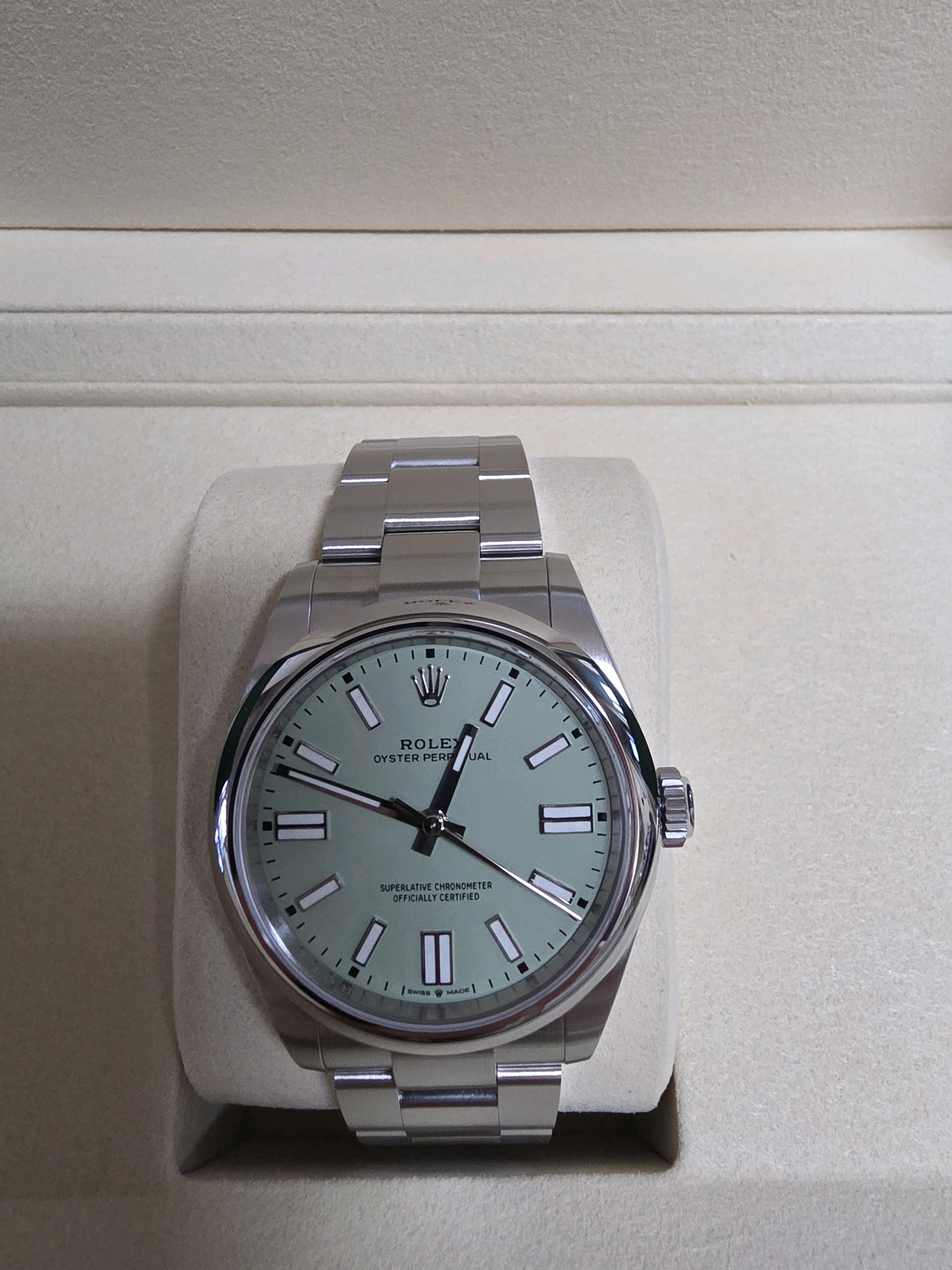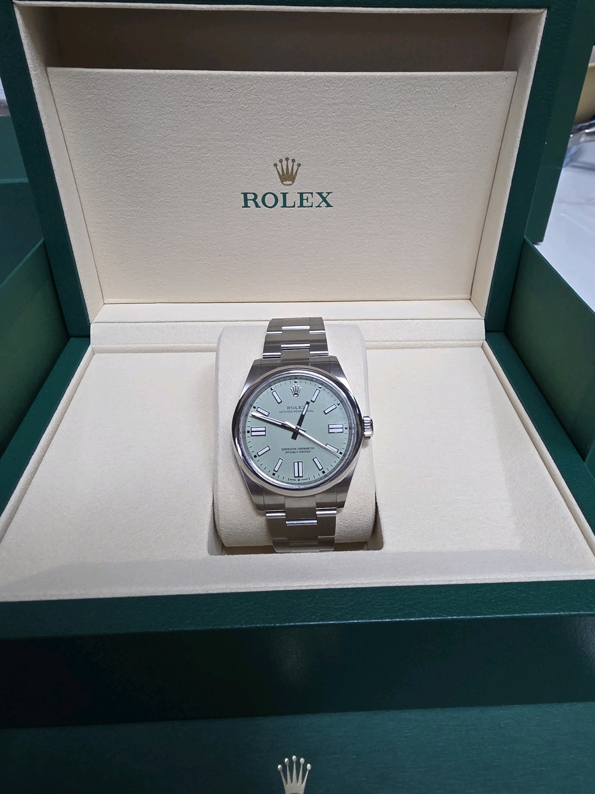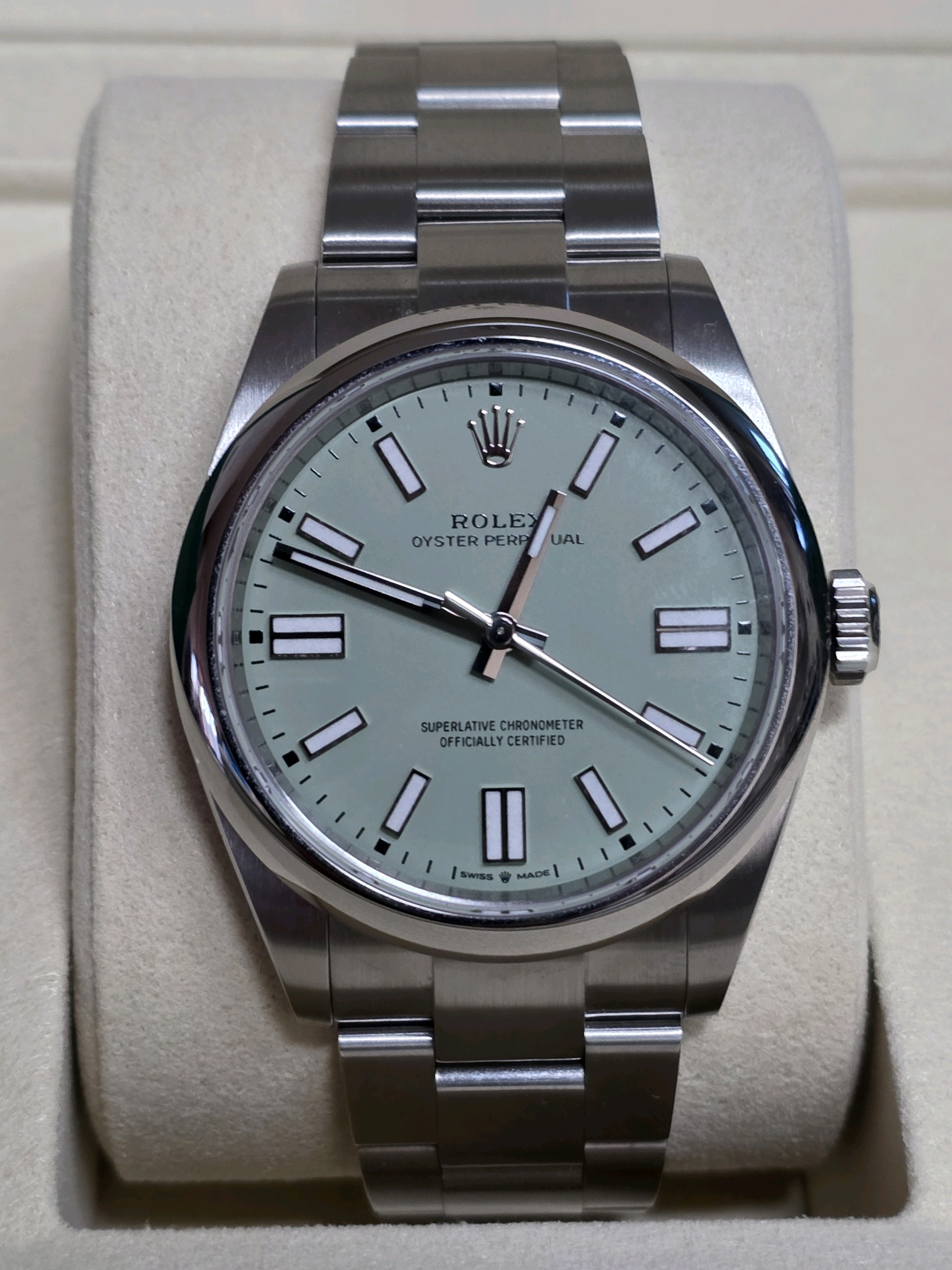 M134300-0006,134300,Rolex Oyster Perpetual OP 41 pistachio green 41mm 134300,롤렉스 로렉스 오이스터 퍼페추얼 퍼페츄얼 오피 op 41 피스타치오 그린 초록 41mm 134300,피스타치오-그린,스테인리스 스틸,오이스터 브레이슬릿,41mm,돔드,셀프 와인딩,Cal.3230,Stainless steel,Folding clasp,Baton indices,Oyster Perpetual 41,오이스터 퍼페츄얼 41,Oyster Perpetual,Rolex,롤렉스,남성,예물,웨딩,.그린,바,폴딩 클라스프,약 21mm,원형,클래식,남성용,피스타치오