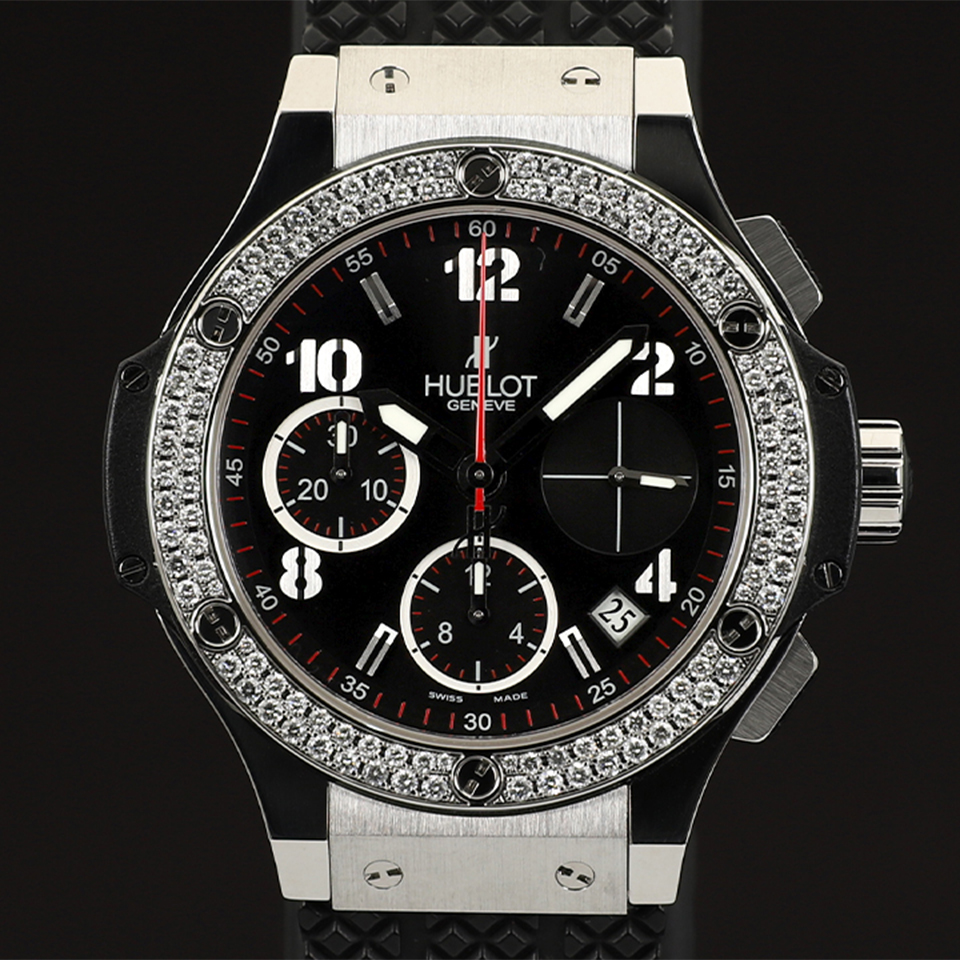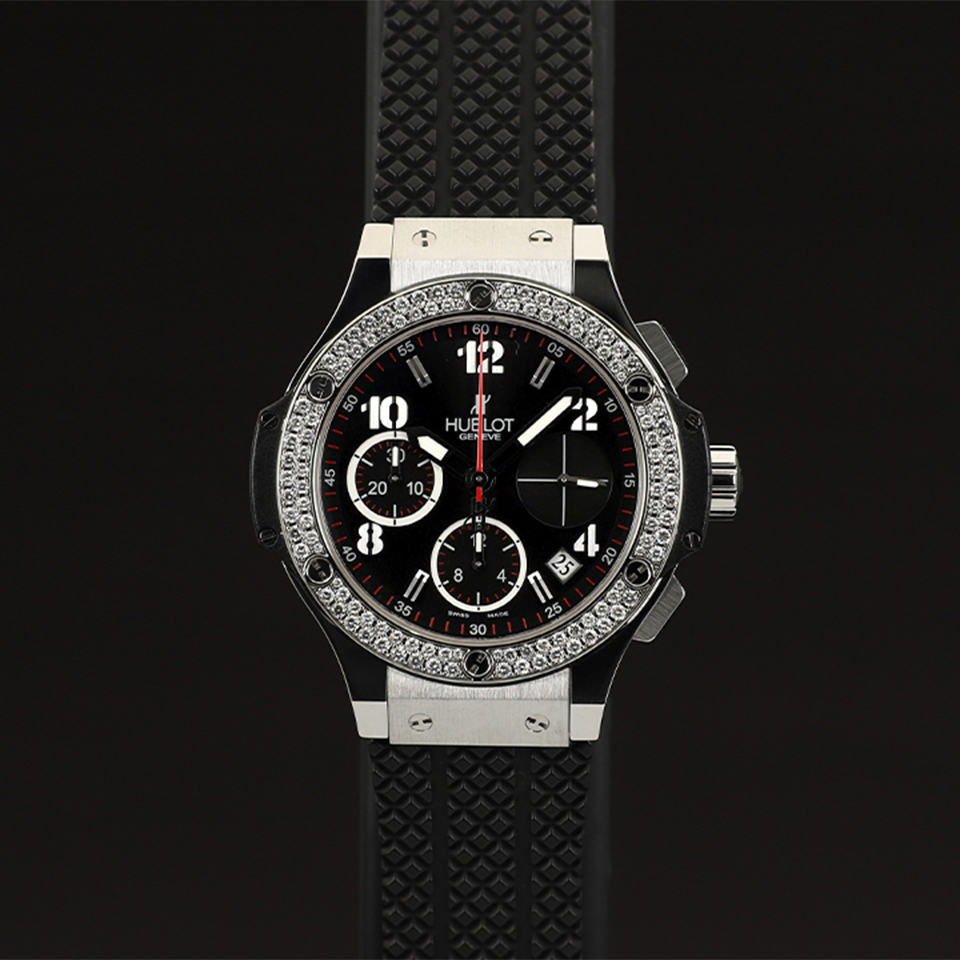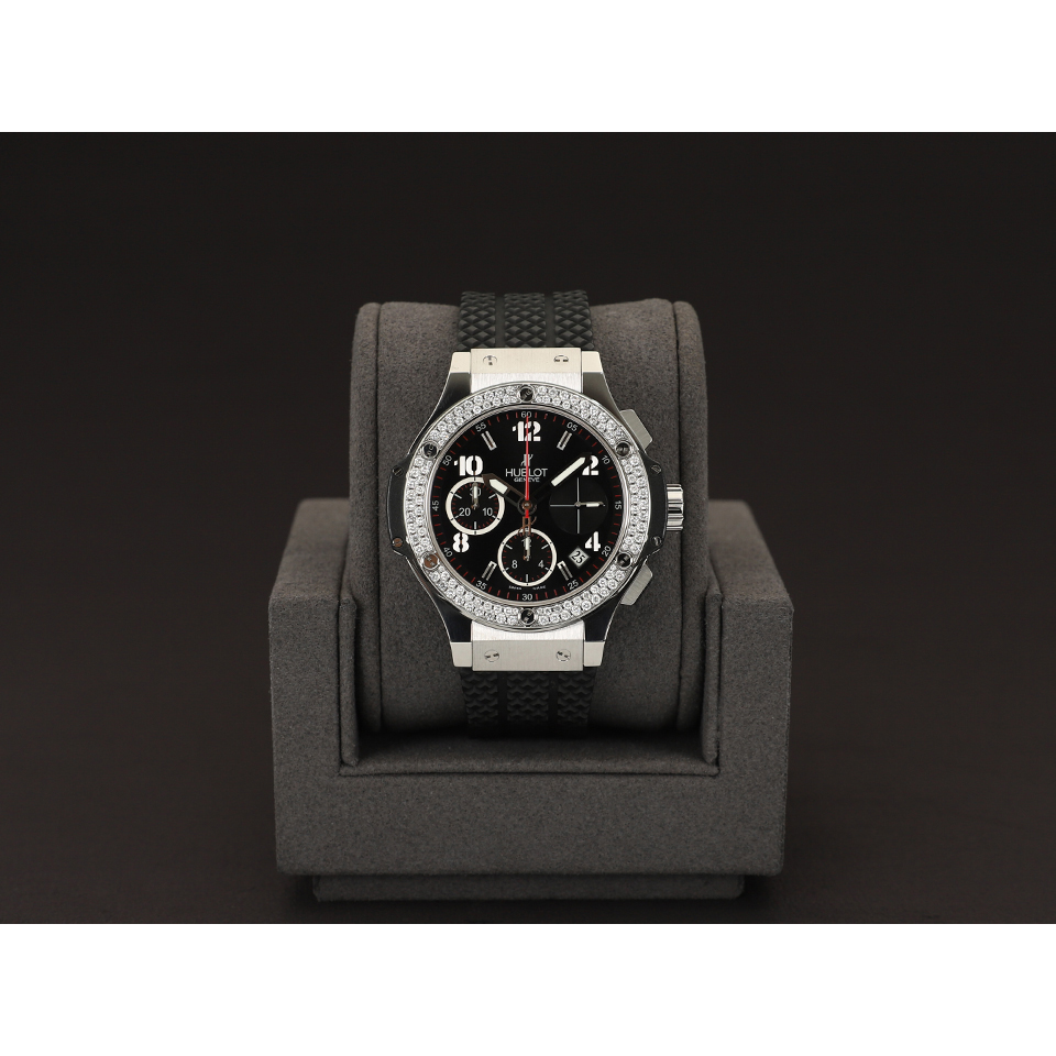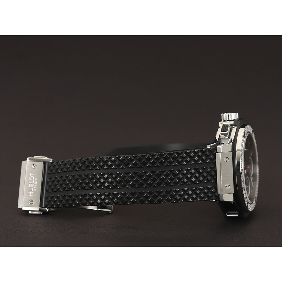 위블로 빅뱅 크로노 크로노그래프 스틸 베젤 다이아 다이아몬드 베젤,342.SX.130.RX.114,블랙,스테인리스 스틸,러버,스트랩,41mm,다이아몬드 세팅,셀프 와인딩,Cal. HUB1145,Switzerland,Stainless steel,Deployant folding clasp,Date,chronograph subdials,small seconds / applied arabic numerals & baton indices,Big Bang Chronograph Steel Diamonds,빅뱅 크로노그래프 스틸 다이아몬드,Big Bang,Hublot,위블로,투명 케이스백,Date, chronograph subdials, small seconds / applied arabic numerals & baton indices