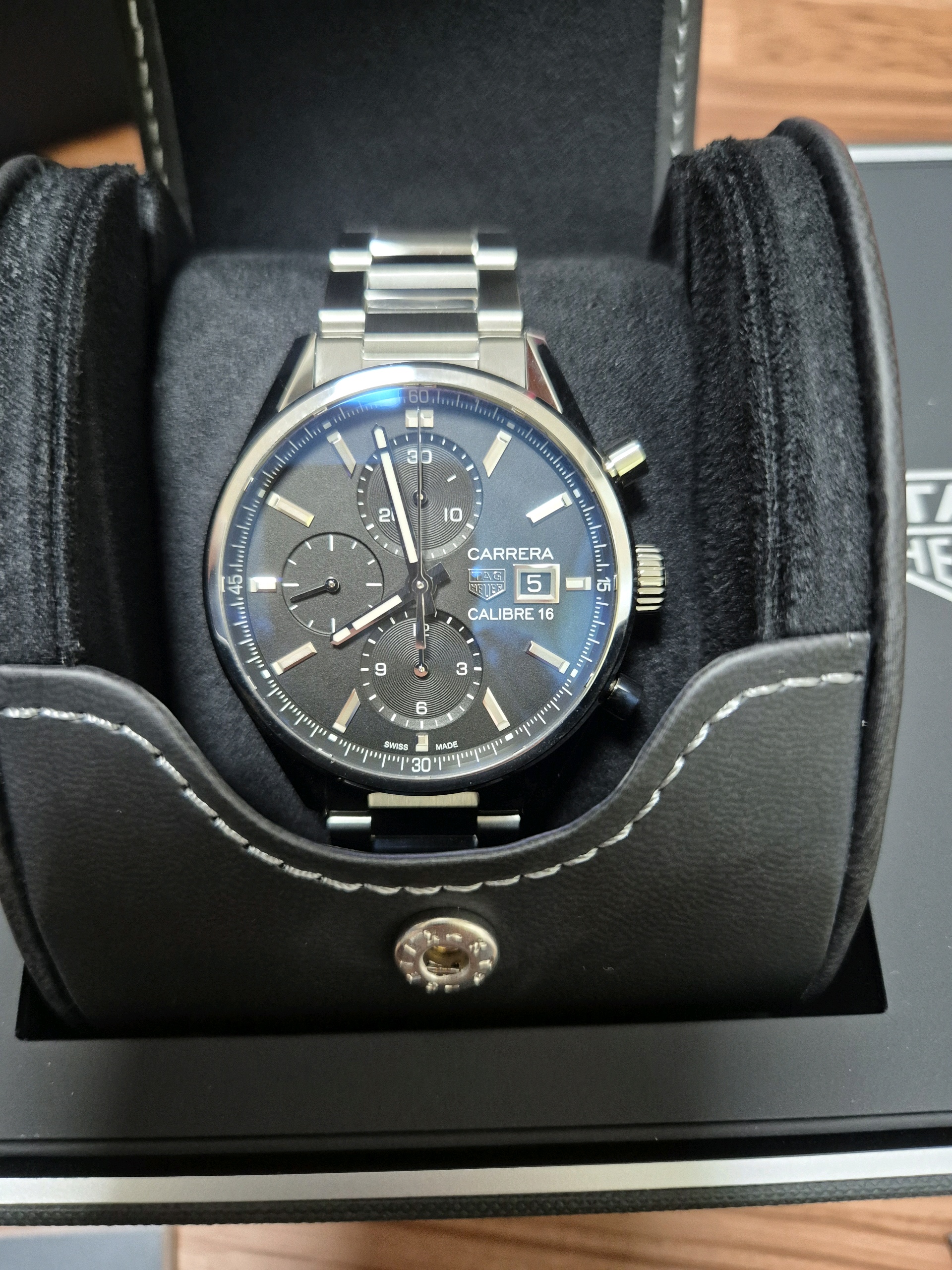 TAG Heuer Carrera Chronograph Calibre 16,태그호이어 까레라 크로노그래프 칼리버 16,태그호이어 까레라 크로노그래프 스틸 41,태그호이어 까레라 크로노그래프 41 스틸 브레이슬릿,태그호이어 까레라 칼리버 16 크로노그래프,태그호이어 까레라 칼리버 16 블랙,CBK2110.BA0715,블랙,사파이어 크리스탈,41mm,셀프 와인딩,Stainless steel,Push-button folding clasp,Date, chronograph subdials, small seconds / applied hour markers,Hour + minute + small seconds + chronograph,Carrera Chronograph Calibre 16,까레라 크로노그래프 칼리버 16,Carrera,TAG Heuer,태그 호이어