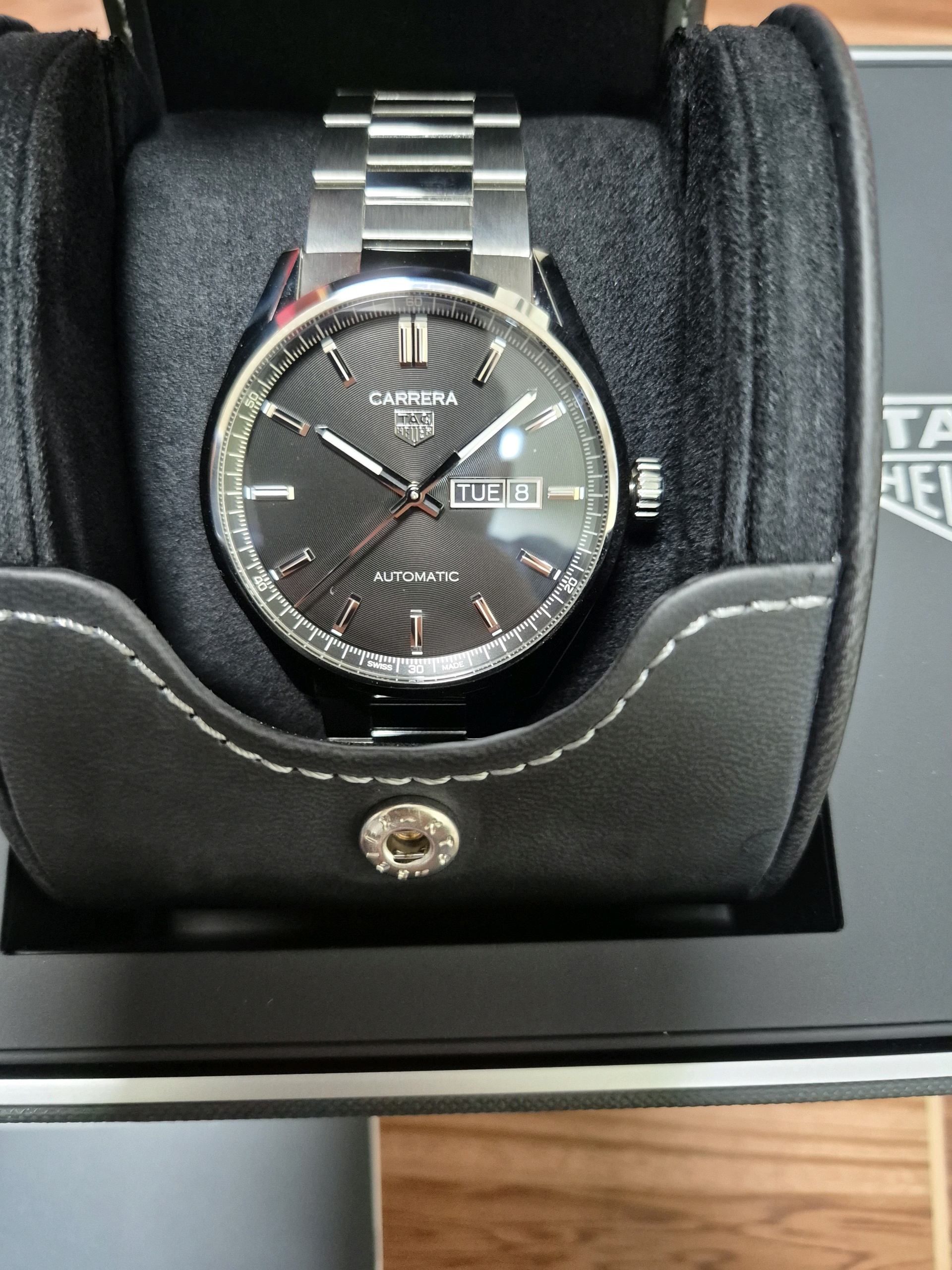 TAG Heuer Carrera Calibre 5 Day Date 41,태그호이어 까레라 칼리버 5 데이데이트 41,태그호이어 까레라 데이데이트 스틸,태그호이어 까레라 데이데이트 41 오토매틱,태그호이어 까레라 스틸 데이데이트 브레이슬릿,태그호이어 까레라 스틸 데이데이트 블랙 검판,TAG Heuer Carrera Day Date Black,WBN2010.BA0640,블랙,사파이어 크리스탈,41mm,셀프 와인딩,Stainless steel,Push-button folding clasp,Day-date / applied baton indices,Hour + minute + seconds,Carrera Calibre 5 Day Date 41,까레라 칼리버 5 데이데이트 41,Carrera,TAG Heuer,태그 호이어
