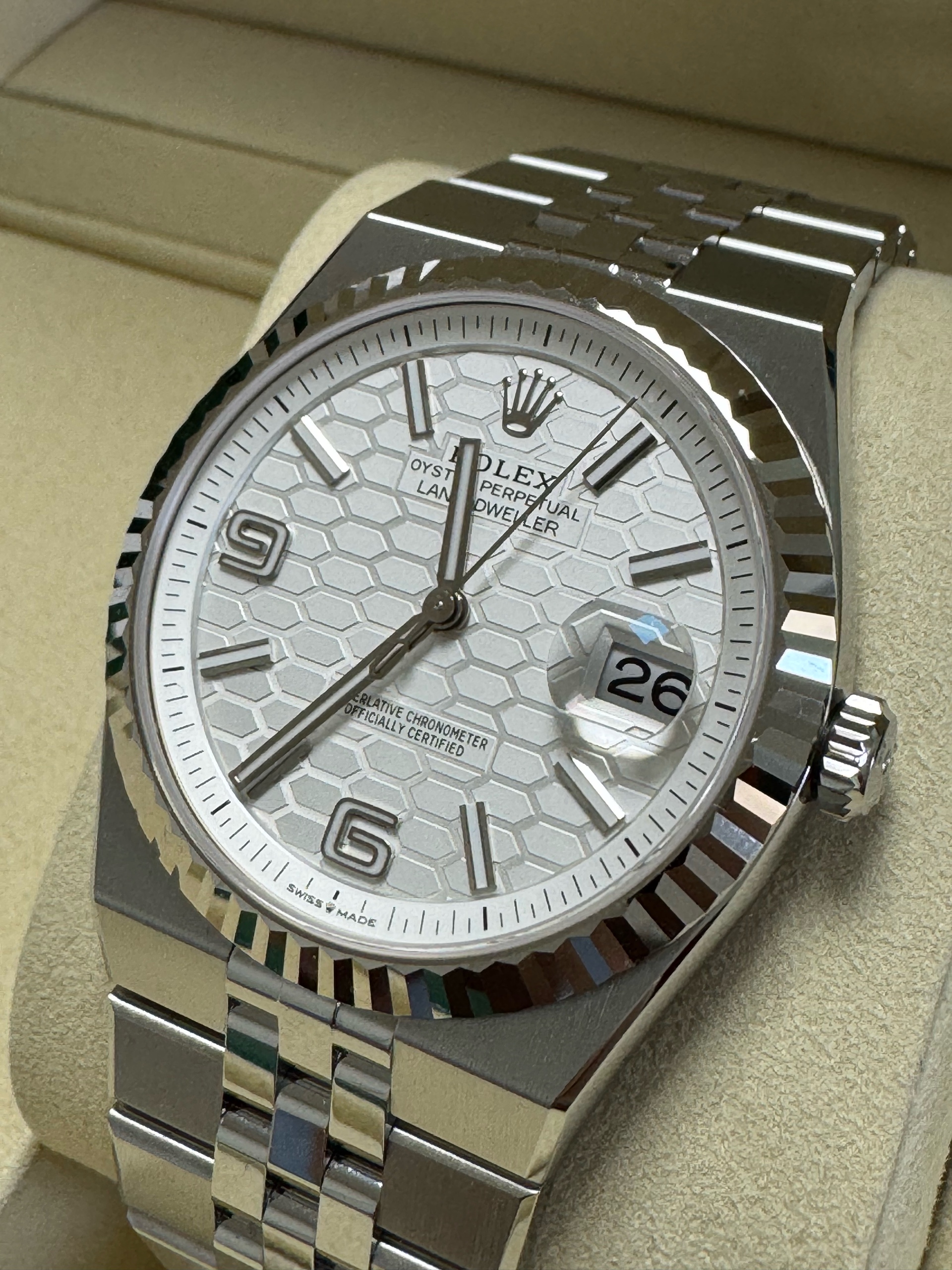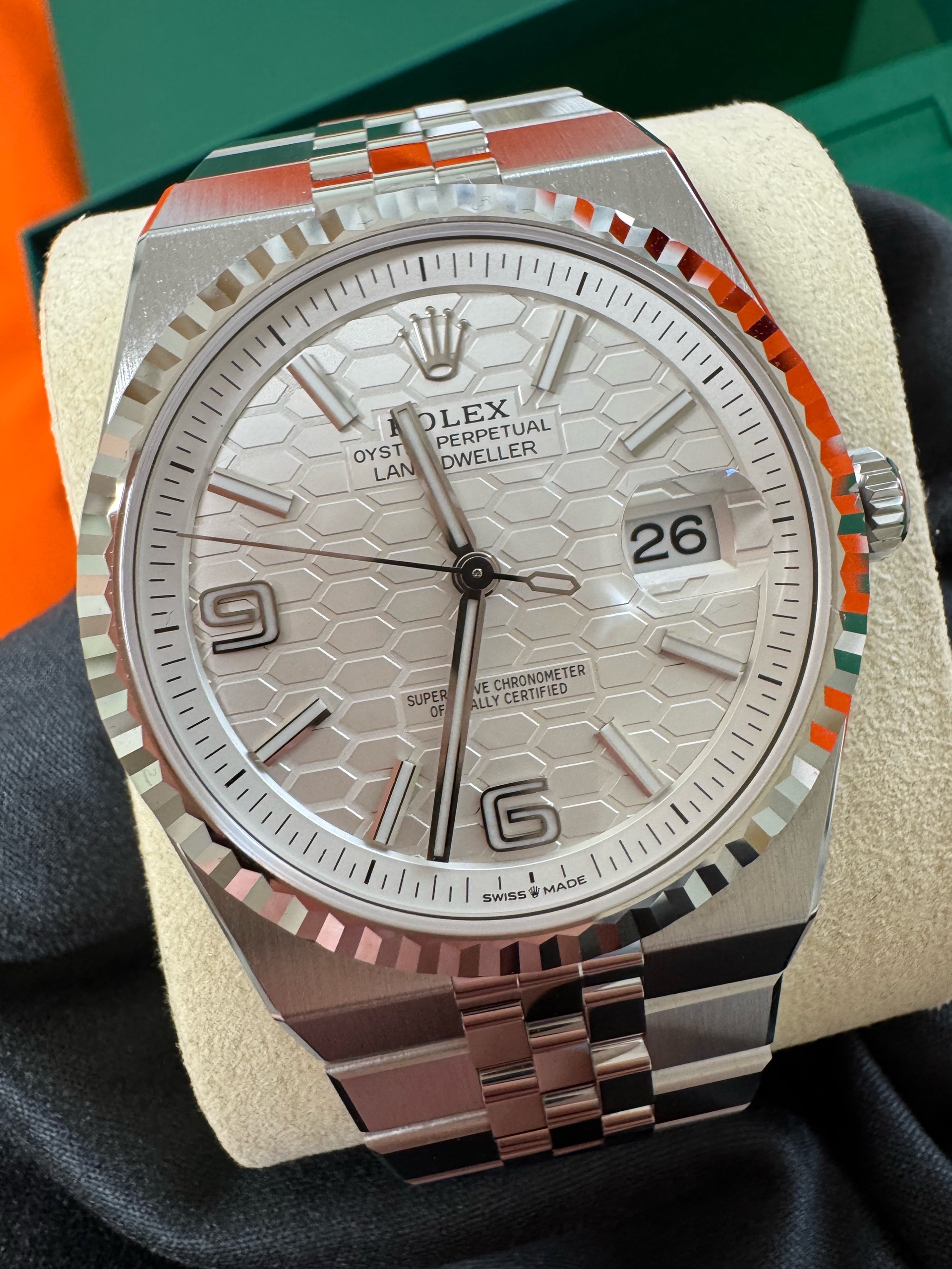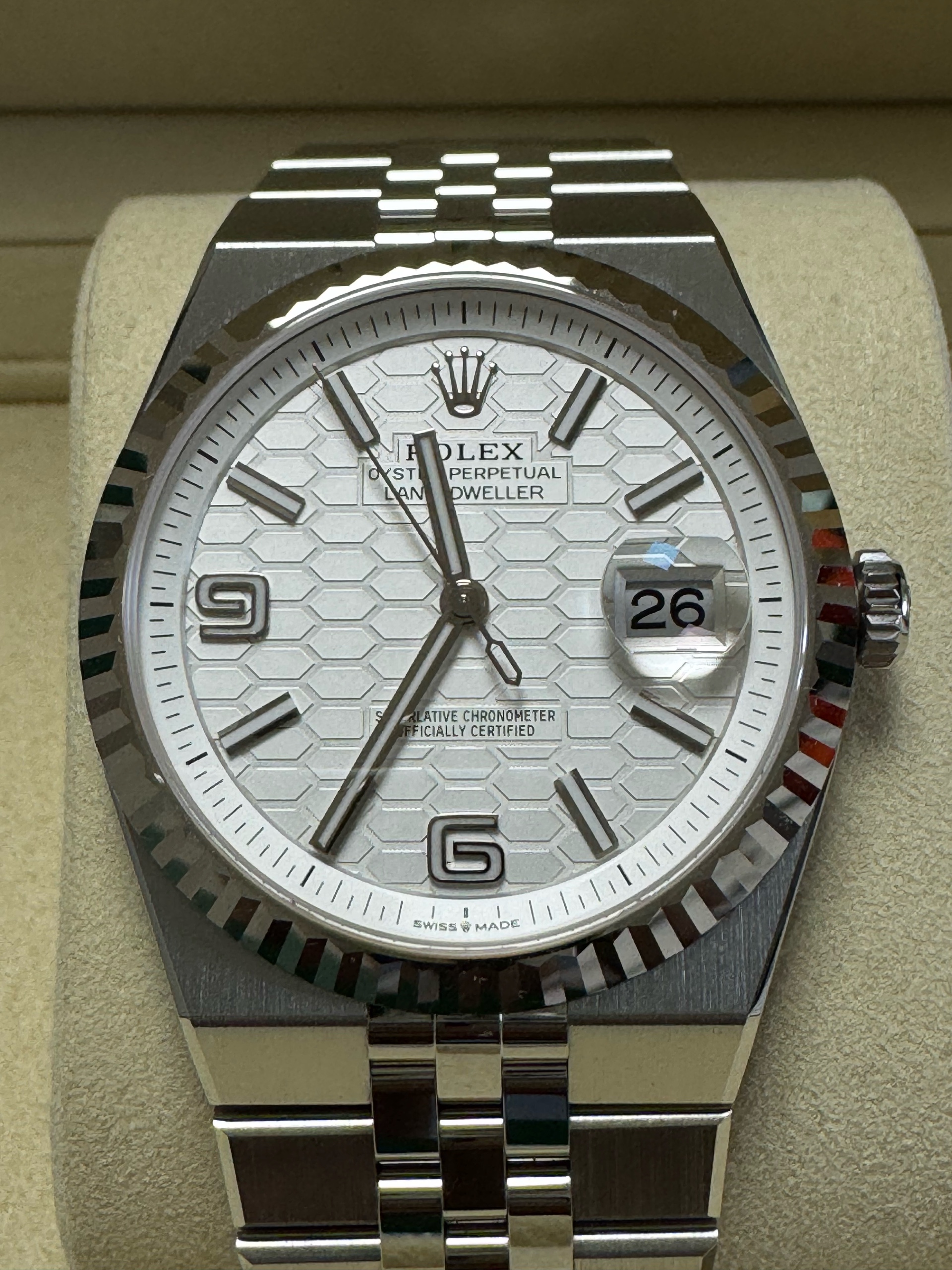 M127334-0001,127334,Rolex Land-Dweller land dweller 40 steel intense white steel,롤렉스 랜드드웰러 랜드 드웰러 랜드-드웰러 40 스틸 인텐스 화이트 스틸,롤렉스 일체형,인텐스 화이트,허니콤 모티프,스테인리스 스틸,화이트 골드,플랫 쥬빌리 브레이슬릿,40mm,플루티드,셀프 와인딩,Cal.7135,Stainless steel,Hidden folding clasp,Date / baton & arabic numeral indices,Land-Dweller 40,랜드‑드웰러 40,Land-Dweller,Rolex,롤렉스,Cal. 7135,.화이트,바,패턴,폴딩 클라스프,데이트,투명 케이스백,원형,클래식,남성용,스테인리스 스틸, 화이트 골드