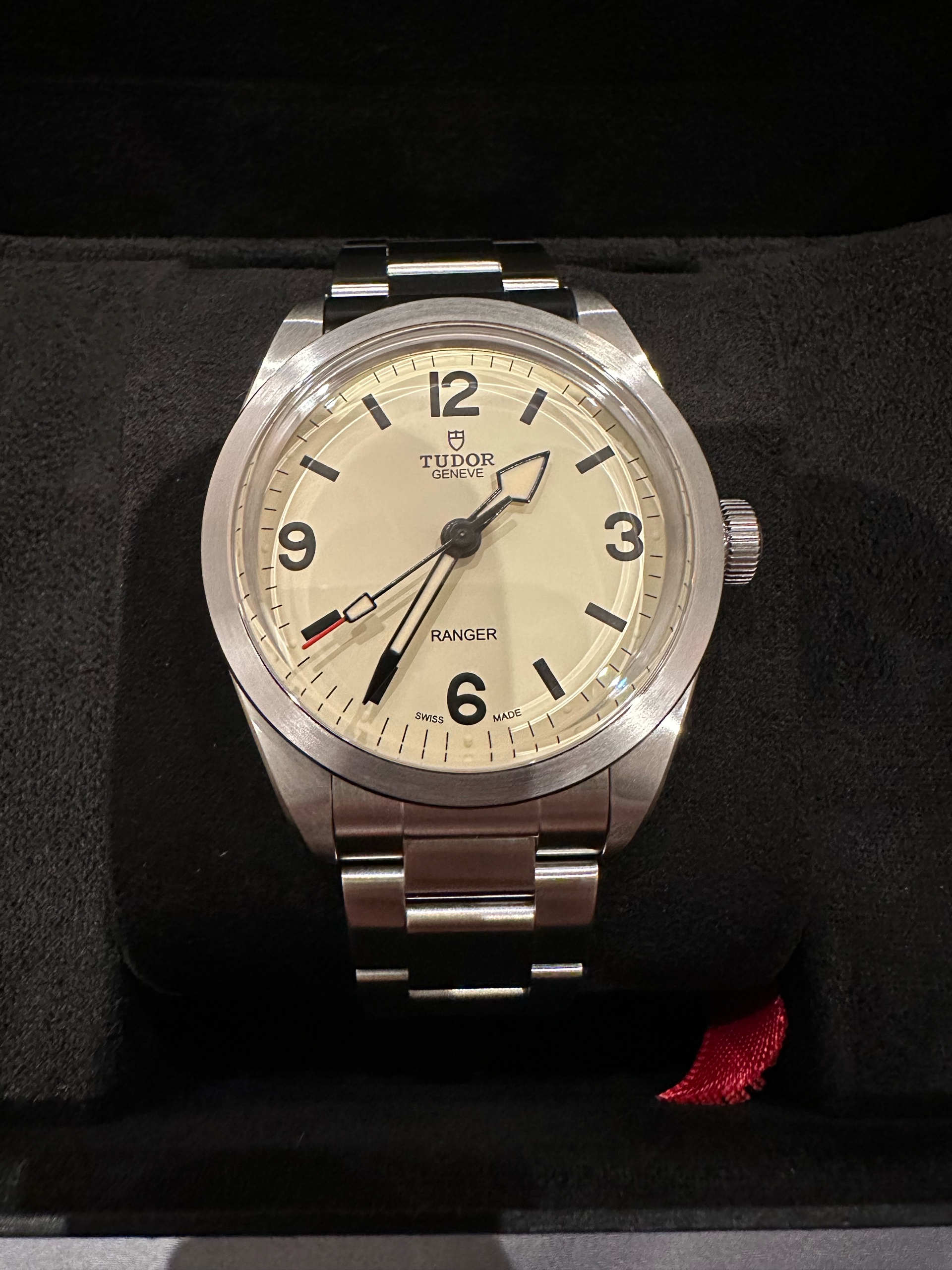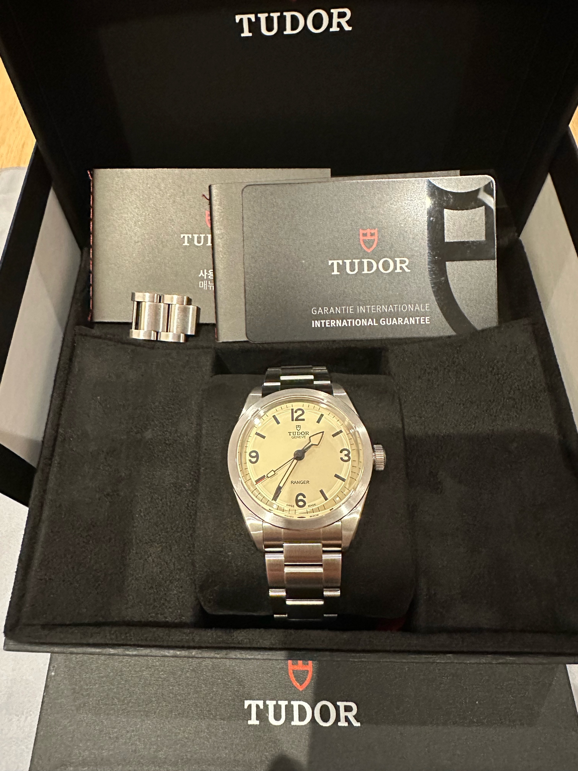 튜더 레인저 레인져 9950 39 듄 화이트 베이지 크림 39 브레이슬릿,Tudor Ranger 39 9950 beige 39 bracelet,M79950-0008,베이지,스테인리스 스틸,39mm,스무스,셀프 와인딩,Cal. MT5402,Switzerland,Stainless steel,Folding clasp,Arabic numerals & baton indices,Ranger,레인저,Tudor,튜더